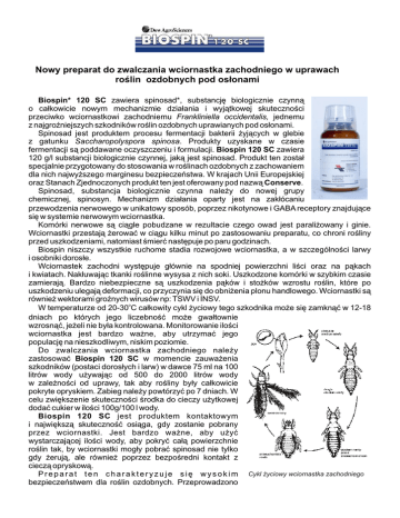 Nowy preparat do zwalczania wciornastka zachodniego w uprawach roœlin ozdobnych pod os³onami Biospin* 120 SC zawiera spinosad*, substancjê biologicznie czynn¹ o ca³kowicie nowym mechanizmie dzia³ania i wyj¹tkowej skutecznoœci przeciwko wciornastkowi zachodniemu Frankliniella occidentalis, jednemu z najgroŸniejszych szkodników roœlin ozdobnych uprawianych pod os³onami. Spinosad jest produktem procesu fermentacji bakterii ¿yj¹cych w glebie z gatunku Saccharopolyspora spinosa. Produkty uzyskane w czasie fermentacji s¹ poddawane oczyszczeniu i formulacji. Biospin 120 SC zawiera 120 g/l substancji biologicznie czynnej, jak¹ jest spinosad. Produkt ten zosta³ specjalnie przygotowany do stosowania w roœlinach ozdobnych z zachowaniem dla nich najwy¿szego marginesu bezpieczeñstwa. W krajach Unii Europejskiej oraz Stanach Zjednoczonych produkt ten jest oferowany pod nazw¹ Conserve. Spinosad, substancja biologicznie czynna nale¿y do nowej grupy chemicznej, spinosyn. Mechanizm dzia³ania oparty jest na zak³ócaniu przewodzenia nerwowego w unikatowy sposób, poprzez nikotynowe i GABA receptory znajduj¹ce siê w systemie nerwowym wciornastka. Komórki nerwowe s¹ ci¹gle pobudzane w rezultacie czego owad jest parali¿owany i ginie. Wciornastki przestaj¹ ¿erowaæ w ci¹gu kilku minut po zastosowaniu preparatu, co chroni roœliny przed uszkodzeniami, natomiast œmieræ nastêpuje po paru godzinach. Biospin niszczy wszystkie ruchome stadia rozwojowe wciornastka, a w szczególnoœci larwy i osobniki doros³e. Wciornastek zachodni wystêpuje g³ównie na spodniej powierzchni liœci oraz na p¹kach i kwiatach. Nak³uwaj¹c tkanki roœlinne wysysa z nich soki. Uszkodzone komórki w szybkim czasie zamieraj¹. Bardzo niebezpieczne s¹ uszkodzenia p¹ków i sto¿ków wzrostu roœlin, które po uszkodzeniu ulegaj¹ deformacji, co przyczynia siê do obni¿enia plonu handlowego. Wciornastki s¹ równie¿ wektorami groŸnych wirusów np: TSWV i INSV. o W temperaturze od 20-30 C ca³kowity cykl ¿yciowy tego szkodnika mo¿e siê zamkn¹æ w 12-18 dniach po których jego liczebnoœæ mo¿e gwa³townie wzrosn¹æ, je¿eli nie by³a kontrolowana. Monitorowanie iloœci wciornastka jest bardzo wa¿ne, aby utrzymaæ jego populacjê na nieszkodliwym, niskim poziomie. Do zwalczania wciornastka zachodniego nale¿y zastosowaæ Biospin 120 SC w momencie zauwa¿enia szkodników (postaci doros³ych i larw) w dawce 75 ml na 100 litrów wody u¿ywaj¹c od 500 do 2000 litrów wody w zale¿noœci od uprawy, tak aby roœliny by³y ca³kowicie pokryte opryskiem. Zabieg nale¿y powtórzyæ po 7 dniach. W celu zwiêkszenie skutecznoœci œrodka do cieczy u¿ytkowej dodaæ cukier w iloœci 100g/100 l wody. Biospin 120 SC jest produktem kontaktowym i najwiêksz¹ skutecznoœæ osi¹ga, gdy zostanie pobrany przez wciornastki. Jest bardzo wa¿ne, aby u¿yæ wystarczaj¹cej iloœci wody, aby pokryæ ca³¹ powierzchnie roœlin tak, by wciornastki mog³y pobraæ spinosad nie tylko gdy ¿eruj¹, ale równie¿ poprzez bezpoœredni kontakt z ciecz¹ opryskow¹. P r e p a r a t t e n c h a r a k t e r y z u j e s i ê w y s o k i m Cykl ¿yciowy wciornastka zachodniego bezpieczeñstwem dla roœlin ozdobnych. Przeprowadzono wiele doœwiadczeñ na ogromnej liczbie gatunków roœlin uprawianych w ca³ej Europie, jak równie¿ Stanach Zjednoczonych, gdzie preparat jest stosowany od 1997 roku. Biospin 120 SC jest bezpieczny dla roœlin w ró¿nych fazach rozwojowych. Na jego bezpieczeñstwo równie¿ nie maj¹ wp³ywu zmieniaj¹ce siê warunki naœwietlenia, jednak¿e dobra praktyka ogrodnicza nakazuje, aby nie stosowaæ ¿adnych œrodków ochrony roœlin w warunkach bardzo wysokiego nas³onecznienia oraz gdy kwiaty s¹ otwarte. Wieloletnie doœwiadczenia prowadzone na ca³ym œwiecie oraz informacje od ogrodników zarówno z Europy, jak i z Polski, ju¿ po pierwszym sezonie stosowania wskazuj¹, ¿e jest to obecnie najskuteczniejszy produkt do zwalczania wciornastka zachodniego oferowany na rynku. Biospin 120 SC jest równie¿ bardzo bezpieczny dla œrodowiska naturalnego. Substancja biologicznie czynna spinosad, nie jest gromadzona w glebie ale bardzo szybko rozk³adana. Spinosad zosta³ zaklasyfikowany przez Œwiatow¹ Organizacjê Zdrowia (WHO) jako nieszkodliwy insektycyd dla ludzi wykonuj¹cych nim zabiegi. Wykorzystanie Biospinu 120 SC w Integrowanych Programach Ochrony Biospin 120 SC jest idealnym produktem do wykorzystania go jako czêœæ sk³adowa integrowanego programu ochrony roœlin. Preparat jest bezpieczny dla wielu drapie¿ców szkodników i przêdziorków mog¹cych byæ wykorzystywanych w biologicznej ochronie. W tabeli poni¿ej zawarte s¹ informacje na temat dzia³ania Biospinu 120 SC na owady wykorzystywane w programach IPO. Drapie¿ca Amblyseius californicus Amblyseius cucumeris Aphelinus abdominalis Aphidius colemani Aphidius ervi Aphidoletes aphidomyza Chilocorus nigritus Chrysoperla carnea Cryptolaemus montrouzieri Dacnusa sibirica Didlyphus isaea Encarsia formosa Eretmocerus eremicus Feltiella acarisuga Uwagi 1 1 2 2 2 1 2 1 3 2 2 2 3 3 Drapie¿ca Heterorhabditis megidis Hypoaspis aculeifer Hypoaspis miles Leptomastix dactylopi Leptomastix epona Metaphycus helvolus Orius laevigatus Orius majusculus Phytoseiulus persimilis Steinernema carpocapsae Steinernema feltiae Steinernema feltiae Steinernema feltiae Trichogramma evanescens Uwagi 3 1 1 2 2 2 1 1 1 3 3 3 3 2 1. Drapie¿cy mog¹ byæ introdukowani w dniu zastosowania preparatu, kiedy oprysk wyschnie. Liczba drapie¿ców mo¿e zostaæ czêœciowo zredukowana gdy znajdowa³y siê na roœlinach w momencie zabiegu. 2. Nale¿y odczekaæ tydzieñ czasu po zabiegu zanim zostan¹ introdukowane owady po¿yteczne. 3. Nie testowano. * zastrze¿ona nazwa Dow AgroSciences LLC Dow AgroSciences Polska Sp. z o.o. Krasickiego 53 02-608 Warszawa tel. 022 854 03 20