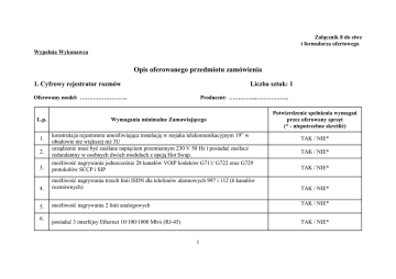 Załącznik 8 do siwz i formularza ofertowego Wypełnia Wykonawca Opis oferowanego przedmiotu zamówienia 1. Cyfrowy rejestrator rozmów Liczba sztuk: 1 Oferowany model: …………………….. L.p. Producent: …………....………….….. Wymagania minimalne Zamawiającego Potwierdzenie spełnienia wymagań przez oferowany sprzęt (* - niepotrzebne skreślić) 3. konstrukcja rejestratora umożliwiająca instalację w stojaku telekomunikacyjnym 19” w obudowie nie większej niż 3U urządzenie musi być zasilane napięciem przemiennym 230 V 50 Hz i posiadać zasilacz redundantny w osobnych dwóch modułach z opcją Hot Swap. możliwość nagrywania jednocześnie 28 kanałów VOIP kodeków G711/ G722 oraz G729 protokołów SCCP i SIP 4. możliwość nagrywania trzech linii ISDN dla telefonów alarmowych 997 i 112 (6 kanałów rozmównych) TAK / NIE* 5. możliwość nagrywania 2 linii analogowych TAK / NIE* posiadać 3 interfejsy Ethernet 10/100/1000 Mb/s (RJ-45) TAK / NIE* 1. 2. 6. 1 TAK / NIE* TAK / NIE* TAK / NIE* 7. 8. 9. 10. 11. 12. nagrywania rozmów z systemu telefonicznego opartego o wykorzystanie Unified Communications Manager (CUCM) z wykorzystaniem funkcjonalności Built-IN-Bridge w wersjach 6 , 7, 8 oraz 9 poprzez integrację SIP-TRUNK (Integracja musi być oparta całkowicie na rozwiązaniu programowym, bez stosowania dodatkowego wyposażenia sprzętowego) wyklucza się stosowanie licencji na rejestrację rozmów w formie jakiegokolwiek klucza sprzętowego (np.: na złączu USB, RS232). Dopuszczalna licencja na nagrywanie rozmów jedynie w formie pliku lub plików umieszczonych w cyfrowym rejestratorze rozmów rejestracja informacji dodatkowych o rozmowie (data i czas rozpoczęcia rozmowy, czas trwania rozmowy, numer wywołujący/wywoływany/osiągnięty (po przekierowaniu) cyfrowy rejestrator rozmów musi posiadać wbudowany w obudowę opisany panel sterowania, który umożliwi poruszanie się po menu celem przeprowadzenia podstawowej konfiguracji adresacji IP cyfrowy rejestrator rozmów ma posiadać wyświetlacz LCD przynajmniej o parametrach 4 x 20 (ilość wierszy x ilość znaków) oraz głośnik, stanowiące lokalny interfejs obsługi urządzenia, który umożliwi dostęp do podstawowych funkcji takich jak: odsłuch nagrań, wyświetlanie informacji o stanie pracy urządzenia (alarmy, temp. HDD, temp. CPU, stopień odbudowy macierzy RAID 1 po awarii),oraz konfigurację interfejsów sieciowych (adres IP, maska, brama sieci) cyfrowy rejestrator rozmów powinien sygnalizować stany awaryjne i przedawaryjne (uszkodzenie dysku, zbliżająca się awaria dysku, zanik synchronizacji z serwerem NTP, awaria lub brak zasilania w danym module, awaria interfejsów sieciowych) lokalnie na rejestratorze (na wyświetlaczu LCD), przez sieć TCP/IP na standardowym komputerze PC ,poprzez złącze alarmowe za pomocą przekaźnika oraz w formie dźwiękowej poprzez głośnik zamontowany w obudowie rejestratora. 2 TAK / NIE* TAK / NIE* TAK / NIE* TAK / NIE* TAK / NIE* TAK / NIE* 13. 14. 15. 16. 17. cyfrowy rejestrator rozmów powinien zapewnić przechowanie co najmniej 20 000 tysięcy godzin rozmów zanim zacznie automatycznie nadpisywać najstarsze zapisy rozmów rejestracja musi się odbywać na dwóch wymiennych nośnikach HDD typu SATA 3,5 cala o tej samej pojemności minimum 1 TB w macierzy RAID 1, w kieszeni „HotSwap” z funkcją automatycznej odbudowy w przypadku czasowego zaniku zasilania, które spowodowałoby wyłączenie cyfrowego rejestratora rozmów, urządzenie winno automatycznie podjąć swoją pracę. (informacja zwrotna o zaistniałym zdarzeniu w postaci alarmu) cyfrowy rejestrator rozmów powinien automatycznie aktualizować czasu z serwera NTP zarządzanie siecią rejestratorów z poziomu dedykowanej aplikacji urządzenia z możliwością monitorowania stanów pracy wszystkich rejestratorów jednocześnie, zdalnego odsłuchu (także w czasie nagrywania aktualnej korespondencji), archiwizacji, przeglądania korespondencji z filtracją oraz opcją wyszukiwania (data i godzina, numer telefonu, numer kanału, adres IP, MAC adres, ostatnio zapisane rozmowy, możliwość ustawienia po zakresie dat, oraz z możliwością parametryzacji opcji wyszukiwania.), Wyklucza się zastosowanie programów typu VNC, protokół RDP znany jako zdalny pulpit. TAK / NIE* TAK / NIE* TAK / NIE* TAK / NIE* TAK / NIE* 18. tworzenie plików wav z pojedynczych rozmów lub ich fragmentów poprzez zastosowanie konwersji pliku TAK / NIE* 19. Archiwizacja zapisów na standardowym komputerze PC do postaci zbiorczego archiwum (bazy nagrań) oraz pojedynczych plików *.wav TAK / NIE* 20. Archiwizacja logów rejestratora na standardowym komputerze PC za pomocą aplikacji do zarządzania rejestratora. 3 TAK / NIE* 21. 22. 23. 24. 25. 26. 27. możliwość wykonywania archiwizacji automatycznie na podstawie wcześniej zdefiniowanego przez administratora harmonogramu wielopoziomowy system autoryzacji i zabezpieczeń (zakładanie i usuwanie indywidualnych kont dla użytkowników, nadawanie im odpowiednich uprawnień, edycja uprawnień przez administratora urządzenia) Cyfrowy rejestrator rozmów powinien sygnalizować próby nieautoryzowanego dostępu do urządzenia w postaci odpowiedniego wpisu w pliki log. brak możliwości kasowania nagrań, edycji bazy danych rozmów oraz logów rejestratora przez użytkowników, osoby nieuprawnione oraz administratora, logi cyfrowego rejestratora rozmów winne być automatycznie nadpisywane po 180 dniach. system operacyjny zainstalowany i uruchamiany z oddzielnego dysku twardego lub dysku flash na złączu SATA. zapasowy dysk twardy lub dysk flash z w pełni skonfigurowanym systemem operacyjnym (dopuszcza się zastosowanie licencji czasowej zapewniającej pełną funkcjonalność rejestratora do czasu otrzymania właściwej licencji jednak nie krócej niż 30 dni kalendarzowych). możliwość aktualizacji systemu operacyjnego przez lokalnego administratora bez kon