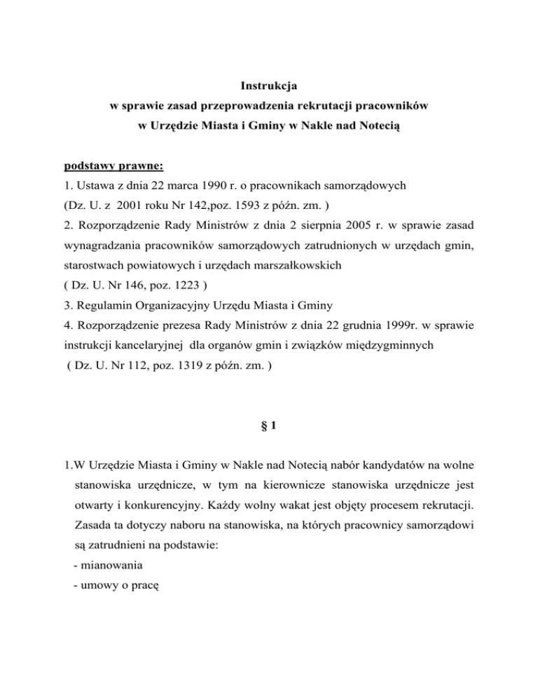 Instrukcja w sprawie zasad przeprowadzenia rekrutacji pracowników w Urzędzie Miasta i Gminy w Nakle nad Notecią podstawy prawne: 1. Ustawa z dnia 22 marca 1990 r. o pracownikach samorządowych (Dz. U. z 2001 roku Nr 142,poz. 1593 z późn. zm. ) 2. Rozporządzenie Rady Ministrów z dnia 2 sierpnia 2005 r. w sprawie zasad wynagradzania pracowników samorządowych zatrudnionych w urzędach gmin, starostwach powiatowych i urzędach marszałkowskich ( Dz. U. Nr 146, poz. 1223 ) 3. Regulamin Organizacyjny Urzędu Miasta i Gminy 4. Rozporządzenie prezesa Rady Ministrów z dnia 22 grudnia 1999r. w sprawie instrukcji kancelaryjnej dla organów gmin i związków międzygminnych ( Dz. U. Nr 112, poz. 1319 z późn. zm. ) §1 1.W Urzędzie Miasta i Gminy w Nakle nad Notecią nabór kandydatów na wolne stanowiska urzędnicze, w tym na kierownicze stanowiska urzędnicze jest otwarty i konkurencyjny. Każdy wolny wakat jest objęty procesem rekrutacji. Zasada ta dotyczy naboru na stanowiska, na których pracownicy samorządowi są zatrudnieni na podstawie: - mianowania - umowy o pracę Wyjątkiem od tej zasady objęci są pracownicy wykonujący pracę na stanowiskach pomocniczych i obsługi, którzy mogą być zatrudnieni z pominięciem tego procesu. 2. Burmistrz może odstąpić od procedury, określonej w ust.1, w przypadku, gdy zatrudnienie na danym stanowisku związane jest z przesunięciem pracowników w ramach wydziałów Urzędu, lub gdy dotyczy zmian organizacyjnych Urzędu. §2 Konieczność zatrudnienia pracownika zgłasza Burmistrzowi Sekretarz lub Naczelnik Wydziału, Komendant Straży Miejskiej składając w tej sprawie wniosek wraz z uzasadnieniem utworzenia nowego stanowiska pracy lub zatrudnienia na powstałym wakacie. §3 Naczelnik Wydziału, (do którego organizowany jest nabór) dokonuje opisu stanowiska pracy a także nakreśla charakterystykę wymagań stanowiska pracy na przygotowanych formularzach , które stanowią załączniki Nr 1 i Nr 2 do niniejszej instrukcji. §4 1. Pracownik ds. kadr wspólnie z Naczelnikiem Wydziału, Komendantem Straży Miejskiej do którego przeprowadzany jest nabór : a) ustalają treść ogłoszenia o naborze kandydata - wg wzoru który stanowi załącznik NR 3, b) określają kryteria stosowane do wyłonienia kandydatów do rozmowy kwalifikacyjnej, c) przygotowują pakiet informacyjny dla kandydatów. 2. Sekretarz Miasta i Gminy w oparciu o ustalenia przeprowadzone przez pracownika ds. kadr i wnioskodawcę dokonuje analizy stanowisk pracy oraz bierze pod uwagę zasadność zgłoszenia, potrzeby zatrudnienia, a także ustala rodzaj oferowanego zatrudnienia i możliwości finansowe zatrudnienia. 3. Ostatecznej akceptacji kryteriów i warunków dokonuje Burmistrz. §5 Pakiet informacyjny dla kandydatów powinien zawierać : - charakterystykę wymagań na stanowisko, - opis stanowiska pracy, - kwestionariusz personalny kandydata – załącznik Nr 4. §6 Ogłoszenie o stanowisku urzędniczym oraz o naborze kandydatów na to stanowisko podaje się do publicznej wiadomości poprzez: - opublikowanie na stronach internetowych urzędu w Biuletynie Informacji Publicznej, - umieszczenie na tablicy ogłoszeń Urzędu, - ogłoszenie w prasie lokalnej lub regionalnej, - zgłoszenie do Powiatowego Urzędu Pracy. §7 1. W celu przeprowadzenia rekrutacji, powołuje się komisję w skład, której wchodzą: a) Sekretarz Miasta i Gminy, b) Naczelnik Wydziału, do którego przeprowadza się nabór, c) Osoba wyznaczoną przez Burmistrza W pracach komisji może brać udział Burmistrz lub Zastępca Burmistrza. 2. Burmistrz Miasta i Gminy w uzasadnionych przypadkach może powiększyć ( uzupełnić ) skład komisji o dodatkowa osobę, która posiada niezbędne kwalifikacje, a także wiedzę i doświadczenie przydatne w procesie przeprowadzania naboru. §8 Komisja rekrutacyjna dokonuje wstępnej selekcji spośród złożonych ofert pod kątem określonych wymogów oraz sporządza listę osób, które spełniają wymagania formalne określone w ogłoszeniu o naborze. §9 1. Po upływie terminu do złożenia dokumentów, określonego w ogłoszeniu o naborze, upowszechnia się w Biuletynie Informacji Publicznej listę kandydatów, którzy spełniają wymagania formalne określone w ogłoszeniu o naborze. 2. Lista, o której mowa w ust.1, zawiera imiona i nazwiska kandydatów oraz ich miejsce zamieszkania – nazwę miejscowości. 3. Informacje o kandydatach, którzy zgłosili się do naboru, stanowią informację publiczną w zakresie objętym wymaganiami związanymi ze stanowiskiem urzędniczym, określonymi w ogłoszeniu o naborze. § 10 1. Pracownik ds. kadr powiadamia wybranych kandydatów o czasie i miejscu prowadzonych rozmów kwalifikacyjnych. 2. Powołana Komisja rekrutacyjna ponosi odpowiedzialność za właściwe przygotowanie i przeprowadzenie rozmowy kwalifikacyjnej . 3. W przypadku znacznej ilości kandydatów komisja może zaprosić na rozmowy kwalifikacyjne niektórych z kandydatów, nie mniej niż pięciu, określając zasady wstępnej kwalifikacji. § 11 Kandydaci ubiegający się o przyjęcie do pracy po zakończonych rozmowach kwalifikacyjnych podlegają ocenie wg przyjętej metody punktowej. Skala obejmuje 5 stopnie od 1 do 5 punktu, które przedstawiają się następująco: - 1 punkt – kandydat nie odpowiada oczekiwaniom - 2 punkty – kandydat spełnia oczekiwania tylko częściowo -3 punkty – kandydat spełnia oczekiwania w stopniu zadawalającym -4 punkty – kandydat spełnia wymagania w stopniu dobrym -5 punktów – kandydat w pełni odpowiada oczekiwaniom § 12 1. Każde kryterium należy oceniać oddzielnie na podstawie przedstawionej dokumentacji oraz udzielonych przez kandydatów odpowiedzi na zadane pytania. 2. Wszystkim kandydatom należy zadać te same lub podobne pytania – w ramach danego zakresu tematycznego ) 3. Wyniki oceny kandydatów sporządza się na formularzu ( Karta oceny spełniania wymagań – która stanowi załącz