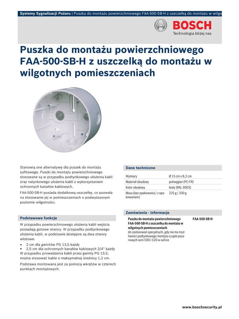 Systemy Sygnalizacji Pożaru | Puszka do montażu powierzchniowego FAA‑500‑SB-H z uszczelką do montażu w wilgotnych pom Puszka do montażu powierzchniowego FAA‑500‑SB-H z uszczelką do montażu w wilgotnych pomieszczeniach Stanowią one alternatywę dla puszek do montażu sufitowego. Puszki do montażu powierzchniowego stosowane są w przypadku podtynkowego ułożenia kabli oraz natynkowego ułożenia kabli z wykorzystaniem ochronnych kanałów kablowych. Dane techniczne FAA‑500‑SB‑H posiada dodatkową uszczelkę, co pozwala na stosowanie jej w pomieszczeniach o podwyższonym poziomie wilgotności. Wymiary Ø 15 cm x 8,2 cm Materiał obudowy poliwęglan (PC-FR) Kolor obudowy biały (RAL 9003) Masa (bez opakowania / z opakowaniem) 225 g / 330 g Zamówienia - informacje Podstawowe funkcje W przypadku powierzchniowego ułożenia kabli wejścia posiadają gotowe otwory. W przypadku podtynkowego ułożenia kabli, w podstawie dostępne są dwa otwory wlotowe: • • Puszka do montażu powierzchniowego FAA‑500‑SB-H z uszczelką do montażu w wilgotnych pomieszczeniach do zastosowań specjalnych, gdy nie ma możliwości podtynkowego montażu czujek pożarowych serii 500 i 520 w suficie FAA-500-SB-H 2 cm dla gwintów PG 13,5 każdy 2,5 cm dla ochronnych kanałów kablowych 3/4'' każdy W przypadku prowadzenia kabli przez gwinty PG 13,5, można stosować kable o maksymalnej średnicy 1,2 cm. Podstawa montowana jest za pomocą wkrętów w czterech punktach montażowych. www.boschsecurity.pl 2 | Puszka do montażu powierzchniowego FAA‑500‑SB-H z uszczelką do montażu w wilgotnych pomieszczeniach Poland Robert Bosch Sp. z o.o. Jutrzenki 105 str. 02-231 Warszawa Phone: +48 22 715 4101 Fax: +48 22 715 4105 [email protected] www.boschsecurity.pl © Robert Bosch Sp. z o.o./ Security Systems 2011 | Zastrzega się możliwość wprowadzania zmian T1901885067 | Cur: pl-PL, V22, 18 Aug 2011 Represented by