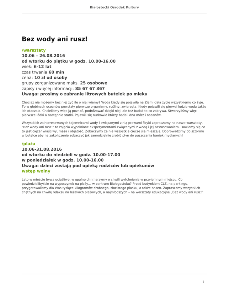 Białostocki Ośrodek Kultury Bez wody ani rusz! /warsztaty 10.06 – 26.08.2016 od wtorku do piątku w godz. 10.00-16.00 wiek: 6-12 lat czas trwania 60 min cena: 10 zł od osoby grupy zorganizowane maks. 25 osobowe zapisy i więcej informacji: 85 67 67 367 Uwaga: prosimy o zabranie litrowych butelek po mleku Chociaż nie możemy bez niej żyć ile o niej wiemy? Woda kiedy się pojawiła na Ziemi dała życie wszystkiemu co żyje. To w głębinach oceanów powstały pierwsze organizmy, rośliny, zwierzęta. Kiedy pojawili się pierwsi ludzie woda także ich otaczała. Chcieliśmy więc ją poznać, podróżować dzięki niej, ale też badać to co zakrywa. Stworzyliśmy więc pierwsze łódki a następnie statki. Pojawili się nurkowie którzy badali dna mórz i oceanów. Wszystkich zainteresowanych tajemnicami wody i związanymi z nią prawami fizyki zapraszamy na nasze warsztaty. "Bez wody ani rusz!" to zajęcia wypełnione eksperymentami związanymi z wodą i jej zastosowaniem. Dowiemy się co to jest ciężar właściwy, masa i objętość. Zobaczymy że nie wszystkie ciecze się mieszają. Doprowadzimy do sztormu w butelce aby na zakończenie zobaczyć jak samodzielnie zrobić płyn do puszczania baniek mydlanych! /plaża 10.06-31.08.2016 od wtorku do niedzieli w godz. 10.00-17.00 w poniedziałek w godz. 10.00-16.00 Uwaga: dzieci zostają pod opieką rodziców lub opiekunów wstęp wolny Lato w mieście bywa uciążliwe, w upalne dni marzymy o chwili wytchnienia w przyjemnym miejscu. Co powiedzielibyście na wypoczynek na plaży… w centrum Białegostoku? Przed budynkiem CLZ, na parkingu, przygotowaliśmy dla Was tysiące kilogramów drobnego, złocistego piasku, a także basen. Zapraszamy wszystkich chętnych na chwilę relaksu na leżakach plażowych, a najmłodszych – na warsztaty edukacyjne „Bez wody ani rusz!”. 1