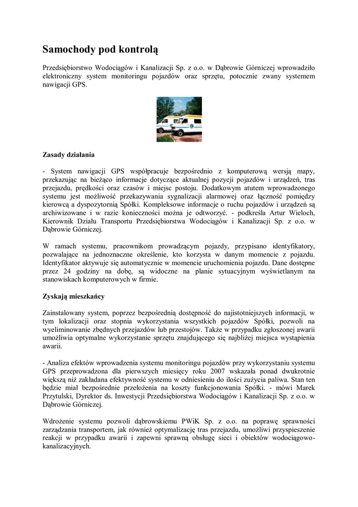 Samochody pod kontrolą Przedsiębiorstwo Wodociągów i Kanalizacji Sp. z o.o. w Dąbrowie Górniczej wprowadziło elektroniczny system monitoringu pojazdów oraz sprzętu, potocznie zwany systemem nawigacji GPS. Zasady działania - System nawigacji GPS współpracuje bezpośrednio z komputerową wersją mapy, przekazując na bieżąco informacje dotyczące aktualnej pozycji pojazdów i urządzeń, tras przejazdu, prędkości oraz czasów i miejsc postoju. Dodatkowym atutem wprowadzonego systemu jest możliwość przekazywania sygnalizacji alarmowej oraz łączność pomiędzy kierowcą a dyspozytornią Spółki. Kompleksowe informacje o ruchu pojazdów i urządzeń są archiwizowane i w razie konieczności można je odtworzyć. - podkreśla Artur Wieloch, Kierownik Działu Transportu Przedsiębiorstwa Wodociągów i Kanalizacji Sp. z o.o. w Dąbrowie Górniczej. W ramach systemu, pracownikom prowadzącym pojazdy, przypisano identyfikatory, pozwalające na jednoznaczne określenie, kto korzysta w danym momencie z pojazdu. Identyfikator aktywuje się automatycznie w momencie uruchomienia pojazdu. Dane dostępne przez 24 godziny na dobę, są widoczne na planie sytuacyjnym wyświetlanym na stanowiskach komputerowych w firmie. Zyskają mieszkańcy Zainstalowany system, poprzez bezpośrednią dostępność do najistotniejszych informacji, w tym lokalizacji oraz stopnia wykorzystania wszystkich pojazdów Spółki, pozwoli na wyeliminowanie zbędnych przejazdów lub przestojów. Także w przypadku zgłoszonej awarii umożliwia optymalne wykorzystanie sprzętu znajdującego się najbliżej miejsca wystąpienia awarii. - Analiza efektów wprowadzenia systemu monitoringu pojazdów przy wykorzystaniu systemu GPS przeprowadzona dla pierwszych miesięcy roku 2007 wskazała ponad dwukrotnie większą niż zakładana efektywność systemu w odniesieniu do ilości zużycia paliwa. Stan ten będzie miał bezpośrednie przełożenia na koszty funkcjonowania Spółki. - mówi Marek Przytulski, Dyrektor ds. Inwestycji Przedsiębiorstwa Wodociągów i Kanalizacji Sp. z o.o. w Dąbrowie Górniczej. Wdrożenie systemu pozwoli dąbrowskiemu PWiK Sp. z o.o. na poprawę sprawności zarządzania transportem, jak również optymalizację tras przejazdu, umożliwi przyspieszenie reakcji w przypadku awarii i zapewni sprawną obsługę sieci i obiektów wodociągowokanalizacyjnych. Dziennik Zachodni – Twoja Woda – 28 czerwca 2007 r.
