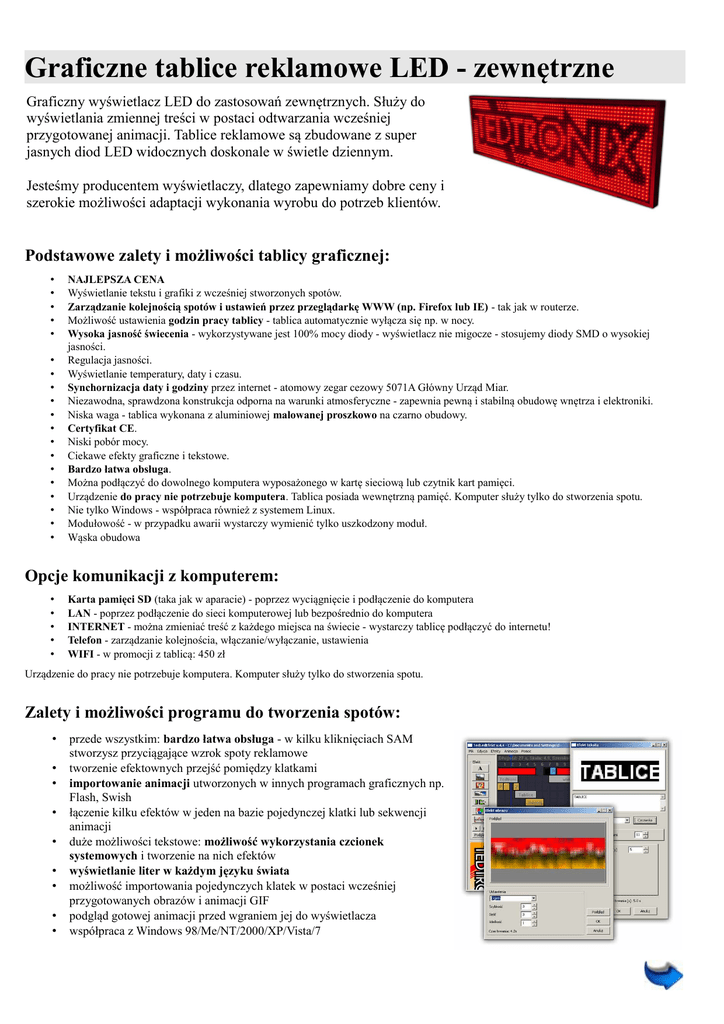 Graficzne tablice reklamowe LED - zewnętrzne Graficzny wyświetlacz LED do zastosowań zewnętrznych. Służy do wyświetlania zmiennej treści w postaci odtwarzania wcześniej przygotowanej animacji. Tablice reklamowe są zbudowane z super jasnych diod LED widocznych doskonale w świetle dziennym. Jesteśmy producentem wyświetlaczy, dlatego zapewniamy dobre ceny i szerokie możliwości adaptacji wykonania wyrobu do potrzeb klientów. Podstawowe zalety i możliwości tablicy graficznej: • • • • • • • • • • • • • • • • • • • NAJLEPSZA CENA Wyświetlanie tekstu i grafiki z wcześniej stworzonych spotów. Zarządzanie kolejnością spotów i ustawień przez przeglądarkę WWW (np. Firefox lub IE) - tak jak w routerze. Możliwość ustawienia godzin pracy tablicy - tablica automatycznie wyłącza się np. w nocy. Wysoka jasność świecenia - wykorzystywane jest 100% mocy diody - wyświetlacz nie migocze - stosujemy diody SMD o wysokiej jasności. Regulacja jasności. Wyświetlanie temperatury, daty i czasu. Synchornizacja daty i godziny przez internet - atomowy zegar cezowy 5071A Główny Urząd Miar. Niezawodna, sprawdzona konstrukcja odporna na warunki atmosferyczne - zapewnia pewną i stabilną obudowę wnętrza i elektroniki. Niska waga - tablica wykonana z aluminiowej malowanej proszkowo na czarno obudowy. Certyfikat CE. Niski pobór mocy. Ciekawe efekty graficzne i tekstowe. Bardzo łatwa obsługa. Można podłączyć do dowolnego komputera wyposażonego w kartę sieciową lub czytnik kart pamięci. Urządzenie do pracy nie potrzebuje komputera. Tablica posiada wewnętrzną pamięć. Komputer służy tylko do stworzenia spotu. Nie tylko Windows - współpraca również z systemem Linux. Modułowość - w przypadku awarii wystarczy wymienić tylko uszkodzony moduł. Wąska obudowa Opcje komunikacji z komputerem: • • • • • Karta pamięci SD (taka jak w aparacie) - poprzez wyciągnięcie i podłączenie do komputera LAN - poprzez podłączenie do sieci komputerowej lub bezpośrednio do komputera INTERNET - można zmieniać treść z każdego miejsca na świecie - wystarczy tablicę podłączyć do internetu! Telefon - zarządzanie kolejnościa, włączanie/wyłączanie, ustawienia WIFI - w promocji z tablicą: 450 zł Urządzenie do pracy nie potrzebuje komputera. Komputer służy tylko do stworzenia spotu. Zalety i możliwości programu do tworzenia spotów: • • • • • • • • • przede wszystkim: bardzo łatwa obsługa - w kilku kliknięciach SAM stworzysz przyciągające wzrok spoty reklamowe tworzenie efektownych przejść pomiędzy klatkami importowanie animacji utworzonych w innych programach graficznych np. Flash, Swish łączenie kilku efektów w jeden na bazie pojedynczej klatki lub sekwencji animacji duże możliwości tekstowe: możliwość wykorzystania czcionek systemowych i tworzenie na nich efektów wyświetlanie liter w każdym języku świata możliwość importowania pojedynczych klatek w postaci wcześniej przygotowanych obrazów i animacji GIF podgląd gotowej animacji przed wgraniem jej do wyświetlacza współpraca z Windows 98/Me/NT/2000/XP/Vista/7 Przykładowe efekty: • • • • • Przewijanie Najazd Powiększanie Dostawianie Rozciąganie • • • • • Skok Obracanie Miganie Rozmycie Pixelizacja • • • • • Trzęsienie Negatyw Gwiazdy Śnieg Krople Parametry techniczne • • • • • • • • Zakres temperatur: -25 °C do +55°C Napięcie zasilania: 200-240 VAC lub 100-120 VAC Częstotliwość sieci: 50/60 Hz Stopień ochrony: IP55 Żywotność: 100 000 godz. (ponad 11 lat ciągłego świecenia) Kąt świecenia: 120° Wyświetlanie: daty, godziny, temperatury Dokładność pomiaru temperatury: +-0.5 °C Kolor diod do wyboru (standard - czerwone): czerwony zielony dopłata +10% Niebieski dopłata +10% Biały dopłata +10% Żółty dopłata +10% • • • • • Ogień Wąż Spirala Przenikanie i wiele innych