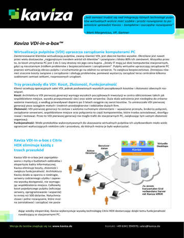 „Jeśli zamiast trudzid się nad integracją różnych technologii pulpitów wirtualnych wolicie mied szybkie i proste rozwiązanie to powinniście sprawdzid Kaviza – kompletne i oszczędne rozwiązanie” – Mark Margevicius, VP, Gartner Kaviza VDI-in-a-box™ Wirtualizacja pulpitów (VDI) upraszcza zarządzanie komputerami PC Zainteresowanie klientów wirtualizacją pulpitów, zwaną również VDI, jest obecnie bardzo wysokie. Określane jest nawet przez wielu dostawców „najgorętszym trendem wśród ich klientów” i powiązane z blisko 80% ich zamówieo. Wszystko przez to, że koszt utrzymania PC jest 3 do 5 razy droższy niż jego cena kupna. „Działy IT mają już dośd komputerów stacjonarnych, gdyż są nieustannym źródłem problemów z bezpieczeostwem i zarządzaniem”. Pulpity wirtualne upraszczają zarządzanie PC poprzez wirtualizację obrazu pulpitu i uruchamianie go na zdalnie na serwerze. To zwiększa bezpieczeostwo. Zmniejsza również znacznie koszty związane z zarządzanie i obsługą problemów, ponieważ wystarczy zarządzad teraz centralnie kilkoma szablonami zamiast setkami, rozproszonych urządzeo. Trzy przeszkody dla VDI: Koszt, Złożonośd, Funkcjonalnośd Klienci oczekują operacyjnych zalet VDI, jednak pozbawionych wysokich początkowych kosztów i złożoności obecnych rozwiązao. Koszt: Architektura VDI pierwszej generacji wymaga wysokich początkowych inwestycji w centra obliczeniowe takich jak współdzielone miejsce, wysoka przepustowośd sieci oraz wiele serwerów. Duża skala wdrożenia jest niezbędna do zrównoważenia inwestycji, a według przewidywao dopiero po 3 latach osiągnie się zwrot kosztów. To umieszczało VDI pierwszej generacji poza zasięgiem małych i średnich przedsiębiorstw i oddziałów dużych firm. Złożonośd: VDI pierwszej generacji to zestaw z wieloma ruchomymi elementami – wyważanie przesyłu, brokerzy połączeo, zarządzanie serwerami, współdzielone miejsce oraz połączenia to częśd komponentów, które trzeba zainstalowad, skonfigurowad i testowad. Przez to VDI pierwszej generacji nie mogło trafid do stacjonarnych PC, zwiększając tym samym złożonośd organizacji. Funkcjonalnośd: Wiele protokołów wykorzystywanych do ukazywania wirtualnych pulpitów ich użytkownikom miało wiele ograniczeo wykluczających niektóre cele i procedury, do których można je było wykorzystad. Kaviza VDI-in-a-box z Citrix HDX eliminuje każdą z trzech przeszkód Kaviza VDI-in-a-box jest zaprojektowana z myślą o budżetach oddziałów i ekspertyzie kadry informatycznej. Kaviza eliminuje koszty, złożonośd i zwiększa funkcjonalnośd. Architektura Kavizy działa w oparciu o niedrogie, serwery codziennego użytku i zapewnia wysoką dostępnośd, nie wymagając współdzielenia miejsca. Całkowity koszt pojedynczego pulpitu (wliczając serwery, oprogramowanie i wsparcie) to mniej niż 500 dolarów. Natychmiastowe i pełne rozwiązanie, które można zainstalowad i zarządzad nie posiadając wiedzy eksperckiej. Kaviza wykorzystuje wysoką technologię Citrix HDX dostarczając dzięki temu funkcjonalnośd rywalizującą ze stacjonarnymi PC. Wersja do testów znajduje się na: www.kaviza.de Kontakt: +49 6341 994970; [email protected] Kaviza VDI-in-a-box™ GŁÓWNE CECHY KORZYŚCI Łatwe, Niedrogie, Elastyczne, Skalowalne, Wysoce Wydajne, Otwarte VDI Natychmiastowy ROI przy inwestycjach dowolnej wielkości Szybkie wdrożenie. Do wdrożenia Kavizy potrzeba wyłącznie serwera pełniącego rolę hiperwizora. Nie potrzeba rozbudowanych centrów obliczeniowych ani współdzielonego miejsca. Wystarczyd zainstalowad aplikację Kaviza na serwer, następnie ją uruchomid i już można korzystad z wirtualnych pulpitów. Minimalna infrastruktura. Kaviza skaluje się korzystając z niedrogich serwerów. Przy wzroście zapotrzebowania wystarczy po prostu dodad serwery. Natychmiastowa aplikacja wszystko-w-jednym. Kaviza posiada wbudowaną pełną funkcjonalnośd VDI, więc niema potrzeby zarządzania wieloma elementami. Zarządzanie połączeniami, przepełnieniem sieci, pulpitami i użytkownikami jest w pełni obsługiwane przez VDI-in-a-box. Wbudowana wysoka dostępnośd. Wirtualna aplikacja Kavizy działając na więcej niż jednym serwerze kreuje wysoce dostępną sied z wbudowaną redundancją. Nie ma potrzeby dopisywania kodu ani instalowania nakładek. Bogata funkcjonalnośd z Citrix HDX. Kaviza w pełni wspiera zaawansowaną optymalizację i ulepszenia dostarczane przez technologie Citrix HDX. W rezultacie zyskuje się koocową funkcjonalnośd nieraz lepszą od tej oferowanej przez komputery stacjonarne. Nie wymaga wiedzy specjalistycznej Kaviza jest tak zaprojektowana aby do jej instalacji i zarządzania nie była potrzebna wiedza ekspercka Wdrożenie kosztuje mniej niż PC. Koszt instalacji wirtualnych pulpitów Kaviza to mniej niż 500 dolarów za pulpit. Działając na tanich serwerach, bez wymogu współdzielenia miejsca Kaviza kosztuje 1/6 tego co jej alternatywy. Generuje natychmiastowy ROI. Wirtualne pulpity Kavizy kosztują mniej niż zastępowane przez nie PC, zatem dają natychmiastowy zwrot inwestycji. Zwrot kosztów przy dowolnej skali. Kawiza zapewnia natychmiastowy ROI, niezależnie od rozmiaru wdrożenia. Można zacząd od działu, lub klasy użytkowników i skalowad wraz ze wzrostem potrzeb. Kaviza jest opłacalna przy wdrożeniach od 25 pulpitów w górę. Brak zmian kulturalno-organizacyjnych. Kaviza jest zaprojektowana z myślą o obsłudze przez te same działy IT, które poprzednio zajmowały się PCtami. Nie wymaga dodatkowej wiedzy ani umiejętności. Mieści się w budżecie na renowację PC. Kaviza może zostad zakupiona w ramach renowacji istniejących PC. Nie potrzeba dużych początkowych inwestycji w infrastrukturę. Rzeczywista alternatywa dla PC. Kaviza daje lepszą zarządzalnośd, tą samą lub lepszą funkcjonalnośd z Citrix HDX oraz niższe koszty początkowe niż PC, przez co sta