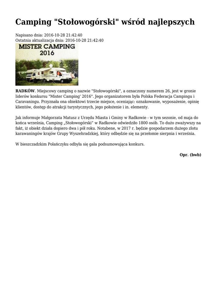 Camping "Stołowogórski" wśród najlepszych Napisano dnia: 2016-10-28 21:42:40 Ostatnia aktualizacja dnia: 2016-10-28 21:42:40 RADKÓW. Miejscowy camping o nazwie "Stołowogórski", a oznaczony numerem 26, jest w gronie liderów konkursu "Mister Camping' 2016". Jego organizatorem była Polska Federacja Campingu i Caravaningu. Przyznała ona obiektowi trzecie miejsce, oceniając: oznakowanie, wyposażenie, opinię klientów, dostęp do atrakcji turystycznych, jego położenie i in. elementy. Jak informuje Małgorzata Matusz z Urzędu Miasta i Gminy w Radkowie - w tym sezonie, od maja do końca września, Camping „Stołowogórski” w Radkowie odwiedziło 1800 osób. To dużo zważywszy na fakt, iż obiekt działa dopiero dwa i pół roku. Notabene, w 2017 r. będzie gospodarzem dużego zlotu karawaningów krajów Grupy Wyszehradzkiej, który odbędzie się na przełomie sierpnia i września. W bieszczadzkim Polańczyku odbyła się gala podsumowująca konkurs. Opr. (bwb)