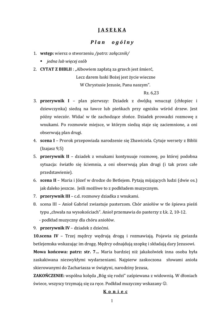 JASEŁKA Plan ogólny 1. wstęp: wiersz o stworzeniu /patrz: załącznik/ jedna lub więcej osób 2. CYTAT Z BIBLII : „Albowiem zapłatą za grzech jest śmierć, Lecz darem łaski Bożej jest życie wieczne W Chrystusie Jezusie, Panu naszym”. Rz. 6,23 3. przerywnik I – plan pierwszy: Dziadek z dwójką wnucząt (chłopiec i dziewczynka) siedzą na ławce lub pieńkach przy ognisku wśród drzew. Jest późny wieczór. Widać w tle zachodzące słońce. Dziadek prowadzi rozmowę z wnukami. Po rozmowie miejsce, w którym siedzą staje się zaciemnione, a oni obserwują plan drugi. 4. scena I – Prorok przepowiada narodzenie się Zbawiciela. Cytuje wersety z Biblii (Izajasz 9,5) 5. przerywnik II – dziadek z wnukami kontynuuje rozmowę, po której podobna sytuacja: światło się ściemnia, a oni obserwują plan drugi (i tak przez całe przedstawienie). 6. scena II – Maria i Józef w drodze do Betlejem. Pytają mijających ludzi (dwie os.) jak daleko jeszcze. Jeśli możliwe to z podkładem muzycznym. 7. przerywnik III – c.d. rozmowy dziadka z wnukami. 8. scena III – Anioł Gabriel zwiastuje pasterzom. Chór aniołów w tle śpiewa pieśń typu „chwała na wysokościach”. Anioł przemawia do pasterzy z Łk. 2, 10-12. - podkład muzyczny dla chóru aniołów. 9. przerywnik IV – dziadek z dziećmi. 10.scena IV – Trzej mędrcy wędrują drogą i rozmawiają. Pojawia się gwiazda betlejemska wskazując im drogę. Mędrcy odnajdują szopkę i składają dary Jezusowi. Mowa końcowa: patrz: str. 7… Maria bardziej niż jakakolwiek inna osoba była zaskakiwana niezwykłymi wydarzeniami. Najpierw zaskoczona słowami anioła skierowanymi do Zachariasza w świątyni, narodziny Jezusa, ZAKOŃCZENIE: wspólna kolęda „Bóg się rodzi” zaśpiewana z widownią. W dłoniach świece, wszyscy trzymają się za ręce. Podkład muzyczny wskazany ☺. K o n i e c 1 Potrzebne postacie: 1. aniołek/wędrowiec 2. Maria 3. wnuczka 4. prorok 5. pasterz 6. Józef 7. wnuk 8. mędrzec 9. aniołek 10. aniołek 11. aniołek 12. mędrzec 13. wędrowiec 14. mędrzec 15. aniołek 16. aniołek 17. pasterz 18. anioł Gabriel 19. anioł/wiersz o stworzeniu 20. pasterz/cytat z Biblii – Rz.6,23 21. pasterz 22. pasterz/wiersz o stworzeniu 23. narrator - ilość aniołków i pasterzy może być dowolna, w zależności od potrzeb. 2 Scenariusz i dialogi PRZERYWNIK/scena I : Dziadek z wnuczkami siedzi przy ognisku w lesie. Jest wieczór, ściemnia się. W tle zachodzące słońce. Dziadek (Adam): Więc jak się wam podoba nasz wypoczynek na łonie przyrody? WNUCZEK: o, tak, jest super WNUCZKA: spójrz dziadku, czyż ten zachód słońca nie jest cudowny? Dziadek: O tak, jest wspaniały. Piękny wieczór zwłaszcza dla nowych narodzin. WNUCZEK: czy myślisz dziadku, że mama niedługo urodzi dzidziusia? Dziadek: nie wiem, myślę że to będzie już wkrótce, Dawid. Jestem bardzo podekscytowany na myśl o tym. WNUCZEK: chciałbym, żeby to był chłopiec Dziadek: a co ty chcesz, żeby się urodziło, Klaudia? WNUCZKA: dla mnie to nieważne, czy to będzie chłopiec czy dziewczynka, chcę żeby się w końcu urodziło! WNUCZEK: czekamy na nie już tak długo ! Dziadek: dziecko jest czymś bardzo ekscytującym, Dawidku. Było kiedyś pewne dziecko na które czekano o wiele dłużej niż wy, bo przez wiele pokoleń. WNUCZKA: Naprawdę? Nigdy wcześniej nie myślałam o tym, że ktoś mógł czekać dłużej od nas. Dziadek: tak, tak. Było pewne dziecko na które czekano przez całe wieki. WNUCZEK: naprawdę? Dziadek: tak, prawdopodobnie był najbardziej oczekiwanym dzieckiem jak nigdy wcześniej. Wielki prorok przepowiedział, że Mesjasz nadejdzie. Będzie pochodził z rodu Dawida i urodzi się w Betlejem. Każda kobieta wywodząca się z tego rodu pragnęła być Jego ziemską matką. WNUCZKA: jak się nazywało to dziecko? Dziadek: więc, jedno z Jego imion to: Człowiek Obietnicy. Posłuchajcie uważnie, opowiem wam o tym… ścisza głos, udając że opowiada… 3 SCENA I : Prorok pokazuje się i zaczyna przemawiać do ludu (widzów) z Ks. Izajasza …9,5 „ O Betlejemie, ziemio Judzka … PRZERYWNIK/scena II : Nadal przy ognisku… i tak do końca inscenizacji. WNUCZKA: o dziadku, proszę, opowiedz nam całą historię WNUCZEK: prosimy, będziemy grzecznie słuchać Dziadek: no, nie wiem… dobrze, czy pamiętacie jak ta historia się zaczyna? WNUCZEK: jasne! Maria i Józef wyruszyli do Betlejem na spis ludności i …(chciał opowiadać dalej, lecz dziadek przerwał) Dziadek: (śmiejąc się odpowiada) ale przedtem, kto był pierwszym, który dowiedział się o ziszczeniu się obietnicy? WNUCZKA: więc … (po chwili zastanowienia), Jego matka – Maria! Dziadek: właśnie! Anioł Gabriel przyszedł do niej i powiedział jej, że urodzi Syna Bożego. Czy możecie sobie wyobrazić, jak ona mogła się czuć? WNUCZEK: ja bym się bał WNUCZKA: a ja nie! ☺ To musiało być ekscytujące! Dziadek: tak. Te narodziny poprzedzało radosne oczekiwanie … Gasną światła. Pojawia się plan drugi… SCENA II Maria i Józef w drodze do Betlejem. Spotykają na drodze mieszkańców/tubylców Józef: przepraszam, czy daleko jeszcze do Betlejem? Mieszkaniec: już niedaleko. Ale dzisiaj tłumy na drogach, prawda? Mnóstwo podróżnych udających się do swoich rodzinnych miast. Dziecko (podchodzi do Marii): twoje dziecko jest bardzo wyjątkowe Maria: skąd to wiesz? Dziecko: po prostu wiem. Czekaliśmy na nie dłuuuugi czas. Może zostaniecie tu na noc i odpoczniecie? Józef: dziękuję, ale musimy iść do Betlejem. 4 PRZERYWNIK/scena III WNUCZEK: ale dziadku, skoro tyle ludzi szło do Betlejem to czy wystarczyło miejsca na nocleg dla każdego? Dziadek: niestety, nie. Ale Józef znalazł stajenkę. Zrobił posłanie z siana dla Marii i mającego urodzić się dziecka. Zdążył w samą porę! A wkrótce pojawili się niespodziewani goście. WNUCZEK: kto dziadku? opowiadaj proszę ! Dziadek: odwiedzili ich pa