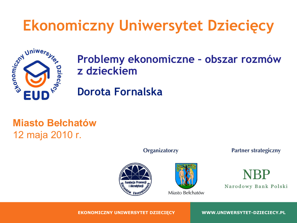 Ekonomiczny Uniwersytet Dziecięcy Problemy ekonomiczne – obszar rozmów z dzieckiem Dorota Fornalska Miasto Bełchatów 12 maja 2010 r. EKONOMICZNY UNIWERSYTET DZIECIĘCY WWW.UNIWERSYTET-DZIECIECY.PL Dobre praktyki w komunikacji z dzieckiem Przezwyciężanie barier komunikacyjnych Bariery komunikacyjne  Zaprzeczanie uczuciom  Filozofowanie  Dawanie dobrych rad  Wypytywanie  Obrona drugiej osoby  Użalanie Bariery komunikacyjne c.d.  Psychologizowanie  Moralizowanie  Krzyk  Krytykowanie  Obrażanie Dobre praktyki w komunikacji z dzieckiem • • • • Uważne słuchanie Wypowiedzi empatyczne Precyzowanie Komunikat „JA” Komunikat „JA” • Uczucia (czuję...np. złość, jestem...np. zdenerwowana/y, zadowolona/y) • Gusta i upodobania (podoba mi się, nie podoba mi się, lubię, nie lubię) • Poglądy i opinie (myślę, że..., uważam, że..., moim zdaniem...) • Oczekiwania (oczekuję..., że przyjdziesz na czas, potrzebuję... Twojej pomocy) • Granice (chcę, nie chcę, nie pozwalam, nie zgadzam się, nie wolno, nie życzę sobie) Pieniądze Pieniądze to „powszechnie akceptowany środek wymiany dóbr i usług oraz miernik ich wartości” Rozmowy z dziećmi o pieniądzach nie zdemoralizują ich i nie zaburzą ich rozwoju. Pieniądze Dziecko powinno wiedzieć  co to są pieniądze  do czego są potrzebne  jaką mają wartość  jak nimi poprawnie rozporządzać Kryzys Kryzys to przede wszystkim utrata pracy i dochodu, co może być powodem wzrostu poziomu stresu w rodzinie. Jak rozmawiać o kryzysie? • uczciwie przedstawić sytuację i wspólnie podjąć decyzję • rzeczowa rozmowa i konsekwencja. np. jeśli podejmujemy decyzje, że „zaciskamy pasa”, to zaciskamy pasa wszyscy Jak rozmawiać o kryzysie? c.d. • Młodsze dzieci 5-7 lat- komunikujemy im naszą decyzję oraz ją uzasadniamy (np. musimy to odłożyć, bo teraz tata albo mama będą zarabiać mniej.) • Starsze dzieci powinny uczestniczyć w takich rozmowach i w podejmowaniu decyzji, które dotyczą ich bezpośrednio Przedsiębiorczość zaradność człowieka w gąszczu praw, obowiązków i możliwości. Człowiek przedsiębiorczy przejmuje inicjatywę. załatwia sprawy sam. umie dobrze gospodarować powierzonym mu kapitałem. zna się na tym, co robi i wykonuje to z dużą łatwością. W wakacje 2008r. pracowało • 12% uczniów szkół podstawowych • 21% gimnazjalistów • 41% uczniów szkół średnich Sposoby zarabiania m.in. • • • • • McDonald’s Rolnictwo i ogrodnictwo Aukcje internetowe Pisanie wypracowań Handel postaciami z gier Cele edukacji ekonomicznej:  przygotowanie młodego człowieka do pełnienia ról społecznych konsumenta, pracownika, przedsiębiorcy  kształtowanie postaw przedsiębiorczości, kreatywności, odpowiedzialności za dokonywane wybory  wykształcenie poczucia gospodarności  szanowanie własności swojej i cudzej, pracy, którą wykonują inni Sposoby realizacji  obserwacja zachowań dorosłych  rozmowa, dawanie przykładu  własne doświadczenie (rozporządzanie kieszonkowym)  współdziałanie Kieszonkowe Średnio jest to obecnie kwota 55 złotych miesięcznie. Pieniądze te dzieci wydają przede wszystkim na słodycze, jedzenie, napoje, karty do telefonu, kosmetyki i ubrania. Kieszonkowe c.d. • polskie nastolatki wydają rocznie ponad 200 mln zł • nastolatki mają coraz większy wpływ na decyzje całej rodziny, bardzo często dotyczące dużych drogich zakupów. Kieszonkowe-ustalanie zasad np.  najlepiej zacząć od drobnych sum (5-10 zł) dawanych co tydzień zaproponowanie, co z kieszonkowego będzie finansowane (konsekwencja!) doradzanie ale nie dyktowanie, co zrobić z pieniędzmi można uzależnić wypłatę od wykonania obowiązków domowych (sprecyzowanie), ale NIE płacić za ich wykonanie Obowiązki domowe jako element edukacji ekonomicznej Posiadanie obowiązków domowych uczy:  odpowiedzialności  zaradności  systematyczności  samodzielności  szacunku do pracy innych Obowiązki domowe cd.  sprzątanie przestrzeni wspólnej – np.odkurzanie, toaleta, łazienka  pomoc w kuchni –np. obieranie ziemniaków, pomoc przy robieniu posiłków, zmywanie naczyń, rozpakowywanie zmywarki  zakupy – robienie, wnoszenie do domu  pranie – np. własnej bielizny  prasowanie swoich rzeczy Bogaty – to nie ten, kto ma dużo pieniędzy, lecz ten, kto może sobie pozwolić na życie wśród uroków, jakie roztacza wczesna wiosna