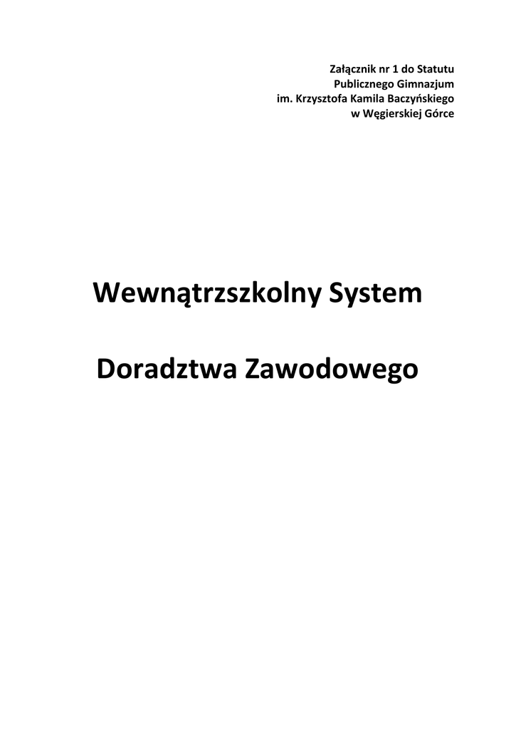 Załącznik nr 1 do Statutu Publicznego Gimnazjum im. Krzysztofa Kamila Baczyńskiego w Węgierskiej Górce Wewnątrzszkolny System Doradztwa Zawodowego Wstęp Wewnątrzszkolny System Doradztwa Zawodowego koordynuje wszystkie działania podejmowane przez szkołę w celu przygotowania uczniów do wyboru zawodu, poziomu i kierunku kształcenia. Głównym jego celem jest stworzenie w szkole najbardziej sprzyjających warunków dla przygotowanie młodzieży do wyboru dalszej drogi kształcenia, zaistnienia i poruszania się na rynku pracy. System ten zawiera działania podejmowane przez dyrekcję szkoły, wychowawców, nauczycieli, pedagoga szkolnego, a kierowanych do uczniów i rodziców. W ramach realizacji zadań Wewnątrzszkolnego Systemu Doradztwa Zawodowego szkoła współpracuje z: 1. Mobilnym Centrum Informacji Zawodowej w Bielsku Białej; 2. Poradnią Psychologiczno - Pedagogiczną w Węgierskiej Górce; 3. Szkołami ponadgimnazjalnymi; 4. Zakładami pracy i okolicznymi firmami. Zadania szkoły w zakresie doradztwa zawodowego (Rozporządzeniu Ministra Edukacji Narodowej i Sportu z dnia 7 stycznia 2003 r. w sprawie zasad udzielania i organizacji pomocy psychologiczno – pedagogicznej w publicznych przedszkolach, szkołach i placówkach (Dz. U. z 2003 r. nr 11 poz. 114) 2 a) Systematyczne diagnozowanie zapotrzebowania uczniów na informacje edukacyjne i zawodowe oraz pomoc w planowaniu kształcenia i kariery zawodowej; b) Gromadzenie, aktualizację i udostępnianie informacji edukacyjnych i zawodowych właściwych dla danego poziomu kształcenia; c) Wskazywanie uczniom, rodzicom i nauczycielom dodatkowych źródeł informacji na poziomie regionalnym, ogólnokrajowym, europejskim i światowym dotyczącym rynku pracy, trendów rozwojowych w świecie zawodów i zatrudnienia oraz wykorzystania posiadanych uzdolnień i talentów przy wykonywaniu przyszłych zadań zawodowych; d) Wskazywanie uczniom, rodzicom i nauczycielom, instytucji i organizacji wspierających funkcjonowanie osób niepełnosprawnych w życiu codziennym i zawodowym; e) Wskazywanie uczniom, rodzicom i nauczycielom alternatywnych możliwości kształcenia dla uczniów z problemami emocjonalnymi i dla uczniów niedostosowanych społecznie; f) Wskazywanie programów edukacyjnych Unii Europejskiej; g) Udzielanie indywidualnych porad uczniom i rodzicom; h) Prowadzenie grupowych zajęć aktywizujących, przygotowujących uczniów do świadomego planowania kariery i podjęcia roli zawodowej; i) Koordynowanie działalności informacyjno – doradczej prowadzonej przez szkołę; j) Wspieranie w działaniach doradczych rodziców i nauczycieli poprzez organizowanie spotkań szkoleniowo – informacyjnych, udostępnianie informacji i materiałów do pracy z uczniami; k) Współpracę z instytucjami wspierającymi wewnątrzszkolny system doradztwa zawodowego, w szczególności z poradniami psychologiczno – 3 pedagogicznymi oraz instytucjami świadczącymi poradnictwo i specjalistyczną pomoc uczniom i rodzicom. Działania podejmowane przez szkołę w zakresie doradztwa zawodowego Działania realizowane w ciągu roku szkolnego Odpowiedzialni Wychowawcy klas III 1. Udział klas trzecich w Giełdzie Edukacyjnej w Żywcu. 2. Udział klas trzecich w prezentacjach szkół Pedagog szkolny, ponadgimnazjalnych z naszego rejonu. wychowawca, 3. Prezentacja ulotek szkół ponadgimnazjlanych na Pedagog szkolny gazetce szkolnej. 4. Opracowanie materiału informacyjnego dla Redakcja rodziców klas trzecich, dotyczącego procedury Eurogimzetki rekrutacji do szkół ponadgimnazjalnych. 5. Pedagogizacja rodziców klas trzecich dotycząca Dyrektor szkoły egzaminu gimnazjalnego i rekrutacji do szkół ponadgimnazjalnych. 6. Organizacja warsztatów z przedstawicielami Pedagog szkolny Mobilnego Centrum Informacji Zawodowej w Bielsku Białej. 7. Gromadzenie i udostępnianie materiałów Biblioteka szkolna związanych z wyborem zawodu i drogi kształcenia. 8. Rozmowy indywidualne z uczniami lub rodzicami. 4 Pedagog szkolny 9. Zwiedzanie szkół ponadgimnazjalnych w ramach Wychowawcy klas Drzwi Otwartych. 10.Udostępnianie informacji na temat instytucji Pedagog szkolny zajmujących się doradztwem zawodowym. 11.Rozwijanie zainteresowań uczniów poprzez Wszyscy nauczyciele organizowanie zajęć pozalekcyjnych, kółek zainteresowań, realizację projektów edukacyjnych. 12.Analizowanie wyników egzaminu gimnazjalnego. Wszyscy nauczyciele Tematyka lekcji związanych z doradztwem zawodowym realizowanych w klasach II i III 1.Orientacja zawodowa. Nauczyciel wos 2.Jak szukać pracy i przygotować odpowiednie Nauczyciel wos dokumenty. 3.Jak przygotować się do rozmowy kwalifikacyjnej Nauczyciel wos z przyszłym pracodawcą. 4. System kształcenia w Polsce (co po gimnazjum) Nauczyciel wos 4.Redagowanie pism niezbędnych rekrutacji. (podanie, CV, list motywacyjny) podczas Nauczyciel języka polskiego 5.Czym się kierować wybierając ponadgimnazjalną. 6. Jak kształtować swój charakter. szkołę Pedagog szkolny Wychowawcy klas II 7.Co to jest dojrzałość – ocena własnej wartości, Wychowawcy klas II konieczność podejmowania decyzji. 8. Zawód - wyzwanie dla młodego człowieka Wychowawcy klas III 9.Podejmuję decyzje o mojej przyszłości Wychowawcy klas III 10. Analiza skłonności zawodowych Wychowawcy klas III 5 11.Moje zainteresowania, a decyzje o wyborze Wychowawcy klas III zawodu. 12.Poznajemy wybrane zawody Wychowawcy klas III 6
