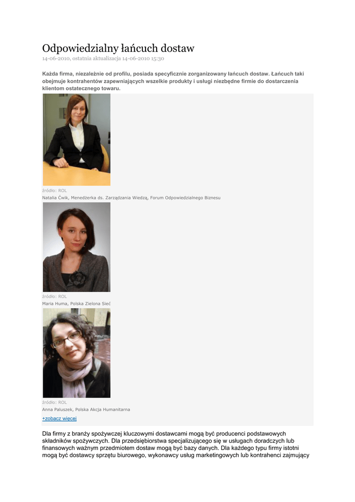 Odpowiedzialny łańcuch dostaw 14-06-2010, ostatnia aktualizacja 14-06-2010 15:30 Każda firma, niezależnie od profilu, posiada specyficznie zorganizowany łańcuch dostaw. Łańcuch taki obejmuje kontrahentów zapewniających wszelkie produkty i usługi niezbędne firmie do dostarczenia klientom ostatecznego towaru. źródło: ROL Natalia Ćwik, Menedżerka ds. Zarządzania Wiedzą, Forum Odpowiedzialnego Biznesu źródło: ROL Maria Huma, Polska Zielona Sieć źródło: ROL Anna Paluszek, Polska Akcja Humanitarna +zobacz więcej Dla firmy z branży spożywczej kluczowymi dostawcami mogą być producenci podstawowych składników spożywczych. Dla przedsiębiorstwa specjalizującego się w usługach doradczych lub finansowych ważnym przedmiotem dostaw mogą być bazy danych. Dla każdego typu firmy istotni mogą być dostawcy sprzętu biurowego, wykonawcy usług marketingowych lub kontrahenci zajmujący się logistyką. Co ważne, szeroko rozumiany łańcuch dostaw obejmuje cały cykl życia produktu, łącznie ze sprzedażą, usługami posprzedażowymi i utylizacją, obejmuje zatem szereg kluczowych procesów biznesowych, stanowiących swego rodzaju kręgosłup przedsiębiorstwa. To, w jaki sposób firma pozyskuje podstawowe surowce, produkty i usługi decyduje o tym, w jaki sposób tworzy wartość dla interesariuszy. Problematyka dostaw w kontekście odpowiedzialności biznesu jest w Polsce stosunkowo rzadko poruszana. Poza wyjątkami, takimi jak pionierskie badania prowadzone przez Katedrę Logistyki w Szkole Głównej Handlowej, temat „odpowiedzialnego” czy „zrównoważonego” łańcucha dostaw wymaga głębszej analizy, szczególnie w odniesieniu do specyfiki firm działających w Polsce. Dostawcy to interesariusze, którzy najrzadziej stają się bohaterami dobrych praktyk, jakimi chwalą się polskie firmy, a komunikacja na ten temat wydaje się jeszcze niewystarczająca. Tymczasem jest to jeden z najważniejszych i najbardziej newralgicznych obszarów działania przedsiębiorstw – obszarów, które w coraz większym stopniu stają się obiektem zainteresowania konsumentów, organizacji strażniczych oraz globalnych kontrahentów. Standardy stosowane w relacjach z dostawcami i zrównoważone podejście do pozyskiwania surowców to również ważne kryteria oceny firm, wykorzystywane m.in. w rankingach odpowiedzialnych przedsiębiorstw czy przy konstruowaniu „etycznych” indeksów giełdowych. Dla wielu firm produkujących na eksport jest to natomiast ważny wyróżnik, a często wymóg, przy ubieganiu się o kontrakty. Obecnie wiele zachodnich koncernów nie tylko prowadzi szczegółowe kontrole u swoich dostawców, ale też raportuje na temat postępów w tej mierze, nawet, jeśli przejrzystość wymaga przyznania się do niepowodzeń. Narzędzia umożliwiające zarządzanie, monitorowanie, ewaluowanie i audyt w „odpowiedzialnym” łańcuchu dostaw są wciąż rozwijane i udoskonalane. Odpowiedzialny czyli jaki? Mówiąc o łańcuchu dostaw należy podkreślić, że nie ma jednego, uniwersalnego modelu. Każda branża, każde przedsiębiorstwo operuje w specyficznym otoczeniu i tworzy swój unikatowy system organizacji dostaw (może np. outsource’ować większość procesów). Istnieje jednak szereg zjawisk uniwersalnych, które dotyczą tej sfery, a które są istotne z punktu widzenia społecznej odpowiedzialności biznesu. Organizacja Business In the Community (BITC) opublikowała w 2009 roku przewodnik dla przedsiębiorstw, w którym zidentyfikowała trzy najważniejsze obszary dotyczące „odpowiedzialnych” dostaw: ekonomiczny, społeczny oraz środowiskowy. Jeżeli odpowiedzialność biznesu oznacza prowadzenie działalności w sposób, który łączy cele ekonomiczne z dobrem społeczeństwa i środowiska naturalnego – ta sama zasada dotyczy sposobu zarządzania łańcuchem dostaw. Kwestie ekonomiczne Do kryteriów ekonomicznych, które kształtują relacje firm z ich dostawcami, należą m.in. takie aspekty jak uczciwe warunki kontraktów, terminowe płacenie należności, nie wykorzystywanie przewagi ekonomicznej do negocjowania nieadekwatnych cen i warunków umów, zapobieganie korupcji. Dostawcami mogą być firmy różnej wielkości i o różnej sile przetargowej – jeżeli obroty dostawcy w handlu z firmą są znaczące, należy brać pod uwagę ryzyko jakie niesie ze sobą zerwanie z nim kontraktu. Z punktu widzenia zasad odpowiedzialnego biznesu kwestią szczególnie newralgiczną są także terminy płatności faktur – ustanawiając dopuszczalny termin warto wziąć pod uwagę czy jest to odstęp czasu, który pozwoli dostawcy sprawnie funkcjonować, szczególnie, jeśli jego kondycja finansowa uzależniona może być od zamówień firmy. Niekiedy dostawcami mogą być przedsiębiorstwa z sektora ekonomii społecznej, prowadzone przez mniejszości lub funkcjonujące na terenach wrażliwych ekonomicznie, co również wymaga zapewnienia odpowiednich standardów współpracy. Kwestie społeczne Wśród aspektów społecznych, które firmy mogą monitorować u swoich łańcuchach dostaw, wyróżnić można przestrzeganie prawa pracy i praw człowieka, godziwe wynagradzanie pracowników (szczególnie w sytuacji, jeśli minimalne wymagane wynagrodzenie nie umożliwia pracownikom utrzymania się), przestrzeganie ustalonych godzin pracy oraz bezpieczeństwo w miejscu pracy. Można brać również pod uwagę to, w jaki sposób firma oddziałuje na lokalną społeczność, a jeśli jest to wpływ negatywny to, w jaki sposób stara się go minimalizować. W krajach, w których aktywność konsumentów pod względem monitorowania odpowiedzialności biznesu jest wyższa niż w Polsce, kwestie społeczne związane z dostawcami doprowadziły niejednokrotnie do bojkotu firm, które nie zapobiegały nadużyciom. Kwestie środowiskowe Aspekty związane z oddziaływaniem na środowisko należy odnosić do całego cyklu życia produktu – od jego projek