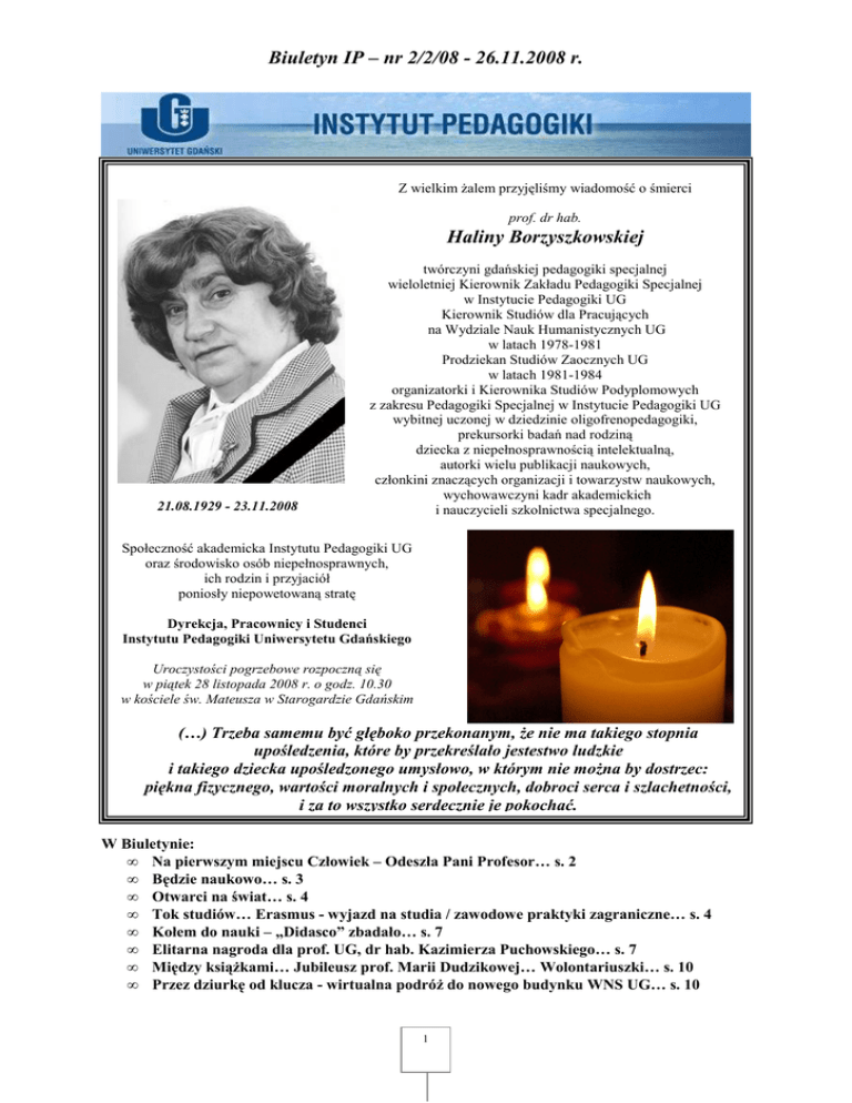Biuletyn IP – nr 2/2/08 - 26.11.2008 r. Z wielkim Ŝalem przyjęliśmy wiadomość o śmierci prof. dr hab. Haliny Borzyszkowskiej 21.08.1929 - 23.11.2008 twórczyni gdańskiej pedagogiki specjalnej wieloletniej Kierownik Zakładu Pedagogiki Specjalnej w Instytucie Pedagogiki UG Kierownik Studiów dla Pracujących na Wydziale Nauk Humanistycznych UG w latach 1978-1981 Prodziekan Studiów Zaocznych UG w latach 1981-1984 organizatorki i Kierownika Studiów Podyplomowych z zakresu Pedagogiki Specjalnej w Instytucie Pedagogiki UG wybitnej uczonej w dziedzinie oligofrenopedagogiki, prekursorki badań nad rodziną dziecka z niepełnosprawnością intelektualną, autorki wielu publikacji naukowych, członkini znaczących organizacji i towarzystw naukowych, wychowawczyni kadr akademickich i nauczycieli szkolnictwa specjalnego. Społeczność akademicka Instytutu Pedagogiki UG oraz środowisko osób niepełnosprawnych, ich rodzin i przyjaciół poniosły niepowetowaną stratę Dyrekcja, Pracownicy i Studenci Instytutu Pedagogiki Uniwersytetu Gdańskiego Uroczystości pogrzebowe rozpoczną się w piątek 28 listopada 2008 r. o godz. 10.30 w kościele św. Mateusza w Starogardzie Gdańskim (…) Trzeba samemu być głęboko przekonanym, Ŝe nie ma takiego stopnia upośledzenia, które by przekreślało jestestwo ludzkie i takiego dziecka upośledzonego umysłowo, w którym nie moŜna by dostrzec: piękna fizycznego, wartości moralnych i społecznych, dobroci serca i szlachetności, i za to wszystko serdecznie je pokochać. W Biuletynie: • Na pierwszym miejscu Człowiek – Odeszła Pani Profesor… s. 2 • Będzie naukowo… s. 3 • Otwarci na świat… s. 4 • Tok studiów… Erasmus - wyjazd na studia / zawodowe praktyki zagraniczne… s. 4 • Kołem do nauki – „Didasco” zbadało… s. 7 • Elitarna nagroda dla prof. UG, dr hab. Kazimierza Puchowskiego… s. 7 • Między ksiąŜkami… Jubileusz prof. Marii Dudzikowej… Wolontariuszki… s. 10 • Przez dziurkę od klucza - wirtualna podróŜ do nowego budynku WNS UG… s. 10 1 Biuletyn IP – nr 2/2/08 - 26.11.2008 r. *** Na pierwszym miejscu Człowiek – Odeszła Pani Profesor… *** To nie ja im coś ofiaruję, to oni mnie „ładują swoimi problemami jak akumulator” to ja czerpię nowe siły z kontaktów z tymi ludźmi. Oni mi pozwalają, bym wierzyła w sens swojego działania. * Są róŜne formy wypoczynku, spędzania wolnego czasu. Mnie właśnie odpowiada to, co robię. Cieszę się jak widzę, Ŝe dzisiaj nauczyciele mają o wiele lepszą bazę do pracy, wówczas wspominam swoje pierwsze lata pracy, trudności. Ja naprawdę wówczas się odmładzam, udziela mi się ich młodzieńczy zapał. * W Ŝyciu posiadałam wiele szczęścia spotykając ludzi wyjątkowych, obdarzających mnie wielką serdecznością i dobrocią, którzy mnie wzbogacali duchowo. * Profesor Maria Grzegorzewska zalecała, by przygotowane referaty nie odczytywać z kartek, lecz wygłaszać z pamięci. Swego referatu uczyłam się na pamięć trzy tygodnie. PoniewaŜ ja jestem niska, za mównicy było mi widać tylko głowę. Z koleŜanką ułoŜyłyśmy cegły, Ŝeby choć trochę było mnie widać. Referowałam z pamięci, Pani Profesor w charakterystyczny sobie sposób „pufała”, a na zakończenie powiedziała: „No, proszę, jedna się odwaŜyła bez kartek”. * JuŜ w dzieciństwie marzyłam o tytule magistra, choć niedokładnie wiedziałam co to znaczy, ale bardzo podobało mi się jak do pracownika zwracano się „panie magistrze”. Gdy byłam gimnazjalistką, jedna z moich koleŜanek wyszła za mąŜ za magistra. W małomiasteczkowym stargardzkim środowisku było to nie lada wydarzenie. Kiedy to komentowała moja matka powiedziałam, Ŝe ja nie muszę wychodzić za magistra, sama sobie będę magistrem i naprawdę zawsze pragnęłam nim być. Wszystkie następne tytuły i zaszczyty nie były tak waŜne i przychodziły właściwie „siłą rozpędu”. śałuję, Ŝe tytuł magistra uzyskałam w wieku trzydziestu jeden lat i tej ogromnej radości nie mogła dzielić ze mną nieŜyjąca matka. Wówczas moje ambicje zawodowe nie sięgały wyŜej: miałam wymarzony tytuł i świadomość, Ŝe jest trochę za późno na rozpoczęcie naukowej kariery. * Wcześniej pisałam pracę kontrolną z dydaktyki, którą profesor Bandura ocenił jako dobrą (w pracy było pełno czerwonych przecinków, bo profesor był na nie uczulony, a ja odwrotnie) i zaproponował mi rozszerzenie tego tematu. * PrzecieŜ ja nie dokonałam nic wielkiego, starałam się rzetelnie wykonywać swoją pracę zawodową jak miliony ludzi. Obawiam się, Ŝe kierowana osobistą subiektywną sympatią zechce mi pani napisać miłą „laurkę”, która niczemu nie będzie słuŜyć i nikomu nie będzie potrzebna. Zapewniam, Ŝe i mnie taką „laurką” nie sprawi pani szczególnej przyjemności. Z próŜnością przyznaję, Ŝe samo pani zainteresowanie moją działalnością jest miłe, ale sama chęć mnie wystarczająco zadowala. Proponuję pani swój czas i energię przeznaczyć np. na… O Pani Profesor 1973 rok - Wspaniała kobieta. Kiedy w Warszawie odrzucono Jej habilitację, to wszyscy spodziewaliśmy się ją widzieć zrezygnowaną, zapłakaną. A ona jak gdyby nigdy nic, przyszła do pracy uśmiechnięta i zaczęła wszystko od nowa. I zamierzony plan osiągnęła. * Nigdy wcześniej nie miałem kontaktu z pracownikiem naukowym, naukowcem tej rangi, co prof. Halina Borzyszkowska, który by tak dobrze i dokładnie wiedział o czym mówi w połączeniu z rzeczywistością, to jest niesamowite, uderzające. *** PowyŜsze wypowiedzi pochodzą z obronionej w 1995 pracy magisterskiej ElŜbiety Jędras „Sylwetka pedagogiczna profesor Haliny Borzyszkowskiej”, napisanej pod kierunkiem dr Katarzyny Nowak-Lipińskiej w Zakładzie Pedagogiki Specjalnej IP UG. Osoby, które chcą lepiej poznać sylwetkę i dorobek naukowy prof. Borzyszkowskiej odsyłamy do III tom