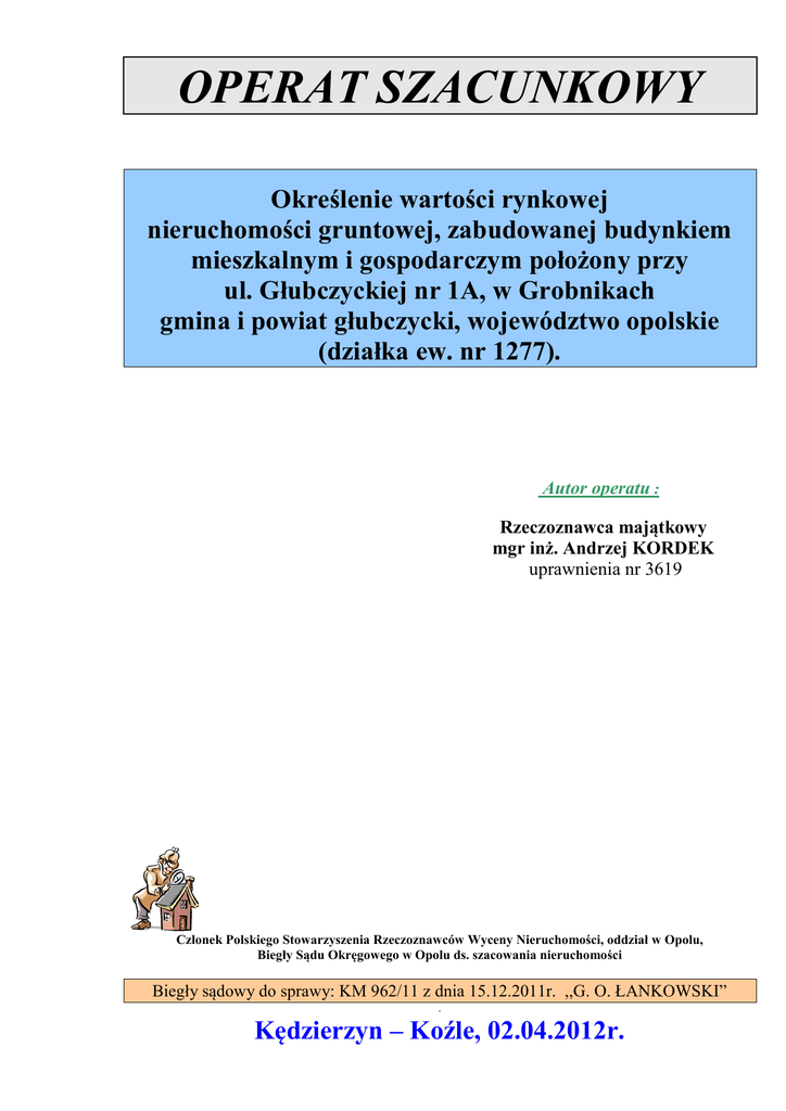 OPERAT SZACUNKOWY Określenie wartości rynkowej nieruchomości gruntowej, zabudowanej budynkiem mieszkalnym i gospodarczym położony przy ul. Głubczyckiej nr 1A, w Grobnikach gmina i powiat głubczycki, województwo opolskie (działka ew. nr 1277). Autor operatu : Rzeczoznawca majątkowy mgr inż. Andrzej KORDEK uprawnienia nr 3619 Członek Polskiego Stowarzyszenia Rzeczoznawców Wyceny Nieruchomości, oddział w Opolu, Biegły Sądu Okręgowego w Opolu ds. szacowania nieruchomości Biegły sądowy do sprawy: KM 962/11 z dnia 15.12.2011r. ,,G. O. ŁANKOWSKI” . Kędzierzyn – Koźle, 02.04.2012r. Nieruchomość gruntowa, zabudowana ul. Głubczycka 1A, Grobniki, gmina i powiat Głubczyce (dz. ew. nr 1277). Strona nr 1 WYCIĄG Z OPERATU SZACUNKOWEGO Opis nieruchomości Cel wyceny Nieruchomość gruntowa zabudowana budynkiem mieszkalnym jednorodzinnym wolnostojącym o Pu = 147,87 m2 oraz budynkiem gospodarczym i wiatą, położona w Głubczycach – Grobnik przy ul. Głubczyckiej 1A (działka ew. nr 1277 o powierzchni 0,0700 ha). Sporządzenie opisu i oszacowania komornika sądowego w/w nieruchomości. Osoby, którym przysługują Właściciel lokalu – Grażyna i Oleg ŁANKOWSCY prawa do nieruchomości Oszacowana wartość rynkowa prawa własności nieruchomości 220 000,- zł Słownie: dwieście dwadzieścia tysięcy złotych Rzeczoznawca majątkowy mgr inż. Andrzej KORDEK uprawnienia nr 3619 Autor operatu Członek Polskiego Stowarzyszenia Rzeczoznawców Wyceny Nieruchomości, oddział w Opolu Data określenia wartości 02 kwiecień 2012r. Rzeczoznawca Majątkowy mgr inż. Andrzej KORDEK uprawnienia nr 3619 Kędzierzyn – Koźle, 47 – 224 ul. Niezapominajek 12 tel. 077-48-379-43, 501-35-90-75 Nieruchomość gruntowa, zabudowana ul. Głubczycka 1A, Grobniki, gmina i powiat Głubczyce (dz. ew. nr 1277). Strona nr 2 SPIS TREŚCI 1. Przedmiot i zakres wyceny. ____________________________________________________ 3 2. Cel wyceny. ________________________________________________________________ 3 3. Podstawy formalne wyceny. ___________________________________________________ 3 3.1. Podstawy formalne – Zamawiający. ______________________________________________ 3 3.2. Podstawy prawne. _____________________________________________________________ 3 3.4. Źródła danych merytorycznych. _________________________________________________ 4 4. Określenie dat istotnych dla operatu szacunkowego. _______________________________ 4 5. Opis stanu nieruchomości. ____________________________________________________ 4 5.1. Stan prawny. _________________________________________________________________ 4 5.2. Lokalizacja, otoczenie i informacje ogólne. _________________________________________ 5 5.2.1. Stan techniczno – użytkowy budynku – lokalu użytkowego. _______________________________ 6 5.2.2. Ustalenie stopnia zużycia technicznego Sz (wg kryteriów). ________________________________ 9 6. Przeznaczenie w planie zagospodarowania przestrzennego. _________________________ 10 7. Wskazanie rodzaju określanej wartości, wyboru podejścia, metody i techniki szacowania. 11 7.1. Wskazanie rodzaju określanej wartości. __________________________________________ 11 7.2. Wybór podejścia i metody i techniki wyceny. ______________________________________ 11 8. Analiza i charakterystyka rynku nieruchomości. _________________________________ 11 8.1. Badanie wpływu czasu na wartość. ______________________________________________ 12 9. Określenie wartości nieruchomości. ___________________________________________ 12 9.1. Ocena rynku w aspekcie cech rynkowych. ________________________________________ 12 9.2. Charakterystyka szacowanej nieruchomości w aspekcie cech rynkowych. ______________ 13 10. Wynik końcowy. __________________________________________________________ 14 10.1 Wnioski z dokonanych obliczeń.________________________________________________ 14 11. Klauzule i zastrzeżenia. _____________________________________________________ 14 12. Załączniki. _______________________________________________________________ 15 Rzeczoznawca Majątkowy mgr inż. Andrzej KORDEK uprawnienia nr 3619 Kędzierzyn – Koźle, 47 – 224 ul. Niezapominajek 12 tel. 077-48-379-43, 501-35-90-75 Nieruchomość gruntowa, zabudowana ul. Głubczycka 1A, Grobniki, gmina i powiat Głubczyce (dz. ew. nr 1277). Strona nr 3 1. Przedmiot i zakres wyceny. Przedmiotem wyceny jest nieruchomość gruntowa zabudowana budynkiem mieszkalnym jednorodzinnym wolnostojącym o Pu = 147,87 m2 oraz budynkiem gospodarczym i wiatą położona w Głubczycach – Grobnik przy ul. Głubczyckiej 1 (działka ew. nr 1277 o powierzchni 0,0700 ha). Dla wycenianej nieruchomości gruntowej zabudowanej urządzona jest księga wieczysta OP1G/ 00016234/1 prowadzona przez Sąd Rejonowy w Głubczycach. Zakres wyceny: jest określenie wartości rynkowej prawa własności w/w nieruchomości. 2. Cel wyceny. Sporządzenie opisu i oszacowania komornika sądowego. 3. Podstawy formalne wyceny. 3.1. Podstawy formalne – Zamawiający. Zamawiającym wycenę jest Komornik Sądowy przy Sądzie Rejonowym w Głubczycach, ul. Gdańska 5/6, zlecenie do sprawy KM 962/11 z dnia 15.12.2011r. 3.2. Podstawy prawne. - Ustawa z dnia 21 sierpnia 1997r. o gospodarce nieruchomościami (tekst jednolity - Dz. U. z 2010 nr 102, poz. 651), - Rozporządzenie Rady Ministrów z dnia 21 września 2004r. w sprawie wyceny nieruchomości i sporządzania operatu szacunkowego (Dz. U. nr 165 poz. 985, 2011r.), - Rozporządzenie Ministra Sprawiedliwości z 09 marca 1968r. w sprawie czynności komorników (Dz. U. Nr 10, poz. 52, za § 130 ust.3 i § 46 z późniejszymi zmianami). 3.3. Podstawy metodologiczne. • Powszechne Krajowe Zasady Wyceny (PKZW) (Uchwała Rady Krajowej z dnia 13 grudnia 2007r.), • M. Prystupa – „Wycena nieruchomości metodą porównawczą” – wyd. przez PFSRM, Warszawa 1997r., • E. Kucharska -Stasiak – „Nieruchomość a rynek” – Wydawnictwo