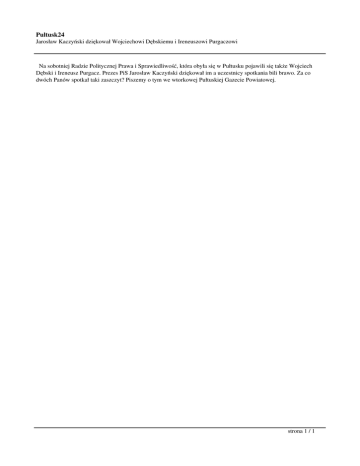 Pultusk24 Jarosław Kaczyński dziękował Wojciechowi Dębskiemu i Ireneuszowi Purgaczowi Na sobotniej Radzie Politycznej Prawa i Sprawiedliwość, która obyła się w Pułtusku pojawili się także Wojciech Dębski i Ireneusz Purgacz. Prezes PiS Jarosław Kaczyński dziękował im a uczestnicy spotkania bili brawo. Za co dwóch Panów spotkał taki zaszczyt? Piszemy o tym we wtorkowej Pułtuskiej Gazecie Powiatowej. strona 1 / 1