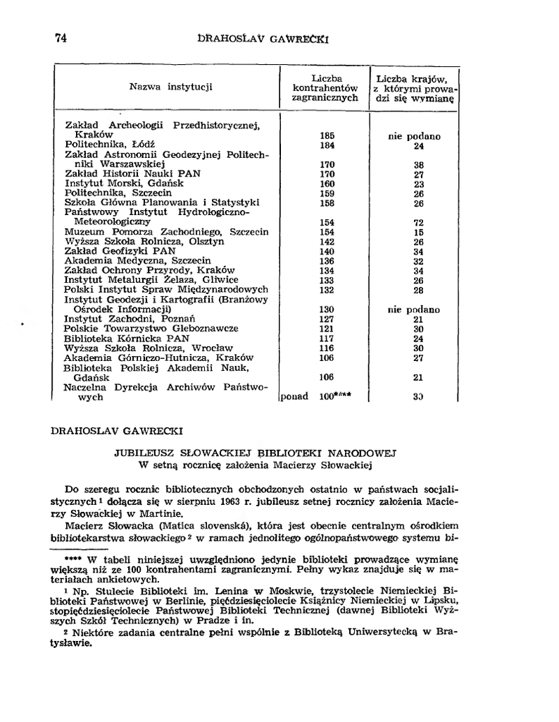 74 Ł>Ra HOSŁ a V G A W R E C K I Nazwa instytu cji Zakład A rch eolog ii P rzedhistorycznej, K ra k ów P olitechnika, Łódź Z akład A stronom ii G eod ezyjn ej P olitech niki W arszaw skiej Zakład H istorii N auki P A N Instytut M orski, G dańsk Politechnika, S zczecin Szkoła G łów n a P lanow ania i Statystyki P a ń stw ow y Instytut H yd rologiczn oM eteorologiczn y M uzeum Pom orza Zach odniego, Szczecin W yższa S zkoła R olnicza, Olsztyn Zakład G eofizyk i P A N A kadem ia M edyczna, S zczecin Za k ła d O ch ron y P rzyrod y, K rak ów Instytut M etalu rgii Żelaza, G liw ice P olsk i Instytut S praw M iędzynarodow ych Instytut G eod ezji i K a rtogra fii (Branżowy O środek In form a cji) Instytut Zach od ni, Poznań P olsk ie T ow a rzy stw o G leboznaw cze B ibliotek a K órn ick a P A N W yższa Szkoła R olnicza, W rocła w A k a dem ia G órniczo-H utnicza, K rak ów B ibliotek a P olsk iej A kadem ii Nauk, Gdańsk N aczelna D y rek cja A rch iw ó w P a ń stw o w y ch Liczba kontrahentów zagranicznych 185 184 nie podano 24 170 170 160 159 158 38 27 23 26 26 154 154 142 140 136 134 133 132 72 15 26 34 32 34 26 28 130 127 121 117 116 106 pouad L iczba krajów , z którym i p row a dzi się w ym ianę nie podano 21 30 24 30 27 106 21 100**** 30 DRAH OSLAV GAW RECKI JU B ILE U SZ S Ł O W A C K IE J B IB L IO T E K I N AR O D O W E J W setną roczn icę założenia M acierzy S łow ackiej D o szeregu roczn ic b ibliotecznych ob ch od zon ych ostatnio w państw ach so cja li stycznych 1 d ołącza się w sierpniu 1963 r. ju b ileu sz setnej roczn icy założenia M a cie rz y S łow ack iej w M artinie. M a cierz S łow ack a (M atica slovenska), k tóra jest o b ecn ie centralnym ośrodkiem bibliotekarstw a s łow a ck iego 2 w ram ach jed n olitego ogóln opa ń stw ow eg o system u b i **** W tabeli n in iejszej uw zg lęd n ion o jedy n ie b ibliotek i prow ad zą ce w ym ianę w iększą niż ze 100 kontrahen tam i zagranicznym i. P ełn y w y k a z znajd uje się w m a teriałach ankietow ych. 1 Np. S tu lecie B ib liotek i im. Lenina w M oskw ie, trzystolecie N iem ieckiej B i b liotek i P a ń stw ow ej w B erlinie, p ięćd ziesięciolecie K siążnicy N iem ieckiej w Lipsku, stop ięćd ziesięciolecie P a ń stw ow ej B ib liotek i T ech nicznej (daw nej B ib liotek i W yż szych S zkół T ech nicznych) w P ra d ze i in. 2 N iektóre zadania cen traln e p ełn i w sp óln ie z B ibliotek ą U niw ersytecką w B ra tysław ie. JUBILEUSZ M A C IE R ZY SŁOW ACKIEJ 75 bliotekarstw a czechosłowackiego, była także w przeszłości najpierwszą i najw aż niejszą instytucją kulturalną narodu słow ackiego. Od ch w ili je j założenia w r. 1863 ześrodkowały się w niej narodow e dążenia ludu słow ackiego, żyjącego w ów czas w w arunkach niew oli politycznej w granicach ów czesnych W ęgier, stanow iących część m onarchii austro-w ęgierskiej. M acierz S ło w acka stała się od początku sym bolem jedn ości słow ackiej, ośrodkiem w a lki kul turalnej i gospodarczej o nieprzem ijające praw a narodu do samoistnego rozw oju. Jej w p ływ y sięgały daleko poza granice etnicznego terytorium narodow ego, do sło w ackich skupisk em igracyjnych w krajach europejskich i zamorskich. N ajbardziej postępow ą rolę odegrała M acierz Słow acka w pierwszym okresie sw ego istnienia w latach 1863— 1875, a głów ne je j zasługi polegały na szerzeniu kultury narodow ej i uświadomienia narodow ego w okresie niewoli. M acierz Sło w acka w ydaw ała książki dla ludu, pom agała w zakładaniu spółdzielni gospodar czych i szkół, dbała o rozw ój m łodej nauki słow ackiej, zwłaszcza w zakresie nauk społecznych, zajm ow ała się działalnością kulturalno-ośw iatow ą i w ychow aw czą w śród ludu, zasłużyła się grom adzeniem zabytków m aterialnej i duchow ej kultury słow ackiej, przyczyniła się d o ustalenia ogólnonarodow ego języka słowackiego, do ukształtowania języka literackiego. M acierz Słow acka udzielała zasiłków i stypen d iów studentom, szkołom średnim , gminom, była inicjatorką założenia Słow ackiej K asy Oszczędności, drukarni, w ydaw ała słow ackie dzienniki, czasopisma i książki, organizow ała ożyw ion y i tw órczy ruch literacki i kulturalny, sięgający do najszer szych m as ludu słow ackiego, podtrzym yw ała i ow ocn ie rozw ijała ideę wzajem ności słow iańskiej i braterstw a S łow aków i Czechów. W ażnym osiągnięciem M acierzy b y ło założę ie B iblioteki (Biblioteka M atice slovenske), której zbiory tworzą p od staw ow y z ,sób Słow ackiej B iblioteki N arodow ej i literackiego archiw um piśm ien nictw a słowackiego.Jako ośrodek m yśli i kultury słow ackiej M acierz skutecznie przyczyniała się do och rony narodu słow ackiego przed w ynarodow ieniem . Dlatego^ w łaśnie ówczesne władze w ęgierskie przym usow o zawiesiły! jej działalność w r. 1875. A le postępowe tra d y cje M acierzy zostały p od jęte przez inne organ izacje i stowarzyszenia, które pow stały p o je j rozwiązaniu przez o b ce w ładze; b yły to na przykład: Słow ackie Stow arzyszenie Muzealne, U działow a Spółka W ydaw nicza i S łow ackie K oło Śpie wacze. O' roli M acierzy S łow ackiej i o je j znaczeniu dla S łow acji świadczy fakt, że p o powstaniu niepodległej C zechosłow acji p o pierw szej w ojn ie św iatow ej M acierz S łow acka została zaszczytnie reaktyw ow ana jednym z pierw szych dekretów ów czesnego m inistra dla spraw S ło w a c ji Odnow iona M acierz Słow acka nawiązała d o sw ych daw niejszych tradycji. M iało to jednak obok dodatnich także częściowo pew n e strony ujem ne. S ytuacja społeczna była przecież zupełnie inna, niż w ok re sie początkow ej działalności M acierzy w siódm ym i ósm ym dziesięcioleciu w ie ku X I X . Cały okres istnienia M acierzy S łow ackiej m iędzy dw om a w ojnam i świa tow ym i, czyli