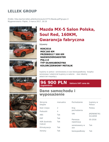 LELLEK GROUP Źródło: http://portal.lellek.pl/lel/komis/auto13772,Mazda.pdf?grupa=3 Wygenerowano: Piątek, 3 marca 2017, 16:16 Mazda MX-5 Salon Polska, Soul Red, 160KM, Gwarancja fabryczna Używany ROK2016 MOC160 KM PRZEBIEG17 500 KM NADWOZIEROADSTER POJ.2.0 TYP SILNIKABENZYNA KOLORCZERWONY METALIK kupiony w polsce serwisowany w aso bezwypadkowy książka serwisowa I właściciel kupiony w salonie stan idealny właściciel niepalący 96 900 PLN faktura VAT cena do uzgodnienia Dane samochodu i wyposażenie Skrzynia biegów manualna Pochodzenie kupiony w Polsce Ilość miejsc 2 Polska Poduszki 4 Kraj pochodzenia ABS Tak VIN JMZND6E761 0114059 ESP Tak Tak Pierwsza rejestracja 05-2016 ASR (kontrola trakcji) Tak serwisowany w aso Tak Klimatyzacja Xenony Tak bezwypadkowy Tak Elektryczne szyby Tak garażowany Tak Elektryczne lusterka Tak książka serwisowa I właściciel Tak Wspomaganie kierownicy Tak kupiony w salonie Tak Komputer Tak Radioodtwarza cz Tak Alarm Tak Immobilizer Tak Centralny zamek Tak Światła przeciwmgieln e Tak Kierownica wielofunkcyjna Tak Podgrzewane fotele Tak Tempomat Tak Asystent pasa ruchu Tak Bluetooth Tak Napęd tylny Tak Światła LED Tak Alufelgi 17" Miejsce postoju Sopot tunning homologacja stan idealny Tak właściciel niepalący Tak Opis dodatkowy Kupując w „Porsche Centrum Sopot Auto Lellek Group” otrzymujesz: - Pewność - Bezpieczeństwo Mazda MX-5 2.0 160KM z 6 biegową skrzynią manualną w przepięknym kolorze Soul Red. Kolor lakieru: Soul Red Wnętrze: Czarna tapicerka skórzana z czerwonymi szwami Wyposażenie: Handlowiec Kamil Proma zapytaj mobile Gwarancja Gwarancja dostępna Ubezpieczenie Ubezpieczenie dostępne Kredyt Kredyt dostępny - Asystent pasa ruchu - System monitorowania ciśnienia w oponach - Multimedialny system rozrywki i łączności MZD Connect / Bluetooth / USB - Zestaw głośno mówiący Bluetooth - Elektryczne szyby przednie - Czujnik deszczy - Czujnik zmierzchu - Poduszka powietrzna kierowcy - Poduszka powietrzna pasażera - Wspomaganie kierownicy - Światła Xenon / Led - Wielofunkcyjna skórzana kierownica - Elektrycznie ustawiane lusterka - Klimatyzacja automatyczna - Podgrzewane lusterka boczne - Centralny zamek - Komputer pokładowy - Podgrzewane przednie siedzenia - Tempomat - Czujniki ciśnienia w oponach KONTAKTY: Kamil Proma 48607567711 Sprzedawca samochodów używanych Marcin Przybyła 48 696169139 Sprzedawca samochodów używanych Informacja nie stanowi oferty w rozumieniu art. 66kc. Podane dane maja charakter wyłącznie informacyjny Zeskanuj kod, aby zobaczyć ofertę online Nota prawna Informacja nie stanowi oferty w rozumieniu art. 66 Kodeksu Cywilnego. Podane dane mają charakter wyłącznie informacyjny. Pełna informacja dostępna jest u handlowca. Sprzedający nie odpowiada za ewentualne błędy lub nieaktualność ogłoszenia.