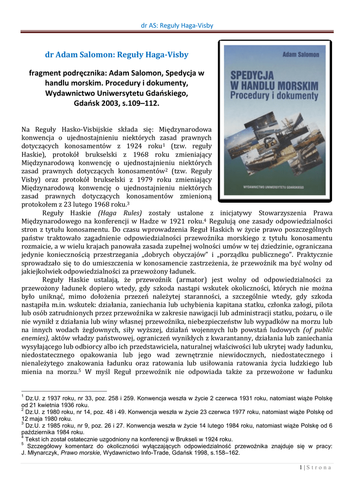 dr AS: Reguły Haga-Visby dr Adam Salomon: Reguły Haga-Visby fragment podręcznika: Adam Salomon, Spedycja w handlu morskim. Procedury i dokumenty, Wydawnictwo Uniwersytetu Gdańskiego, Gdańsk 2003, s.109–112. Na Reguły Hasko-Visbijskie składa się: Międzynarodowa konwencja o ujednostajnieniu niektórych zasad prawnych dotyczących konosamentów z 1924 roku1 (tzw. reguły Haskie), protokół brukselski z 1968 roku zmieniający Międzynarodową konwencję o ujednostajnieniu niektórych zasad prawnych dotyczących konosamentów2 (tzw. Reguły Visby) oraz protokół brukselski z 1979 roku zmieniający Międzynarodową konwencję o ujednostajnieniu niektórych zasad prawnych dotyczących konosamentów zmienioną protokołem z 23 lutego 1968 roku.3 Reguły Haskie (Haga Rules) zostały ustalone z inicjatywy Stowarzyszenia Prawa Międzynarodowego na konferencji w Hadze w 1921 roku.4 Regulują one zasady odpowiedzialności stron z tytułu konosamentu. Do czasu wprowadzenia Reguł Haskich w życie prawo poszczególnych państw traktowało zagadnienie odpowiedzialności przewoźnika morskiego z tytułu konosamentu rozmaicie, a w wielu krajach panowała zasada zupełnej wolności umów w tej dziedzinie, ograniczana jedynie koniecznością przestrzegania „dobrych obyczajów” i „porządku publicznego”. Praktycznie sprowadzało się to do umieszczenia w konosamencie zastrzeżenia, że przewoźnik ma być wolny od jakiejkolwiek odpowiedzialności za przewożony ładunek. Reguły Haskie ustalają, że przewoźnik (armator) jest wolny od odpowiedzialności za przewożony ładunek dopiero wtedy, gdy szkoda nastąpi wskutek okoliczności, których nie można było uniknąć, mimo dołożenia przezeń należytej staranności, a szczególnie wtedy, gdy szkoda nastąpiła m.in. wskutek: działania, zaniechania lub uchybienia kapitana statku, członka załogi, pilota lub osób zatrudnionych przez przewoźnika w zakresie nawigacji lub administracji statku, pożaru, o ile nie wynikł z działania lub winy własnej przewoźnika, niebezpieczeństw lub wypadków na morzu lub na innych wodach żeglownych, siły wyższej, działań wojennych lub powstań ludowych (of public enemies), aktów władzy państwowej, ograniczeń wynikłych z kwarantanny, działania lub zaniechania wysyłającego lub odbiorcy albo ich przedstawiciela, naturalnej właściwości lub ukrytej wady ładunku, niedostatecznego opakowania lub jego wad zewnętrznie niewidocznych, niedostatecznego i nienależytego znakowania ładunku oraz ratowania lub usiłowania ratowania życia ludzkiego lub mienia na morzu.5 W myśl Reguł przewoźnik nie odpowiada także za przewożone w ładunku 1 Dz.U. z 1937 roku, nr 33, poz. 258 i 259. Konwencja weszła w życie 2 czerwca 1931 roku, natomiast wiąże Polskę od 21 kwietnia 1936 roku. 2 Dz.U. z 1980 roku, nr 14, poz. 48 i 49. Konwencja weszła w życie 23 czerwca 1977 roku, natomiast wiąże Polskę od 12 maja 1980 roku. 3 Dz.U. z 1985 roku, nr 9, poz. 26 i 27. Konwencja weszła w życie 14 lutego 1984 roku, natomiast wiąże Polskę od 6 października 1984 roku. 4 Tekst ich został ostatecznie uzgodniony na konferencji w Brukseli w 1924 roku. 5 Szczegółowy komentarz do okoliczności wyłączających odpowiedzialność przewoźnika znajduje się w pracy: J. Młynarczyk, Prawo morskie, Wydawnictwo Info-Trade, Gdańsk 1998, s.158–162. 1|S tr o na dr AS: Reguły Haga-Visby kosztowności, pieniądze, papiery wartościowe, dzieła sztuki i inne cenne przedmioty, o ile rodzaj i wartość ich nie zostały zgłoszone kapitanowi przy załadunku. Kwestia wysokości odszkodowania została unormowana następująco: 1. odszkodowanie za utratę ładunku określa się według zwykłej wartości rzeczy; 2. odszkodowanie za uszkodzenie ładunku określa się według różnicy między zwykłą wartością ładunku wstanie nie uszkodzonym a uszkodzonym; 3. dla ustalenia wysokości szkody miarodajna jest wartość ładunku w miejscu i w czasie, w którym został on lub powinien być wyładowany ze statku zgodnie z umową przewozu; 4. wartość ładunku określa się według ceny giełdy towarowej, a w razie jej braku, według bieżącej ceny rynkowej. Jeśli obu cen nie można ustalić, wartość ładunku określa się przez porównanie jej z wartością towarów takiego samego rodzaju i jakości. Przy przewozie na podstawie konosamentu, w którym wartość ładunku nie została uwidoczniona, odszkodowanie za utratę lub uszkodzenie jednej sztuki ładunku lub innej zwyczajowo w handlu przyjętej jednostki ładunku nie może przekroczyć kwoty obliczonej według zasad ustalonych w tym przedmiocie w umowie międzynarodowej . Obok możliwości całkowitego zwolnienia się od odpowiedzialności za szkody ładunkowe przewoźnik morski korzysta często w praktyce z dobrodziejstwa ustawowego ograniczenia wysokości odszkodowania (tzw. ograniczenia odpowiedzialności). W konsekwencji ograniczenia wysokości odszkodowania zobowiązany do zapłacenia odszkodowania dłużnik świadczy do wskazanego limitu nawet wówczas, gdy wysokość szkody granicę taką przekracza. 6 Ta minimalna odpowiedzialność przewoźnika nie może już zostać ograniczona. Limit odpowiedzialności przewoźnika ustalony został na poziomie 100 funtów w złocie za pakunek lub jednostkę ładunku, przy czym na mocy porozumienia pomiędzy przewoźnikiem a załadowcą limit ten może zostać podwyższony. Jeżeli przewoźnik przyjął ładunek do przewozu wzdłuż trasy leżącej częściowo poza zasięgiem jego działalności lub nie mającej bezpośredniego połączenia drogą morską z portem przeznaczenia, może oddać ładunek do przewozu innemu przewoźnikowi na poszczególne odcinki trasy, nawet gdyby przewóz miał się tam odbyć inną drogą niż morską, jednakże odpowiada wtedy za wszystkich przewoźników, aż do wydania ładunku odbiorcy. Natomiast przewoźnicy ci odpowiadają solidarnie za wykonanie całego przewozu. Ponadto Reguł