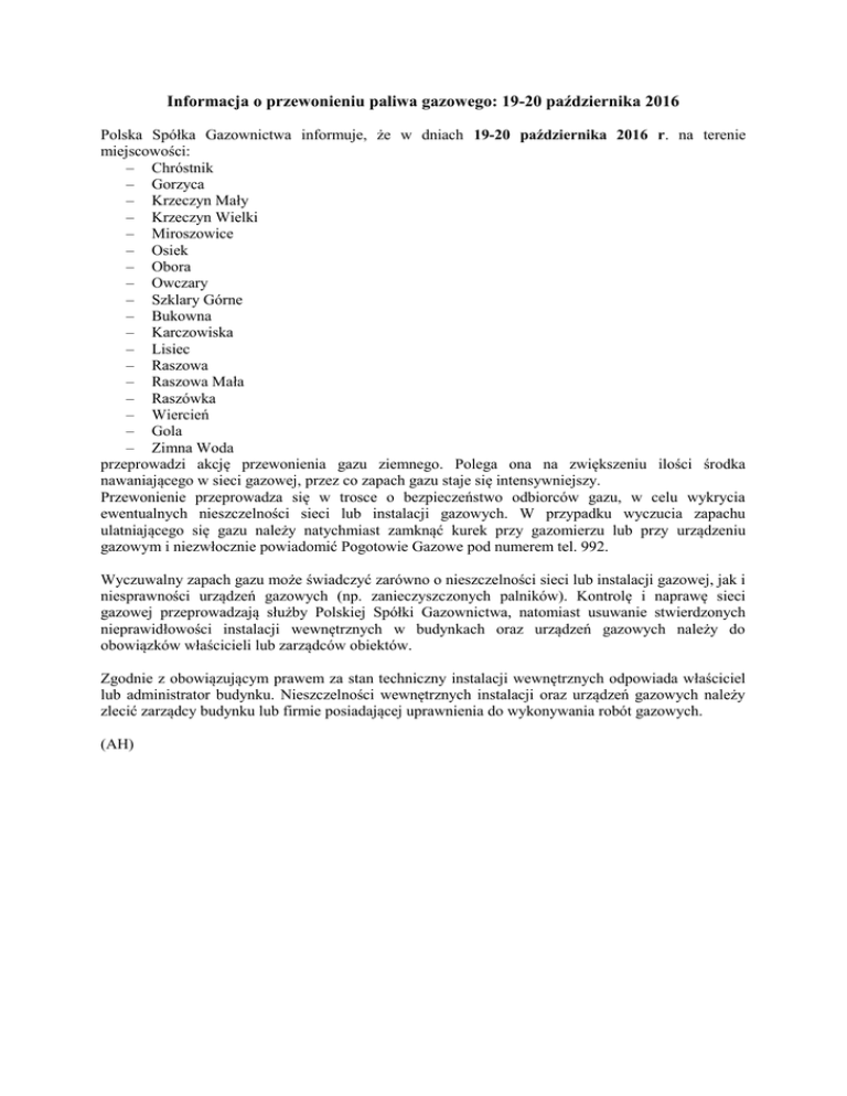 Informacja o przewonieniu paliwa gazowego: 19-20 października 2016 Polska Spółka Gazownictwa informuje, że w dniach 19-20 października 2016 r. na terenie miejscowości: – Chróstnik – Gorzyca – Krzeczyn Mały – Krzeczyn Wielki – Miroszowice – Osiek – Obora – Owczary – Szklary Górne – Bukowna – Karczowiska – Lisiec – Raszowa – Raszowa Mała – Raszówka – Wiercień – Gola – Zimna Woda przeprowadzi akcję przewonienia gazu ziemnego. Polega ona na zwiększeniu ilości środka nawaniającego w sieci gazowej, przez co zapach gazu staje się intensywniejszy. Przewonienie przeprowadza się w trosce o bezpieczeństwo odbiorców gazu, w celu wykrycia ewentualnych nieszczelności sieci lub instalacji gazowych. W przypadku wyczucia zapachu ulatniającego się gazu należy natychmiast zamknąć kurek przy gazomierzu lub przy urządzeniu gazowym i niezwłocznie powiadomić Pogotowie Gazowe pod numerem tel. 992. Wyczuwalny zapach gazu może świadczyć zarówno o nieszczelności sieci lub instalacji gazowej, jak i niesprawności urządzeń gazowych (np. zanieczyszczonych palników). Kontrolę i naprawę sieci gazowej przeprowadzają służby Polskiej Spółki Gazownictwa, natomiast usuwanie stwierdzonych nieprawidłowości instalacji wewnętrznych w budynkach oraz urządzeń gazowych należy do obowiązków właścicieli lub zarządców obiektów. Zgodnie z obowiązującym prawem za stan techniczny instalacji wewnętrznych odpowiada właściciel lub administrator budynku. Nieszczelności wewnętrznych instalacji oraz urządzeń gazowych należy zlecić zarządcy budynku lub firmie posiadającej uprawnienia do wykonywania robót gazowych. (AH)
