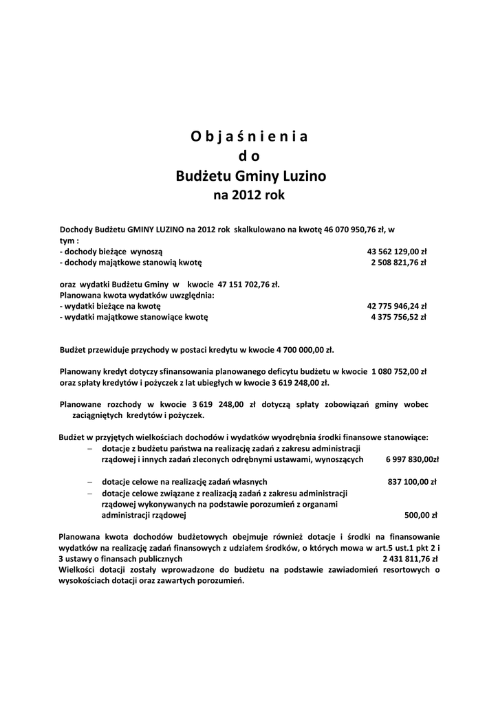 Objaśnienia do Budżetu Gminy Luzino na 2012 rok Dochody Budżetu GMINY LUZINO na 2012 rok skalkulowano na kwotę 46 070 950,76 zł, w tym : - dochody bieżące wynoszą 43 562 129,00 zł - dochody majątkowe stanowią kwotę 2 508 821,76 zł oraz wydatki Budżetu Gminy w kwocie 47 151 702,76 zł. Planowana kwota wydatków uwzględnia: - wydatki bieżące na kwotę - wydatki majątkowe stanowiące kwotę 42 775 946,24 zł 4 375 756,52 zł Budżet przewiduje przychody w postaci kredytu w kwocie 4 700 000,00 zł. Planowany kredyt dotyczy sfinansowania planowanego deficytu budżetu w kwocie 1 080 752,00 zł oraz spłaty kredytów i pożyczek z lat ubiegłych w kwocie 3 619 248,00 zł. Planowane rozchody w kwocie 3 619 248,00 zł dotyczą spłaty zobowiązań gminy wobec zaciągniętych kredytów i pożyczek. Budżet w przyjętych wielkościach dochodów i wydatków wyodrębnia środki finansowe stanowiące: − dotacje z budżetu państwa na realizację zadań z zakresu administracji rządowej i innych zadań zleconych odrębnymi ustawami, wynoszących 6 997 830,00zł − − dotacje celowe na realizację zadań własnych dotacje celowe związane z realizacją zadań z zakresu administracji rządowej wykonywanych na podstawie porozumień z organami administracji rządowej 837 100,00 zł 500,00 zł Planowana kwota dochodów budżetowych obejmuje również dotacje i środki na finansowanie wydatków na realizację zadań finansowych z udziałem środków, o których mowa w art.5 ust.1 pkt 2 i 3 ustawy o finansach publicznych 2 431 811,76 zł Wielkości dotacji zostały wprowadzone do budżetu na podstawie zawiadomień resortowych o wysokościach dotacji oraz zawartych porozumień. Roczna planowana kwota subwencji ogólnej na 2012 rok według informacji Ministerstwa Finansów wyniesie 22 082 486,00 zł, z wyodrębnieniem : - części wyrównawczej 4 939 941,00 zł - części oświatowej 17 142 545,00 zł Pozostałą kwotę planowanych dochodów stanowią dochody własne wynoszące 13 721 223,00 zł. Budżet uwzględnia planowane dochody z tytułu udziału gminy we wpływach z podatku dochodowego od osób fizycznych zgodnie z informacją Ministerstwa Finansów w kwocie 5 044 776,00 zł. Informacja zawiera określenie, że wymieniona kwota nie ma charakteru dyrektywnego, a jedynie informacyjno – szacunkowy na podstawie szacunków i prognoz. Realizacja tych dochodów może ulec zwiększeniu lub zmniejszeniu , w porównaniu z planem określonym w projekcie ustawy budżetowej, z powodów, na które Minister Finansów nie ma bezpośredniego wpływu. Należy nadmienić, że wysokość udziału gmin we wpływach z podatku dochodowego od osób fizycznych /PIT/, od podatników tego podatku zamieszkałych na obszarze gminy wynosić będzie 37,26 %. Budżet gminy na 2012 rok, uwzględnia wielkości podatków i opłat wynikających z ewidencji finansowej przy zastosowaniu wielkości wskaźnika wzrostu maksymalnych stawek, określonych przez Ministra Finansów w Obwieszczeniach w sprawie górnych granic stawek kwotowych podatków i opłat dla każdego podatku czy opłaty odrębnie. Budżet określa prognozowane dochody według źródeł i działów klasyfikacji w podziale na dochody bieżące i majątkowe. Projekt Budżetu 2012 roku w zakresie dochodów majątkowych określa kwotę 550 000,00 zł, stanowiącą wpłaty z tytułu odpłatnego nabycia prawa własności nieruchomości. Według informacji Ministerstwa Finansów, przy opracowaniu projektu ustawy budżetowej na 2012 r. przyjęto : - prognozowany średnioroczny wskaźnik cen towarów i usług konsumpcyjnych w wysokości 102,8%, - średnioroczny wskaźnik wzrostu wynagrodzeń w państwowej sferze budżetowej w wysokości 100,0 %, - planowana podwyżka wynagrodzeń dla nauczycieli o 3,8 % od miesiąca września 2012 roku, - wysokość obowiązkowych składek na Fundusz Pracy nie ulegnie zmianie i wynosić będzie 2,45% podstawy ich wymiaru. Określone w Budżecie Gminy Luzino na 2012 rok, dochody jak i wydatki uwzględniają przyjęte wskaźniki przy opracowywaniu projektu ustawy budżetowej na 2012 rok z tym, że dokonano ograniczeń wydatków rzeczowych we wszystkich działach budżetu gminy. Zabezpiecza się planowaną podwyżkę wynagrodzeń dla nauczycieli o 3,8 % od miesiąca września 2012 roku oraz wzrost wynagrodzeń w samorządowej sferze budżetowej o 3,0 %. Budżet w swych wielkościach zabezpiecza środki finansowe na pokrycie kosztów dotacji dla jednostek samorządu terytorialnego w zakresie kosztów pobytu dzieci z terenu naszej gminy w niepublicznych placówkach opiekuńczo – wychowawczych poza terenem naszej gminy – 115 600,00 zł. Zgodnie z Ustawą o Systemie Oświaty budżet przewiduje dotacje, dla Przedszkola Niepublicznego w Luzinie / 48 dzieci / i Punktu Przedszkolnego zlokalizowanego w Kębłowie /25 dzieci/ w łącznej kwocie wynoszącej 198 424,00 zł. Budżet Gminy na 2012 rok obejmuje dotacje dla instytucji kultury: - Gminnej Biblioteki Publicznej 427 651,000 zł - Gminnego Ośrodka Kultury 447 278,00 zł Dotacja dla Gminnej Biblioteki Publicznej obejmuje kwotę 60 000,00 zł, stanowiącej dofinansowanie remontu i modernizacji budynku głównego oraz małej architektury wokół budynku, adaptacja kotłowni na pomieszczenia do digitalizacji Cyfrowego Archiwum Tradycji Lokalnych, przystosowanie toalet dla niepełnosprawnych, wymiana podłogi w filii, adaptacja przyległej posesji na letnią czytelnię, realizowanego w ramach Programu Wieloletniego „Biblioteka + Infrastruktura Bibliotek” ze środków finansowych Ministra Kultury i Dziedzictwa Narodowego, pochodzących z budżetu państwa. W ramach dotacji z budżetu dla instytucji Kultury – Gminnego Ośrodka Kultury przewiduje się organizację imprez kulturalnych w gminie: - Koncert „Gwiazda muzyki rozrywkowej” w Hali WidowiskowoSportowej w Luzinie 15 000,00 zł - Konkurs Rodna Mowa – gminny i rejonowy 1 500,00 zł - sobótki 10 000,00 zł - przegląd Talen