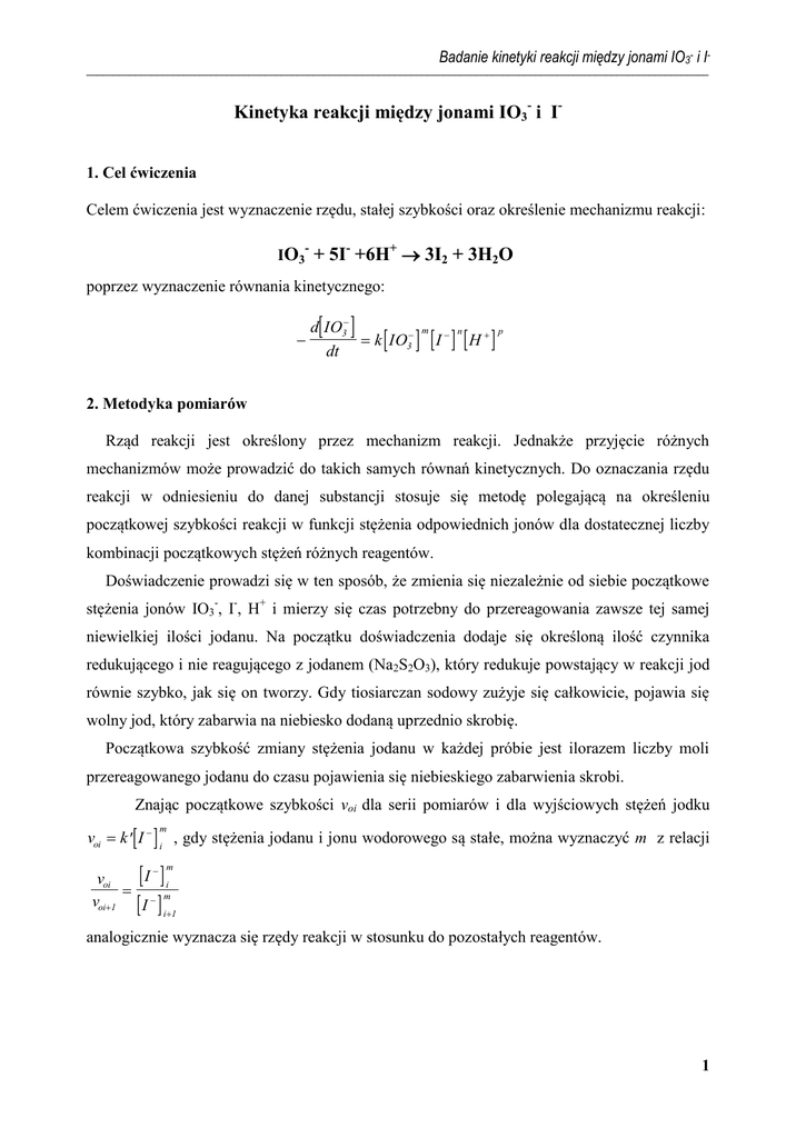Badanie kinetyki reakcji między jonami IO3- i I___________________________________________________________________________________________________________________ Kinetyka reakcji między jonami IO3- i I1. Cel ćwiczenia Celem ćwiczenia jest wyznaczenie rzędu, stałej szybkości oraz określenie mechanizmu reakcji: IO3 + 5I +6H 3I2 + 3H2O - - + poprzez wyznaczenie równania kinetycznego: d IO3 m n p k IO3 I H dt 2. Metodyka pomiarów Rząd reakcji jest określony przez mechanizm reakcji. Jednakże przyjęcie różnych mechanizmów może prowadzić do takich samych równań kinetycznych. Do oznaczania rzędu reakcji w odniesieniu do danej substancji stosuje się metodę polegającą na określeniu początkowej szybkości reakcji w funkcji stężenia odpowiednich jonów dla dostatecznej liczby kombinacji początkowych stężeń różnych reagentów. Doświadczenie prowadzi się w ten sposób, że zmienia się niezależnie od siebie początkowe stężenia jonów IO3-, I-, H+ i mierzy się czas potrzebny do przereagowania zawsze tej samej niewielkiej ilości jodanu. Na początku doświadczenia dodaje się określoną ilość czynnika redukującego i nie reagującego z jodanem (Na2S2O3), który redukuje powstający w reakcji jod równie szybko, jak się on tworzy. Gdy tiosiarczan sodowy zużyje się całkowicie, pojawia się wolny jod, który zabarwia na niebiesko dodaną uprzednio skrobię. Początkowa szybkość zmiany stężenia jodanu w każdej próbie jest ilorazem liczby moli przereagowanego jodanu do czasu pojawienia się niebieskiego zabarwienia skrobi. Znając początkowe szybkości voi dla serii pomiarów i dla wyjściowych stężeń jodku voi k I i , gdy stężenia jodanu i jonu wodorowego są stałe, można wyznaczyć m z relacji m I i voi voi1 I m i 1 m analogicznie wyznacza się rzędy reakcji w stosunku do pozostałych reagentów. 1 Badanie kinetyki reakcji między jonami IO3- i I___________________________________________________________________________________________________________________ 3. Wykaz sprzętu i odczynników I. Sprzęt: II. Odczynniki 1. mieszadło magnetyczne (1 szt), 1. KIO3 (0,1 M) element mieszający (1 szt) 2. KI (0,2 M) 2. stoper (1 szt) 3. Na2S2O3 (0,01 M) 3. kolbka stożkowa 200 cm3 (6 szt) 4. Bufor A (kwas octowy + octan sodowy) pH = 5,16 4. zlewka 100 cm3 (6 szt) 5. Bufor B (kwas octowy + octan sodowy) pH = 4,90 3 5. zlewka 150 cm (2 szt) 6. skrobia 6. biureta 25 cm3 (3 szt) 7. biureta 50 cm3 (2 szt) 8. pipeta 5 cm3 (1 szt) 9. lejek (2 szt) 4. Wykonanie ćwiczenia 1) Do kolbki stożkowej odmierzyć kolejno za pomocą biuret: 2,5 cm3 roztworu KIO3, 27,5 cm3 buforu A i 2,5 cm3 roztworu skrobi. 2) Delikatnie wrzucić do kolbki element mieszający, umieścić na płytce mieszadła magnetycznego, włączyć mieszadło i wyregulować obroty. 3) Do zlewki odmierzyć z biurety 12,5 cm3 roztworu KI i 10 cm3 Na2S2O3. Zawartość zlewki szybko wlać do kolbki stożkowej umieszczonej na mieszadle magnetycznym, jednocześnie włączając stoper (w chwili wlania pierwszej kropli cieczy). 4) Po pewnym czasie zawartość kolbki zabarwi się na kolor niebieski, którego intensywność wzrasta z czasem. Należy uchwycić moment pojawienia się niebieskiej barwy roztworu i zatrzymać stoper. Następnie odczytać czas. Każdy pomiar wykonać dwukrotnie. 5) Wyżej wymienione czynności (punkty 1- 4) powtarzać, wprowadzając do kolbki stożkowej i zlewki kolejno objętości roztworów (w cm3) wg tabelki Kolbka zlewka 1 2 3 4 5 6 KIO3 2,5 5 7,5 2,5 2,5 2,5 Bufor A 27,5 25 22,5 21,1 33,7 - Bufor B - - - - - 27,5 Skrobia 2,5 2,5 2,5 2,5 2,5 2,5 KI 12,5 12,5 12,5 18,9 6,3 12,5 10 10 10 10 10 10 Na2S2O3 2 Badanie kinetyki reakcji między jonami IO3- i I___________________________________________________________________________________________________________________ 5. Opracowanie wyników 1. Na podstawie otrzymanych danych należy wyznaczyć rzędy reakcji względem poszczególnych reagentów, określić całkowity rząd i stałą szybkości reakcji oraz równanie kinetyczne badanej reakcji. 2. Następnie należy sprawdzić i wyjaśnić, który z podanych w literaturze mechanizmów zgadza się z otrzymanym doświadczalnie równaniem kinetycznym i przy jakich założeniach. Mechanizm tej reakcji nie jest jeszcze dokładnie wyjaśniony, w literaturze podawane są możliwe mechanizmy, np: 1) IO3- + H+ I- + H+ (szybka równowaga) HIO3 (szybka równowaga) HI HIO3 + HI HIO + HIO2 2) następnie szybkie reakcje [ Z. Phys. Chem., 136 A (1928) 186 ] IO3- + I- + 2H+ (szybka równowaga) H2I2O3 H2I2O3 I2O2 + H2O I2O2 + I- I3O2- IO3- + I- + 2H+ (szybka równowaga) (reakcja powolna) następnie szybkie reakcje 3) (reakcja powolna) H2I2O3 [ J. Am. Chem. Soc., 52 (1930) 3580 ] (szybka równowaga) H2I2O3 HIO + HIO2 (reakcja powolna) następnie szybkie reakcje [ J. Chem. Soc., 1951, 1865 ] 6. Rachunek błędu 1. Nie trzeba wykonywać rachunku niepewności wyznaczenia rzędów reakcji względem poszczególnych składników. 2. Nie trzeba liczyć niepewności wyznaczenia szybkości początkowej reakcji. 3. Jeżeli któryś z pomiarów stałej szybkości reakcji znacznie odbiega od pozostałych, należy go odrzucić przy liczeniu średniej stałej szybkości reakcji. Niepewność stałej szybkości reakcji należy obliczyć jako odchylenie standardowe średniej. 3