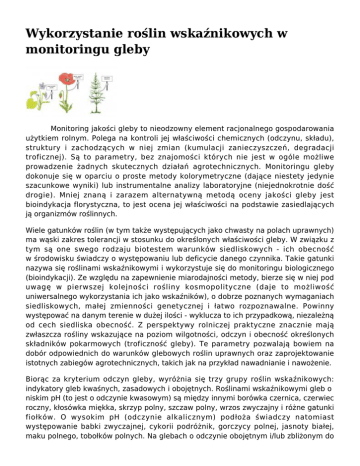 Wykorzystanie roślin wskaźnikowych w monitoringu gleby Monitoring jakości gleby to nieodzowny element racjonalnego gospodarowania użytkiem rolnym. Polega na kontroli jej właściwości chemicznych (odczynu, składu), struktury i zachodzących w niej zmian (kumulacji zanieczyszczeń, degradacji troficznej). Są to parametry, bez znajomości których nie jest w ogóle możliwe prowadzenie żadnych skutecznych działań agrotechnicznych. Monitoringu gleby dokonuje się w oparciu o proste metody kolorymetryczne (dające niestety jedynie szacunkowe wyniki) lub instrumentalne analizy laboratoryjne (niejednokrotnie dość drogie). Mniej znaną i zarazem alternatywną metodą oceny jakości gleby jest bioindykacja florystyczna, to jest ocena jej właściwości na podstawie zasiedlających ją organizmów roślinnych. Wiele gatunków roślin (w tym także występujących jako chwasty na polach uprawnych) ma wąski zakres tolerancji w stosunku do określonych właściwości gleby. W związku z tym są one swego rodzaju biotestem warunków siedliskowych - ich obecność w środowisku świadczy o występowaniu lub deficycie danego czynnika. Takie gatunki nazywa się roślinami wskaźnikowymi i wykorzystuje się do monitoringu biologicznego (bioindykacji). Ze względu na zapewnienie miarodajności metody, bierze się w niej pod uwagę w pierwszej kolejności rośliny kosmopolityczne (daje to możliwość uniwersalnego wykorzystania ich jako wskaźników), o dobrze poznanych wymaganiach siedliskowych, małej zmienności genetycznej i łatwo rozpoznawalne. Powinny występować na danym terenie w dużej ilości - wyklucza to ich przypadkową, niezależną od cech siedliska obecność. Z perspektywy rolniczej praktyczne znacznie mają zwłaszcza rośliny wskazujące na poziom wilgotności, odczyn i obecność określonych składników pokarmowych (troficzność gleby). Te parametry pozwalają bowiem na dobór odpowiednich do warunków glebowych roślin uprawnych oraz zaprojektowanie istotnych zabiegów agrotechnicznych, takich jak na przykład nawadnianie i nawożenie. Biorąc za kryterium odczyn gleby, wyróżnia się trzy grupy roślin wskaźnikowych: indykatory gleb kwaśnych, zasadowych i obojętnych. Roślinami wskaźnikowymi gleb o niskim pH (to jest o odczynie kwasowym) są między innymi borówka czernica, czerwiec roczny, kłosówka miękka, skrzyp polny, szczaw polny, wrzos zwyczajny i różne gatunki fiołków. O wysokim pH (odczynie alkalicznym) podłoża świadczy natomiast występowanie babki zwyczajnej, cykorii podróżnik, gorczycy polnej, jasnoty białej, maku polnego, tobołków polnych. Na glebach o odczynie obojętnym i/lub zbliżonym do obojętnego rosną między innymi jasnota purpurowa, przetacznik polny, tasznik pospolity. Gdy weźmiemy pod uwagę poziom wilgotności gleby, roślinami mającymi duże wymagania wodne i wskazującymi na stanowiska podmokłe są: firletka pospolita, jaskier rozłogowy, knieć błotna, kozłek lekarski, miotła zbożowa, niezapominajka polna, wiązówka i wiechlina błotna. O stanowisku suchym świadczy natomiast obecność takich gatunków roślin, jak macierzanka piaskowa, mak piaskowy, babka lancetowata i wilczomlecz sosnka. W podobny sposób można określić termiczność terenu (warunki cieplne). O stanowisku dobrze nasłonecznionym i łatwo nagrzewającym się świadczą: dziewanna firletkowa, goździk kartuzek, miłek wiosenny. Roślinami mającymi małe wymagania cieplne, występującymi na trudno nagrzewających się stanowiskach są między innymi kminek zwyczajny i skrzyp błotny. Dzięki roślinom wskaźnikowym można też z powodzeniem ocenić zasobność gleby w składniki pokarmowe. Przykładowo, jeśli na badanym terenie występuje masowo gorczyca polna, groszek bulwiasty, mak polny, miłek wiosenny, oset zwisły i szałwia łąkowa wskazuje to niezbicie na dużą zawartość w podłożu wapnia. W miejscach ubogich w ten pierwiastek będą występowały: chaber bławatek, czerwiec roczny, rumianek pospolity, szczaw polny. Gatunkami nitrofilnymi, to jest wskazującymi na zasobność gleby w związki azotu, są: pokrzywa zwyczajna, gwiazdnica pospolita, perz właściwy, jasnota biała, wiechlina roczna, żywokost lekarski. O małej ilości związków tego pierwiastka w glebie będzie świadczyła masowa obecność bliźniczki psiej trawki i fiołka wonnego. Roślinami wskazującymi na stanowiska zasobne w fosfor są: koniczyna biała, wiechlina zwyczajna, wyczyniec łąkowy. Indykatorami gleb ubogich w ten pierwiastek będą: bliźniczka psia trawka, drżączka średnia, mietlica pospolita, tomka wonna. W podobny sposób, to jest oceniając skład roślinności badanego terenu, można zmonitorować poziom obecnej w glebie próchnicy. Na glebę zasobną w substancje organiczne będzie wskazywać obecność pokrzywy żegawki, przytuli wonnej, wierzbówki kiprzycy. Indykatorami gleb ubogich w próchnicę są natomiast chroszcz nagołodygowy i prosiecznik gładki. Na tej samej zasadzie można określić rodzaj badanej gleby. Indykatorami gleb piaszczystych są zwłaszcza: szczaw polny, złocień polny, przymiotno kanadyjskie, turzyca piaskowa. Na glebie gliniastej zobaczymy łobodę rozłożystą, podbiał pospolity, szałwię łąkową, gorczycę polną. Natomiast na glebie ilastej dobrze rosną: jaskr rozłogowy, glistnik jaskółcze ziele, ostróżeczka polna, pięciornik gęsi. W fitomonitoringu bierze się pod uwagę zarówno występowanie (ilość) roślin wskaźnikowych, jak też ich wygląd (jakość). Pojawiające się u wrażliwych gatunków zmiany (nekrozy, chlorozy) mogą wskazywać na obecność w podłożu określonych zanieczyszczeń lub niedobory troficzne (degradację chemiczną gleby). W tym przypadku roślinami wskaźnikowymi są nie tylko chwasty, ale też rośliny uprawne. W monitoringu „wizualnym” - opartym na obserwacji wzrostu, rozwoju i wyglądu organizmu - indykatorem może być właściwie każda roślina.