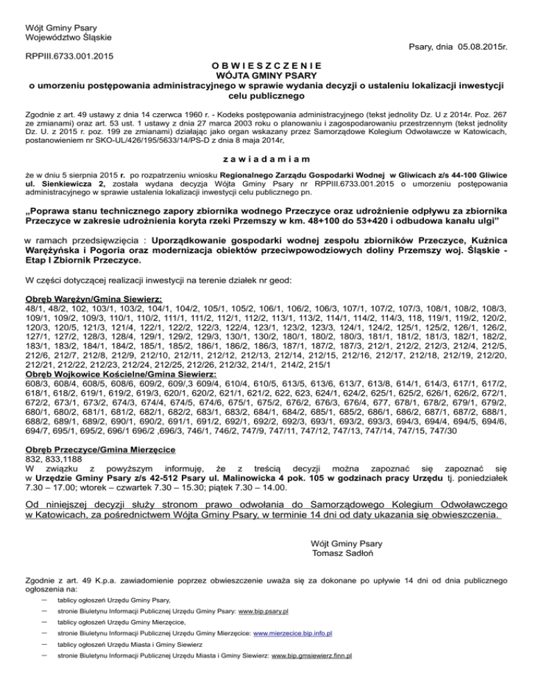 Wójt Gminy Psary Województwo Śląskie Psary, dnia 05.08.2015r. RPPIII.6733.001.2015 OBWIESZCZENIE WÓJTA GMINY PSARY o umorzeniu postępowania administracyjnego w sprawie wydania decyzji o ustaleniu lokalizacji inwestycji celu publicznego Zgodnie z art. 49 ustawy z dnia 14 czerwca 1960 r. - Kodeks postępowania administracyjnego (tekst jednolity Dz. U z 2014r. Poz. 267 ze zmianami) oraz art. 53 ust. 1 ustawy z dnia 27 marca 2003 roku o planowaniu i zagospodarowaniu przestrzennym (tekst jednolity Dz. U. z 2015 r. poz. 199 ze zmianami) działając jako organ wskazany przez Samorządowe Kolegium Odwoławcze w Katowicach, postanowieniem nr SKO-UL/426/195/5633/14/PS-D z dnia 8 maja 2014r, zawiadamiam że w dniu 5 sierpnia 2015 r. po rozpatrzeniu wniosku Regionalnego Zarządu Gospodarki Wodnej w Gliwicach z/s 44-100 Gliwice ul. Sienkiewicza 2, została wydana decyzja Wójta Gminy Psary nr RPPIII.6733.001.2015 o umorzeniu postępowania administracyjnego w sprawie ustalenia lokalizacji inwestycji celu publicznego pn. „Poprawa stanu technicznego zapory zbiornika wodnego Przeczyce oraz udrożnienie odpływu za zbiornika Przeczyce w zakresie udrożnienia koryta rzeki Przemszy w km. 48+100 do 53+420 i odbudowa kanału ulgi” w ramach przedsięwzięcia : Uporządkowanie gospodarki wodnej zespołu zbiorników Przeczyce, Kuźnica Warężyńska i Pogoria oraz modernizacja obiektów przeciwpowodziowych doliny Przemszy woj. Śląskie Etap I Zbiornik Przeczyce. W części dotyczącej realizacji inwestycji na terenie działek nr geod: Obręb Warężyn/Gmina Siewierz: 48/1, 48/2, 102, 103/1, 103/2, 104/1, 104/2, 105/1, 105/2, 106/1, 106/2, 106/3, 107/1, 107/2, 107/3, 108/1, 108/2, 108/3, 109/1, 109/2, 109/3, 110/1, 110/2, 111/1, 111/2, 112/1, 112/2, 113/1, 113/2, 114/1, 114/2, 114/3, 118, 119/1, 119/2, 120/2, 120/3, 120/5, 121/3, 121/4, 122/1, 122/2, 122/3, 122/4, 123/1, 123/2, 123/3, 124/1, 124/2, 125/1, 125/2, 126/1, 126/2, 127/1, 127/2, 128/3, 128/4, 129/1, 129/2, 129/3, 130/1, 130/2, 180/1, 180/2, 180/3, 181/1, 181/2, 181/3, 182/1, 182/2, 183/1, 183/2, 184/1, 184/2, 185/1, 185/2, 186/1, 186/2, 186/3, 187/1, 187/2, 187/3, 212/1, 212/2, 212/3, 212/4, 212/5, 212/6, 212/7, 212/8, 212/9, 212/10, 212/11, 212/12, 212/13, 212/14, 212/15, 212/16, 212/17, 212/18, 212/19, 212/20, 212/21, 212/22, 212/23, 212/24, 212/25, 212/26, 212/32, 214/1, 214/2, 215/1 Obręb Wojkowice Kościelne/Gmina Siewierz: 608/3, 608/4, 608/5, 608/6, 609/2, 609/,3 609/4, 610/4, 610/5, 613/5, 613/6, 613/7, 613/8, 614/1, 614/3, 617/1, 617/2, 618/1, 618/2, 619/1, 619/2, 619/3, 620/1, 620/2, 621/1, 621/2, 622, 623, 624/1, 624/2, 625/1, 625/2, 626/1, 626/2, 672/1, 672/2, 673/1, 673/2, 674/3, 674/4, 674/5, 674/6, 675/1, 675/2, 676/2, 676/3, 676/4, 677, 678/1, 678/2, 679/1, 679/2, 680/1, 680/2, 681/1, 681/2, 682/1, 682/2, 683/1, 683/2, 684/1, 684/2, 685/1, 685/2, 686/1, 686/2, 687/1, 687/2, 688/1, 688/2, 689/1, 689/2, 690/1, 690/2, 691/1, 691/2, 692/1, 692/2, 692/3, 693/1, 693/2, 693/3, 694/3, 694/4, 694/5, 694/6, 694/7, 695/1, 695/2, 696/1 696/2 ,696/3, 746/1, 746/2, 747/9, 747/11, 747/12, 747/13, 747/14, 747/15, 747/30 Obręb Przeczyce/Gmina Mierzęcice 832, 833,1188 W związku z powyższym informuję, że z treścią decyzji można zapoznać się zapoznać się w Urzędzie Gminy Psary z/s 42-512 Psary ul. Malinowicka 4 pok. 105 w godzinach pracy Urzędu tj. poniedziałek 7.30 – 17.00; wtorek – czwartek 7.30 – 15.30; piątek 7.30 – 14.00. Od niniejszej decyzji służy stronom prawo odwołania do Samorządowego Kolegium Odwoławczego w Katowicach, za pośrednictwem Wójta Gminy Psary, w terminie 14 dni od daty ukazania się obwieszczenia. Wójt Gminy Psary Tomasz Sadłoń Zgodnie z art. 49 K.p.a. zawiadomienie poprzez obwieszczenie uważa się za dokonane po upływie 14 dni od dnia publicznego ogłoszenia na: tablicy ogłoszeń Urzędu Gminy Psary, stronie Biuletynu Informacji Publicznej Urzędu Gminy Psary: www.bip.psary.pl tablicy ogłoszeń Urzędu Gminy Mierzęcice, stronie Biuletynu Informacji Publicznej Urzędu Gminy Mierzęcice: www.mierzecice.bip.info.pl tablicy ogłoszeń Urzędu Miasta i Gminy Siewierz stronie Biuletynu Informacji Publicznej Urzędu Miasta i Gminy Siewierz: www.bip.gmsiewierz.finn.pl