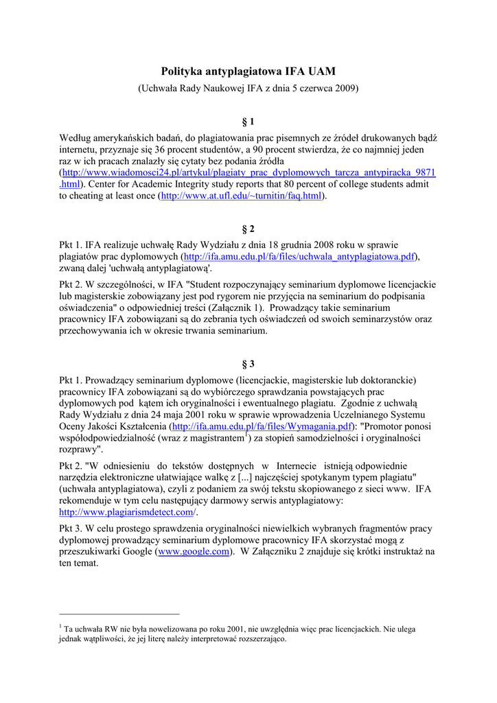 Polityka antyplagiatowa IFA UAM (Uchwała Rady Naukowej IFA z dnia 5 czerwca 2009) §1 Według amerykańskich badań, do plagiatowania prac pisemnych ze źródeł drukowanych bądź internetu, przyznaje się 36 procent studentów, a 90 procent stwierdza, Ŝe co najmniej jeden raz w ich pracach znalazły się cytaty bez podania źródła (http://www.wiadomosci24.pl/artykul/plagiaty_prac_dyplomowych_tarcza_antypiracka_9871 .html). Center for Academic Integrity study reports that 80 percent of college students admit to cheating at least once (http://www.at.ufl.edu/~turnitin/faq.html). §2 Pkt 1. IFA realizuje uchwałę Rady Wydziału z dnia 18 grudnia 2008 roku w sprawie plagiatów prac dyplomowych (http://ifa.amu.edu.pl/fa/files/uchwala_antyplagiatowa.pdf), zwaną dalej 'uchwałą antyplagiatową'. Pkt 2. W szczególności, w IFA "Student rozpoczynający seminarium dyplomowe licencjackie lub magisterskie zobowiązany jest pod rygorem nie przyjęcia na seminarium do podpisania oświadczenia" o odpowiedniej treści (Załącznik 1). Prowadzący takie seminarium pracownicy IFA zobowiązani są do zebrania tych oświadczeń od swoich seminarzystów oraz przechowywania ich w okresie trwania seminarium. §3 Pkt 1. Prowadzący seminarium dyplomowe (licencjackie, magisterskie lub doktoranckie) pracownicy IFA zobowiązani są do wybiórczego sprawdzania powstających prac dyplomowych pod kątem ich oryginalności i ewentualnego plagiatu. Zgodnie z uchwałą Rady Wydziału z dnia 24 maja 2001 roku w sprawie wprowadzenia Uczelnianego Systemu Oceny Jakości Kształcenia (http://ifa.amu.edu.pl/fa/files/Wymagania.pdf): "Promotor ponosi współodpowiedzialność (wraz z magistrantem1) za stopień samodzielności i oryginalności rozprawy". Pkt 2. "W odniesieniu do tekstów dostępnych w Internecie istnieją odpowiednie narzędzia elektroniczne ułatwiające walkę z [...] najczęściej spotykanym typem plagiatu" (uchwała antyplagiatowa), czyli z podaniem za swój tekstu skopiowanego z sieci www. IFA rekomenduje w tym celu następujący darmowy serwis antyplagiatowy: http://www.plagiarismdetect.com/. Pkt 3. W celu prostego sprawdzenia oryginalności niewielkich wybranych fragmentów pracy dyplomowej prowadzący seminarium dyplomowe pracownicy IFA skorzystać mogą z przeszukiwarki Google (www.google.com). W Załączniku 2 znajduje się krótki instruktaŜ na ten temat. 1 Ta uchwała RW nie była nowelizowana po roku 2001, nie uwzględnia więc prac licencjackich. Nie ulega jednak wątpliwości, Ŝe jej literę naleŜy interpretować rozszerzająco. §4 Pkt 1. Kodeks karny mówi, iŜ "kto wyłudza poświadczenie nieprawdy przez podstępne wprowadzenie w błąd funkcjonariusza publicznego lub innej osoby upowaŜnionej do wystawienia dokumentu, podlega karze pozbawienia wolności do lat 3" (Ustawa z dn. 4 lutego 1997 r. - Kodeks karny, art. 272). W kontekście IFA, prowadzący seminarium dyplomowe, bądź inny pracownik "upowaŜniony do wystawienia dokumentu" jakim jest dyplom bądź zaliczenie kursu potwierdzone podpisem w indeksie studenta i na karcie egzaminacyjnej/zaliczeniowej, jest funkcjonariuszem publicznym, który jest wprowadzony w błąd przez studenta dopuszczającego się plagiatu. Pkt 2. Ustawa o szkolnictwie wyŜszym przewiduje, Ŝe uczelnia "w drodze decyzji, stwierdza niewaŜność postępowania w sprawie nadania tytułu zawodowego, jeŜeli w pracy stanowiącej podstawę nadania tytułu zawodowego osoba ubiegająca się o ten tytuł przypisała sobie autorstwo istotnego fragmentu lub innych elementów cudzego utworu lub ustalenia naukowego" (Ustawa z dn. 27 lipca 2005 r. - Prawo o szkolnictwie wyŜszym, art. 193). §5 Pkt 1. W razie wykrycia plagiatu w pracy dyplomowej, bądź innej pracy studenta (licencjanta, magistranta lub doktoranta) wykonanej w związku z jego obowiązkami w IFA i przedłoŜonej do oceny, pracownik IFA zobowiązany jest do poinformowania o tym fakcie odpowiedniego zastępcę dyrektora IFA, który podejmie decyzję o dalszym trybie postępowania. Pkt 2. Uchwała antyplagiatowa RW, w punktach 3. i 4. zawiera wskazówki odnośnie postępowania w razie stwierdzenia "plagiatów śród-seminaryjnych, a więc faktów bezprawnego podania za swoje skopiowanych części pracy dyplomowej" w przypadku prac licencjackich i magisterskich. Pkt 3. W celu ułatwienia kontroli antyplagiatowej złoŜonych do recenzji, a powstających w IFA, rozpraw doktorskich uruchomiono pod adresem https://ifa.amu.edu.pl/phdthesis/login.php serwis o nazwie PHD Thesis Browser, gdzie członkowie Rady IFA ze stopniem doktora habilitowanego mogą zapoznać się z elektroniczną wersją (format pdf) tych rozpraw. Pomocna literatura: Holmberg, Melissa & Mark McCullough. "Anti-Plagiarism Tools: Scirus v. Google". [http://www.iatul.org/doclibrary/public/Conf_Proceedings/2005/scirus61.pdf] Kaehr, Robert. 2008. "Plagiarism Help. Detecting Plagiarized Papers". [http://campus.huntington.edu/plagiarism/] Sutherland-Smith, Wendy. 2008. Plagiarism, the Internet and Student Learning: Improving Academic Integrity. New York: Routledge. [http://www.amazon.com/Plagiarism-InternetStudent-Learning-Improving/dp/0415432936] Wawak, Sławomir & Krzysztof Woźniak. 2005. "Skuteczny system automatycznego wykrywania plagiatów na przykładzie prac zaliczeniowych studentów Akademii Ekonomicznej w Krakowie". e-mentor 5 [http://www.ementor.edu.pl/artykul_v2.php?numer=12&id=213] Załącznik 1. Oświadczenie antyplagiatowe OŚWIADCZENIE Ja, niŜej podpisany/a ................................................................................................................................................................................ student/ka Wydziału Neofilologii Uniwersytetu im. Adama Mickiewicza w Poznaniu o ś w i a d c z a m, Ŝe pracę magisterską/Iicencjacką* przygotowywaną na seminarium doktora/profesora* .......................................................................................... w latach akademickich .....