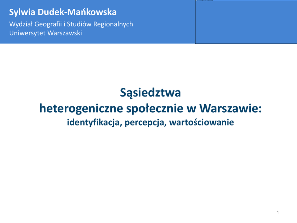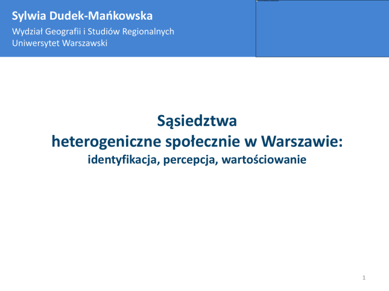Sylwia Dudek-Mańkowska Wydział Geografii i Studiów Regionalnych Uniwersytet Warszawski Sąsiedztwa heterogeniczne społecznie w Warszawie: identyfikacja, percepcja, wartościowanie 1 Badania zróżnicowania społecznego Badania nad zróżnicowaniem społecznym w miastach prowadzone są nieprzerwanie od lat 30. XX wieku, choć uwarunkowania ich podejmowania wyznaczały różne czynniki (Sarkissian, Forsyth, Heine 1990; Arthurson 2002) Wzrost zainteresowania problematyką nastąpił po II wojnie światowej, gdy z powodu niedoboru mieszkań powstawały w wielu miastach duże społeczne osiedla mieszkaniowe, zamieszkiwane przez osoby należące do tych samych grup społecznych Już w latach 40. XX wieku idea zróżnicowania społecznego została uznana za jeden z ważnych celów polityki planistycznej w wielu krajach, zaczęły obowiązywać przepisy regulujące powstawanie osiedli heterogenicznych społecznie (m.in. Wielka Brytania) (Sarkissian, Forsyth, Heine 1990; Arthurson 2002) W ostatnich dekadach rozwój poglądów neoliberalnych, nacisk na indywidualizm, skuteczność w działaniu stworzył niebezpieczeństwo utrwalania podziału społeczeństwa na grupy społecznie włączonych (social inclusion) we wszystkie dziedziny życia społecznego i społecznie wyłączonych (social exclusion) z pewnych dziedzin życia społecznego. 2 Badania zróżnicowania społecznego Od czasu upadku komunizmu, miasta Europy Środkowej podlegały silnym przemianom, które odzwierciedliły się także w ich strukturze społecznoprzestrzennej: miasto socjalistyczne było mniej homogeniczne społecznie aniżeli miasto kapitalistyczne (Sykora1999). Tempo przemian społecznych i gospodarczych jakie zaszły w miastach Europy Środkowej po 1990 roku było różne i zależało od specyfiki kontekstu społecznego, gospodarczego i przestrzennego (Carter i Maik 1999). Skala i wzory przestrzenne segregacji społecznej w mieście socjalistycznym i postsocjalistycznym były analizowane (m.in. Hamilton, Burnett 1979, Węcławowicz 2002, Sykora 1999). • Znacznie rzadziej podejmowane są badania dotyczące postrzegania zróżnicowań społecznych i segregacji społecznej w miastach Europy Środkowej i Wschodniej, choć istnieje świadomość konsekwencji społeczno-przestrzennych zachodzących w 3 tych miastach przemian. Zróżnicowanie społeczne a jakość życia w mieście zwiększa rywalizację pomiędzy mieszkańcami podnosi aspiracje biedniejszych grup oraz skłania je do działań na rzecz poprawy standardu życia; wpływa pozytywnie na estetykę osiedla; sprzyja wymianie i poszanowaniu innych poglądów, opinii i wartości; wpływa pozytywnie na zachowania i postawy mieszkańców - sprzyja postawom akceptacji i tolerancji; sprzyja tworzeniu się więzi społecznych między mieszkańcami i budowie wspólnoty; jest stymulantą rozwoju lokalnego rynku pracy i zwiększa dostępność oraz jakość usług; sprzyja budowaniu pozytywnego wizerunku obszaru. prowadzi do napięć i konfliktów społecznych - zwiększa agresję mieszkańców (brak tolerancji, niechęć, wrogość); wpływa negatywnie na estetykę osiedla – kontrasty; zwiększa poziom biedniejszych grup; wpływa negatywnie na wizerunek obszaru. frustracji Page, Broughton 1997; Biggins, Hassan 1998; Jupp 1999; Cole, Goodshild 2001; Arthurson 2002; Ruming 2004. Sarkissian, Forsyth oraz Heine 1990; Rose 2004, Kerason i prawnicy, instytucje finansowe, organizacje pozarządowe Mason 2007. 4 Koncepcja badania Problemy badawcze: Problem 1: Identyfikacja osiedli/sąsiedztw zróżnicowanych społecznie Problem 2: Postrzeganie osiedli/sąsiedztw zróżnicowanych społecznie Problem 3: Wartościowanie osiedli/sąsiedztw zróżnicowanych społecznie Pytania badawcze: 1) Czy zdaniem mieszkańców zamieszkiwane sąsiedztwo jest zróżnicowane społecznie? A jeśli tak, to jak określają skalę tych zróżnicowań? (2) Jak mieszkańcy oceniają jakość życia w sąsiedztwie? (3) Czy i w jakim stopniu postrzegane zróżnicowanie społeczne sąsiedztwa wpływa na jakość życia mieszkańców? prawnicy, instytucje finansowe, organizacje pozarządowe 5 Koncepcja badania Dane pochodzą z własnych badań sondażowych przeprowadzonych w latach 2012-2014 wśród mieszkańców wybranych sąsiedztw w Warszawie. Przy wyborze obszarów kierowano się: 1) położeniem obszaru - badaniem objęto zarówno sąsiedztwa śródmiejskie jak i peryferyjne; prawobrzeżne oraz lewobrzeżne; 2) strukturą społeczną obszaru – wybór poprzedziła analiza danych pochodzących ze spisu powszechnego w 2002 roku oraz danych pochodzących ze spółdzielni mieszkaniowych, urzędów dzielnic oraz ośrodków pomocy społecznej 3) postrzeganiem dobrych i złych miejsc w mieście przez mieszkańców Warszawy; do badania zakwalifikowano obszary postrzegane jako prestiżowe jak i te o silnie negatywnym wizerunku. Kwalifikując obszary badawcze kierowano się nie tylko stopniem zróżnicowania społeczno-ekonomicznego mieszkańców, ale także różnicami w tkance prawnicy, instytucje finansowe, mieszkaniowej organizacje pozarządowe Problem 1: Identyfikacja Wyzwanie: skala badania ? Dzielnica / Osiedle / Sąsiedztwo / Ulica / Budynek Etap 1 50 obszarów w mieście – 2 354 respondentów Określenie skali badania postrzegania i wartościowania zróżnicowania społecznego w mieście Jak mieszkańcy rozumieją pojęcie osiedla i sąsiedztwa? prawnicy, instytucje finansowe, organizacje pozarządowe Problem 1: Identyfikacja Przykład: obręb ulic Trocka – Zamiejska – Askenazego Osiedle Generalska, kolonia IV, 19 budynków Odpowiedzi: Osiedle Generalska, Osiedle Trocka, Osiedle Zamiejska, Kolonia Zamiejska, Targówek Mieszkaniowy prawnicy, instytucje finansowe, organizacje pozarządowe Problem 1: Identyfikacja Problem z określeniem nazwy i granic zamieszkiwanego osiedla Sąsiedztwo – najczęściej 3-4 budynki wielkorodzinne / kilkanaście domów jednorodzinnych Etap 2: 30 sąsiedztw (zidentyfi