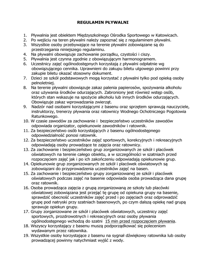 REGULAMIN PŁYWALNI 1. Pływalnia jest obiektem Międzyszkolnego Ośrodka Sportowego w Katowicach. 2. Po wejściu na teren pływalni należy zapoznać się z regulaminem pływalni. 3. Wszystkie osoby przebywające na terenie pływalni zobowiązane są do przestrzegania niniejszego regulaminu. 4. Na pływalni obowiązuje zachowanie porządku, czystości i ciszy. 5. Pływalnia jest czynna zgodnie z obowiązującym harmonogramem. 6. Uczestnicy zajęć ogólnodostępnych korzystają z pływalni odpłatnie wg obowiązującego cennika. Uprawnieni do zakupu biletu ulgowego powinni przy zakupie biletu okazać stosowny dokument. 7. Dzieci ze szkół podstawowych mogą korzystać z pływalni tylko pod opieką osoby pełnoletniej. 8. Na terenie pływalni obowiązuje zakaz palenia papierosów, spożywania alkoholu oraz używania środków odurzających. Zabroniony jest również wstęp osób, których stan wskazuje na spożycie alkoholu lub innych środków odurzających. Obowiązuje zakaz wprowadzania zwierząt. 9. Nadzór nad osobami korzystającymi z basenu oraz sprzętem sprawują nauczyciele, instruktorzy, trenerzy pływania oraz ratownicy Wodnego Ochotniczego Pogotowia Ratunkowego. 10. W czasie zawodów za zachowanie i bezpieczeństwo uczestników zawodów odpowiada organizator, opiekunowie zawodników i ratownik. 11. Za bezpieczeństwo osób korzystających z basenu ogólnodostępnego odpowiedzialność ponosi ratownik. 12. Za bezpieczeństwo uczestników zajęć sportowych, korekcyjnych i rekreacyjnych odpowiadają osoby prowadzące te zajęcia oraz ratownicy. 13. Za zachowanie i bezpieczeństwo grup zorganizowanych ze szkół i placówek oświatowych na terenie całego obiektu, a w szczególności w szatniach przed rozpoczęciem zajęć jak i po ich zakończeniu odpowiadają opiekunowie grup. 14. Opiekunowie grup zorganizowanych ze szkół i placówek oświatowych są zobowiązani do przyprowadzenia uczestników zajęć na basen. 15. Za zachowanie i bezpieczeństwo grupy zorganizowanej ze szkół i placówek oświatowych podczas zajęć na basenie odpowiada osoba prowadząca dana grupę oraz ratownik. 16. Osoba prowadząca zajęcia z grupą zorganizowaną ze szkoły lub placówki oświatowej zobowiązana jest przejąć tę grupę od opiekuna grupy na basenie, sprawdzić obecność uczestników zajęć przed i po zajęciach oraz odprowadzić grupę pod natryski przy szatniach basenowych, po czym dalszą opiekę nad grupą sprawuje opiekun grupy. 17. Grupy zorganizowane ze szkół i placówek oświatowych, uczestnicy zajęć sportowych, prozdrowotnych i rekreacyjnych oraz osoby pływania ogólnodostępnego wchodzą do szatni 15 min przed rozpoczęciem pływania. 18. Wszyscy korzystający z basenu muszą podporządkować się poleceniom wydawanym przez ratownika. 19. Wszystkie osoby korzystające z basenu na sygnał dźwiękowy ratownika lub osoby prowadzącej powinny natychmiast wyjść z wody. 20. W razie niebezpieczeństwa ratownik może nakazać kąpiącym natychmiast wyjść z wody i opuścić basen oznaczoną drogą ewakuacyjną. 21. Każdą osobę przed wejściem do basenu obowiązuje: przejście przez brodzik, dokładne umycie ciała pod prysznicem oraz po skorzystaniu z toalety. 22. Kąpiących się obowiązuje: - noszenie stroju kąpielowego oraz czepka, - zachowanie porządku i czystości, - opuszczenie basenu niezwłocznie na sygnał ogłaszający koniec zajęć, - wejście na basen w obuwiu zamiennym lub boso, - przestrzeganie Regulaminu. 23. Osobom korzystającym z basenu zabrania się: - stwarzać sytuacje zagrażające niebezpieczeństwu, - wchodzić do wody bez zezwolenia, - biegać po obrzeżach niecki basenu, - biegać po schodach a także w przejściach między szatnią a basenem, - skakać i biegać po trybunach, - skoków do wody z brzegu basenu - skoków ze słupków startowych w czasie zajęć ogólnodostępnych - jeść na terenie basenu a także żuć gumę, - załatwiać potrzeby fizjologiczne w basenie. 24. Punkt sanitarny na basenie znajduje się w dyżurce ratowników 25. Wszelkie zagrożenia, skaleczenia i urazy należy niezwłocznie zgłaszać dyżurnemu ratownikowi. 26. Osoby u których występują choroby skóry, otwarte skaleczenia, trudno gojące się rany nie będą dopuszczone do korzystania z basenu. 27. Za pozostawienie wartościowych przedmiotów bez nadzoru kierownictwo nie ponosi odpowiedzialności. 28. Osoby naruszające porządek lub przepisy niniejszego regulaminu będą usuwane z obiektu, niezależnie od ewentualnego skierowania sprawy na drogę postępowania w sprawach o wykroczenia. 29. Winni niszczenia bądź uszkodzenia sprzętu lub urządzeń basenu ponoszą odpowiedzialność materialną za wyrządzone szkody. 30. Za wszystkie szkody spowodowane przez nieletnich odpowiadają opiekunowie. 31. Skargi i wnioski można zgłaszać w sekretariacie ośrodka. 32. Za przestrzeganie niniejszego regulaminu przez osoby korzystające z basenu odpowiedzialni są instruktorzy prowadzący zajęcia i dyżurni ratownicy. Wszystkie osoby przebywające na terenie basenu obowiązane są do podporządkowania się ich zaleceniom. Dyrektor Mię dzyszkolnego Oś rodka Sportowego Katowice, dnia 1.09.2015 r. w Katowicach