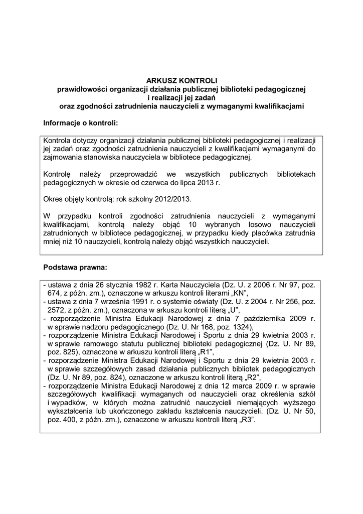 ARKUSZ KONTROLI prawidłowości organizacji działania publicznej biblioteki pedagogicznej i realizacji jej zadań oraz zgodności zatrudnienia nauczycieli z wymaganymi kwalifikacjami Informacje o kontroli: Kontrola dotyczy organizacji działania publicznej biblioteki pedagogicznej i realizacji jej zadań oraz zgodności zatrudnienia nauczycieli z kwalifikacjami wymaganymi do zajmowania stanowiska nauczyciela w bibliotece pedagogicznej. Kontrolę należy przeprowadzić we wszystkich pedagogicznych w okresie od czerwca do lipca 2013 r. publicznych bibliotekach Okres objęty kontrolą: rok szkolny 2012/2013. W przypadku kontroli zgodności zatrudnienia nauczycieli z wymaganymi kwalifikacjami, kontrolą należy objąć 10 wybranych losowo nauczycieli zatrudnionych w bibliotece pedagogicznej, w przypadku kiedy placówka zatrudnia mniej niż 10 nauczycieli, kontrolą należy objąć wszystkich nauczycieli. Podstawa prawna: - ustawa z dnia 26 stycznia 1982 r. Karta Nauczyciela (Dz. U. z 2006 r. Nr 97, poz. 674, z późn. zm.), oznaczone w arkuszu kontroli literami „KN”, - ustawa z dnia 7 września 1991 r. o systemie oświaty (Dz. U. z 2004 r. Nr 256, poz. 2572, z późn. zm.), oznaczona w arkuszu kontroli literą „U”, - rozporządzenie Ministra Edukacji Narodowej z dnia 7 października 2009 r. w sprawie nadzoru pedagogicznego (Dz. U. Nr 168, poz. 1324), - rozporządzenie Ministra Edukacji Narodowej i Sportu z dnia 29 kwietnia 2003 r. w sprawie ramowego statutu publicznej biblioteki pedagogicznej (Dz. U. Nr 89, poz. 825), oznaczone w arkuszu kontroli literą „R1”, - rozporządzenie Ministra Edukacji Narodowej i Sportu z dnia 29 kwietnia 2003 r. w sprawie szczegółowych zasad działania publicznych bibliotek pedagogicznych (Dz. U. Nr 89, poz. 824), oznaczone w arkuszu kontroli literą „R2”, - rozporządzenie Ministra Edukacji Narodowej z dnia 12 marca 2009 r. w sprawie szczegółowych kwalifikacji wymaganych od nauczycieli oraz określenia szkół i wypadków, w których można zatrudnić nauczycieli niemających wyższego wykształcenia lub ukończonego zakładu kształcenia nauczycieli. (Dz. U. Nr 50, poz. 400, z późn. zm.), oznaczone w arkuszu kontroli literą „R3”. I. Organizacja pracy publicznej biblioteki pedagogicznej 1 Uwaga. W przypadku zaznaczenia odpowiedzi „Nie” należy wydać dyrektorowi biblioteki zalecenie po uzyskaniu wyjaśnień dyrektora oraz przejść do wypełniania pkt 3 z pominięciem pkt 2. Biblioteka działa na podstawie statutu (U: art. 50 ust. 2 pkt 1, art. 52 ust. 2): Tak Nie Wyjaśnienia dyrektora: Zalecenie: Zaleca się uchwalenie statutu biblioteki, zgodnie z art. 50 ust. 2 pkt 1 i art. 52 ust. 2 ustawy z dnia 7 września 1991 r. o systemie oświaty (Dz. U. z 2004 r. Nr 256, poz. 2572, z późn. zm.). 2 Uwaga. W przypadku zaznaczenia odpowiedzi „Nie” należy wydać dyrektorowi biblioteki zalecenie po uzyskaniu wyjaśnień dyrektora. Statut określa organizację biblioteki (R1: § 4 załącznika): Tak Nie Wyjaśnienia dyrektora: Zalecenie: Zaleca się określić w statucie organizację biblioteki, zgodnie z § 4 załącznika do rozporządzenia Ministra Edukacji Narodowej i Sportu z dnia 29 kwietnia 2003 r. w sprawie ramowego statutu publicznej biblioteki pedagogicznej (Dz. U. Nr 89, poz. 825). 3 Uwaga. W przypadku zaznaczenia odpowiedzi „Nie” należy wydać dyrektorowi biblioteki zalecenie po uzyskaniu wyjaśnień dyrektora, a następnie przejść do wypełniania II części arkusza kontroli z pominięciem pkt 4, 5 i 6. Dyrektor biblioteki opracował arkusz organizacji biblioteki na rok szkolny 2012/2013 (R1: § 5 ust. 1 załącznika): Tak Wyjaśnienia dyrektora: Nie Zalecenie: Zaleca się opracowywanie arkusza organizacji biblioteki, zgodnie z § 5 ust. 1 załącznika do rozporządzenia Ministra Edukacji Narodowej i Sportu z dnia 29 kwietnia 2003 r. w sprawie ramowego statutu publicznej biblioteki pedagogicznej (Dz. U. Nr 89, poz. 825). 4 Uwaga. Zaznaczenie przynajmniej jednej odpowiedzi „Nie” wymaga wyjaśnień dyrektora biblioteki i skutkuje wydaniem odpowiedniego zalecenia. Arkusz organizacji biblioteki na rok szkolny 2012/2013 został opracowany (R1: § 5 ust. 1 załącznika): a) do 30 kwietnia 2012 roku Tak Nie1) b) z uwzględnieniem rocznego planu pracy Tak Nie2) Wyjaśnienia dyrektora: 1) Zalecenie: Zaleca się opracowywanie w każdym roku arkusza organizacji biblioteki w terminie zgodnym z § 5 ust. 1 załącznika do rozporządzenia Ministra Edukacji Narodowej i Sportu z dnia 29 kwietnia 2003 r. w sprawie ramowego statutu publicznej biblioteki pedagogicznej (Dz. U. Nr 89, poz. 825). 2) Zalecenie: Zaleca się opracowywanie arkusza organizacji biblioteki z uwzględnieniem rocznego planu pracy zgodnie z § 5 ust. 1 załącznika do rozporządzenia Ministra Edukacji Narodowej i Sportu z dnia 29 kwietnia 2003 r. w sprawie ramowego statutu publicznej biblioteki pedagogicznej (Dz. U. Nr 89, poz. 825). 5 Uwaga. W przypadku zaznaczenia odpowiedzi „Nie”, organ sprawujący nadzór pedagogiczny podejmuje działania wobec organu prowadzącego placówkę, z uwzględnieniem przepisu art. 34 ust. 1 ustawy o systemie oświaty. Biblioteka działa na podstawie zatwierdzonego przez organ prowadzący arkusza organizacji biblioteki (R1: § 5 ust. 1 załącznika): Tak Wyjaśnienia dyrektora: Nie 6 Uwaga. Zaznaczenie przynajmniej jednej odpowiedzi „Nie” wymaga wyjaśnień dyrektora biblioteki i skutkuje wydaniem zalecenia. Arkusz organizacji biblioteki określa (R1: § 5 ust. 2 załącznika): a) liczbę pracowników biblioteki Tak Nie b) liczbę pracowników biblioteki zajmujących stanowiska kierownicze ogólną liczbę godzin pracy biblioteki finansowanych ze środków przydzielonych przez organ prowadzący Tak Nie Tak Nie c) Wyjaśnienia dyrektora: Zalecenie: Zaleca się określanie w arkuszu organizacji biblioteki: – liczby pracowników *, – liczby pracowników zajmujących stanowiska kierownicze *, – ogólnej liczby godzin pr