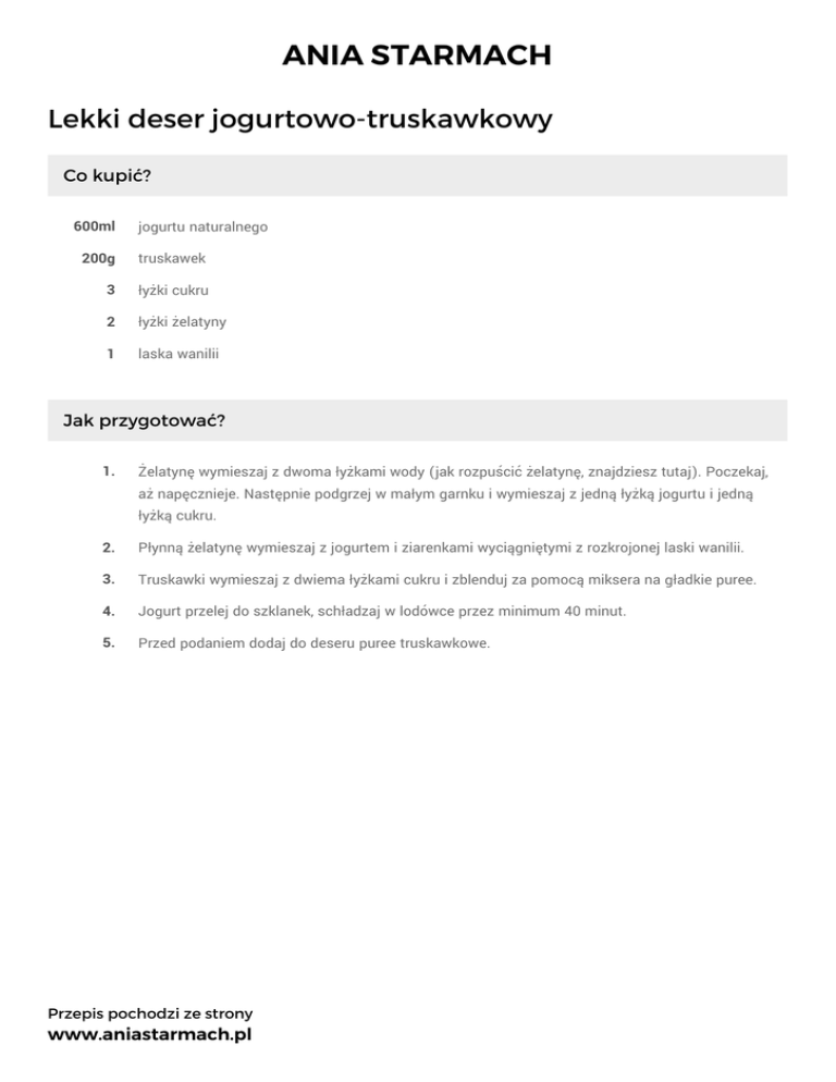 ANIA STARMACH Lekki deser jogurtowo-truskawkowy Co kupić? 600ml jogurtu naturalnego 200g truskawek 3 łyżki cukru 2 łyżki żelatyny 1 laska wanilii Jak przygotować? 1. Żelatynę wymieszaj z dwoma łyżkami wody (jak rozpuścić żelatynę, znajdziesz tutaj). Poczekaj, aż napęcznieje. Następnie podgrzej w małym garnku i wymieszaj z jedną łyżką jogurtu i jedną łyżką cukru. 2. Płynną żelatynę wymieszaj z jogurtem i ziarenkami wyciągniętymi z rozkrojonej laski wanilii. 3. Truskawki wymieszaj z dwiema łyżkami cukru i zblenduj za pomocą miksera na gładkie puree. 4. Jogurt przelej do szklanek, schładzaj w lodówce przez minimum 40 minut. 5. Przed podaniem dodaj do deseru puree truskawkowe. Przepis pochodzi ze strony www.aniastarmach.pl