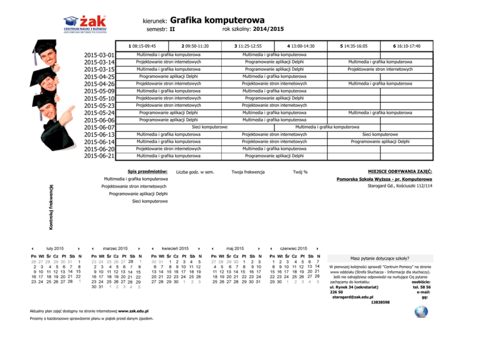 kierunek: Grafika komputerowa rok szkolny: 2014/2015 semestr: II 1 08:15-09:45 2015-03-01 2015-03-14 2015-03-15 2015-04-25 2015-04-26 2015-05-09 2015-05-10 2015-05-23 2015-05-24 2015-06-06 2015-06-07 2015-06-13 2015-06-14 2015-06-20 2015-06-21 3 11:25-12:55 4 13:00-14:30 5 14:35-16:05 6 16:10-17:40 Multimedia i grafika komputerowa Multimedia i grafika komputerowa Projektowanie stron internetowych Programowanie aplikacji Delphi Multimedia i grafika komputerowa Multimedia i grafika komputerowa Programowanie aplikacji Delphi Projektowanie stron internetowych Programowanie aplikacji Delphi Multimedia i grafika komputerowa Projektowanie stron internetowych Projektowanie stron internetowych Multimedia i grafika komputerowa Multimedia i grafika komputerowa Projektowanie stron internetowych Programowanie aplikacji Delphi Projektowanie stron internetowych Projektowanie stron internetowych Programowanie aplikacji Delphi Multimedia i grafika komputerowa Programowanie aplikacji Delphi Multimedia i grafika komputerowa Sieci komputerowe Multimedia i grafika komputerowa Multimedia i grafika komputerowa Multimedia i grafika komputerowa Multimedia i grafika komputerowa Projektowanie stron internetowych Sieci komputerowe Multimedia i grafika komputerowa Projektowanie stron internetowych Programowanie aplikacji Delphi Projektowanie stron internetowych Multimedia i grafika komputerowa Multimedia i grafika komputerowa Programowanie aplikacji Delphi Spis przedmiotów: Multimedia i grafika komputerowa Kontroluj frekwencję 2 09:50-11:20 Projektowanie stron internetowych Liczba godz. w sem. Twoja frekwencja Twój % MIEJSCE ODBYWANIA ZAJĘĆ: Pomorska Szkoła Wyższa - pr. Komputerowa Starogard Gd., Kościuszki 112/114 Programowanie aplikacji Delphi Sieci komputerowe Masz pytanie dotyczące szkoły? W pierwszej kolejności sprawdź "Centrum Pomocy" na stronie www oddziału (Strefa Słuchacza - Informacje dla słuchaczy). Jeśli nie odnajdziesz odpowiedzi na nurtujące Cię pytanie zachęcamy do kontaktu: osobiście: ul. Rynek 34 (sekretariat) tel. 58 56 226 50 e-mail: [email protected] gg: 13838598 Aktualny plan zajęć dostępny na stronie internetowej www.zak.edu.pl Prosimy o każdorazowe sprawdzenie planu w piątek przed danym zjazdem.
