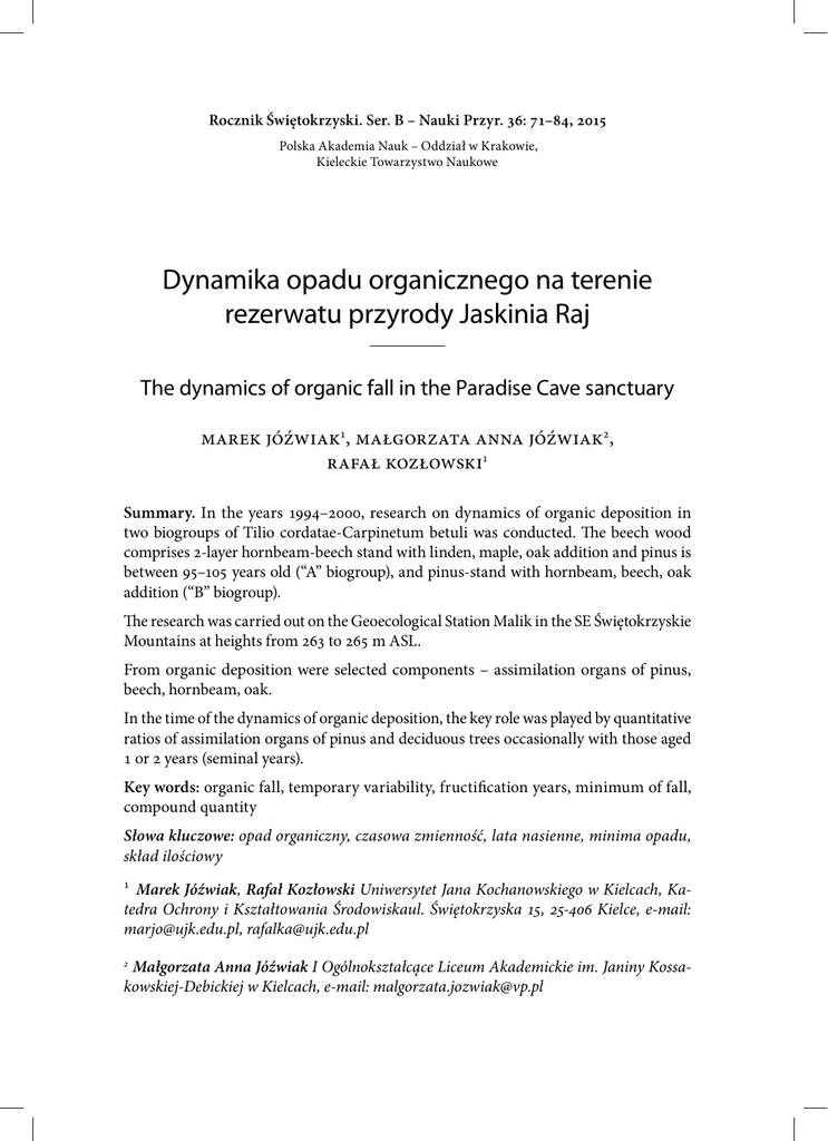 Rocznik Świętokrzyski. Ser. B – Nauki Przyr. 36: 71–84, 2015 Polska Akademia Nauk – Oddział w Krakowie, Kieleckie Towarzystwo Naukowe Dynamika opadu organicznego na terenie rezerwatu przyrody Jaskinia Raj The dynamics of organic fall in the Paradise Cave sanctuary Marek Jóźwiak1, MałgorzAta Anna Jóźwiak2, Rafał Kozłowski1 Summary. In the years 1994–2000, research on dynamics of organic deposition in two biogroups of Tilio cordatae-Carpinetum betuli was conducted. The beech wood comprises 2-layer hornbeam-beech stand with linden, maple, oak addition and pinus is between 95–105 years old (“A” biogroup), and pinus-stand with hornbeam, beech, oak addition (“B” biogroup). The research was carried out on the Geoecological Station Malik in the SE Świętokrzyskie Mountains at heights from 263 to 265 m ASL. From organic deposition were selected components – assimilation organs of pinus, beech, hornbeam, oak. In the time of the dynamics of organic deposition, the key role was played by quantitative ratios of assimilation organs of pinus and deciduous trees occasionally with those aged 1 or 2 years (seminal years). Key words: organic fall, temporary variability, fructification years, minimum of fall, compound quantity Słowa kluczowe: opad organiczny, czasowa zmienność, lata nasienne, minima opadu, skład ilościowy 1 Marek Jóźwiak, Rafał Kozłowski Uniwersytet Jana Kochanowskiego w Kielcach, Katedra Ochrony i Kształtowania Środowiskaul. Świętokrzyska 15, 25-406 Kielce, e-mail: [email protected], [email protected] Małgorzata Anna Jóźwiak I Ogólnokształcące Liceum Akademickie im. Janiny Kossakowskiej-Debickiej w Kielcach, e-mail: [email protected] 2 72 Marek Jóźwiak, Małgorazta Anna Jóźwiak, Rafał Kozłowski Wprowadzenie Ekosystemy leśne są miejscami naturalnych integracyjnych interakcji między różnymi formami życia zbiorowisk organizmów z otaczającym je środowiskiem funkcjonującym w czasie (Cleland i in. 1997). W objętościach przestrzeni ekologicznych poszczególnych jednostek funkcjonują biogrupy roślinne młode, dojrzałe i zestarzałe, z odpowiadającymi asocjacjami znajdującymi się w różnych stadiach sukcesji do klimaksowego włącznie. Jednym ze wskaźników stanu rozwojowego tych asocjacji jest ilościowo-jakościowy skład masy opadu organicznego docierającego z drzewostanu do powierzchni gleby. Jego poznanie jest elementem pozwalającym przybliżyć relacje między faktycznym stanem drzewostanu a warunkami panującymi w biotopie, a szczególnie w glebach. Wiadomo, że masa i skład pierwiastkowy opadu organicznego są uzależnione od splotów czynników edaficznych i biocenotycznych (Wójcik 1970; Prusinkiewicz i in. 1974; Stachurski i Zimka 1977, 1981; Jenny 1983; Trofimow i in. 1995), a ostatnio także od natężenia i czasu działania emisji przemysłowych (Ulrich 1983; Kreutzer i Pröbstele 1991; Heitz 1998) oraz zmian klimatycznych (Kowalkowski, Jóźwiak 2007). Celem niniejszego opracowania jest przedstawienie dynamiki masy opadu organicznego w dwóch drzewostanach zespołu grądu subkontynentalnego – Tilio cordatae-Carpinetum betuli, bukowo-grabowo-sosnowym i sosnowo-bukowo-grabowym. Drzewostany te od lat 70. XX wieku znajdują się pod wpływem wielkoobszarowej, silnej alkalizacji przez pyły cementowe i wapniowe w tzw. Białym Zagłębiu o powierzchni 1032 km2. W tej fazie stanu rozwojowego zbiorowisk roślinnych wzrosła pulsacyjnie wielkość entropii i jednocześnie zwiększa się zawartość informacji funkcjonalnych w systemie biocenozy. Nawet częściowe ich poznanie może stanowić przyczynek do zgłębienia trendów zachodzących przemian przystosowawczych i przeżycia zarówno zbiorowisk roślinnych, jak i gleb w nowych warunkach środowiska. Obiekt badań i metody Obiektem badań był zespół grądu subkontynentalnego Tilio cordatae-Carpinetum betuli (Stachurski i in. 2007) występujący na wzgórzu Malik w południowo-zachodniej części Gór Świętokrzyskich (ryc. 1). Dynamika opadu organicznego 73 Ryc. 1. Położenie obszaru badań Fig. 1. Research area Badania opadu organicznego prowadzone były na terenie Stacji Geoekologicznej Malik Katedry Ochrony i Kształtowania Środowiska Uniwersytetu Jana Kochanowskiego w latach 1994–2000 na dwóch powierzchniach badawczych A i B o areale 200 m2 każda (ryc. 2). Powierzchnie te są zlokalizowane na spłaszczonej wierzchowinie ograniczonej od NW i NE pasami wychodni skałek, w części wyższej o niespokojnym krasowym mezoreliefie powierzchni. Łagodnie nachylone w kierunku północno-wschodnim porośnięte są starodrzewiem sosnowym z domieszką pojedynczą i kępową sosny II i III klasy wieku antropogenicznego pochodzenia. W wielogatunkowym drugim piętrze i zwartych podrostach znajdują się: buk, grab, dąb, klon, lipa, świerk z leszczyną i kępy podsadzonych jodły, buka, grabu i świerka. Powierzchnia A na wysokościach od 263 do 264 m n.p.m. znajduje się w zasięgu drzewostanu bukowo-grabowego z domieszką lipy, klonu i dębu oraz sosny II i III klasy wieku z pojedynczymi zastojami sosny 95–105-letniej. W słabo rozwiniętej roślinności runa znajdują się duże skupienia kopytnika, a na wychodniach skałek dewońskich występują kalcifilne rośliny w warunkach kserotermicznych. 74 Marek Jóźwiak, Małgorazta Anna Jóźwiak, Rafał Kozłowski Ryc. 2. Rozmieszczenie powierzchni badawczych opadu organicznego chwytacz opadu organicznego Fig. 2. Location of research area container on organic fall Fot. 1. Chwytacze opadu organicznego na powierzchni A Photo 1. Organic fall containers on the plot A 75 Dynamika opadu organicznego Powierzchnia B na wysokościach od 263 do 265 m n.p.m. charakteryzuje się dominacją starodrzewia sosnowego z pojedynczą i kępową domieszką grabu, buka, klonu, dębu oraz podsadzoną kępowo jodłą. Do pozyskiwania opadu organicznego zastosowano zmodyfikowane polietylenowe chwytacze w kolorze białym, umocowane 
