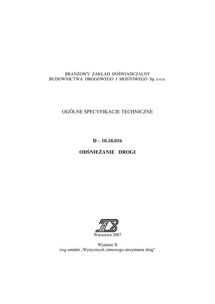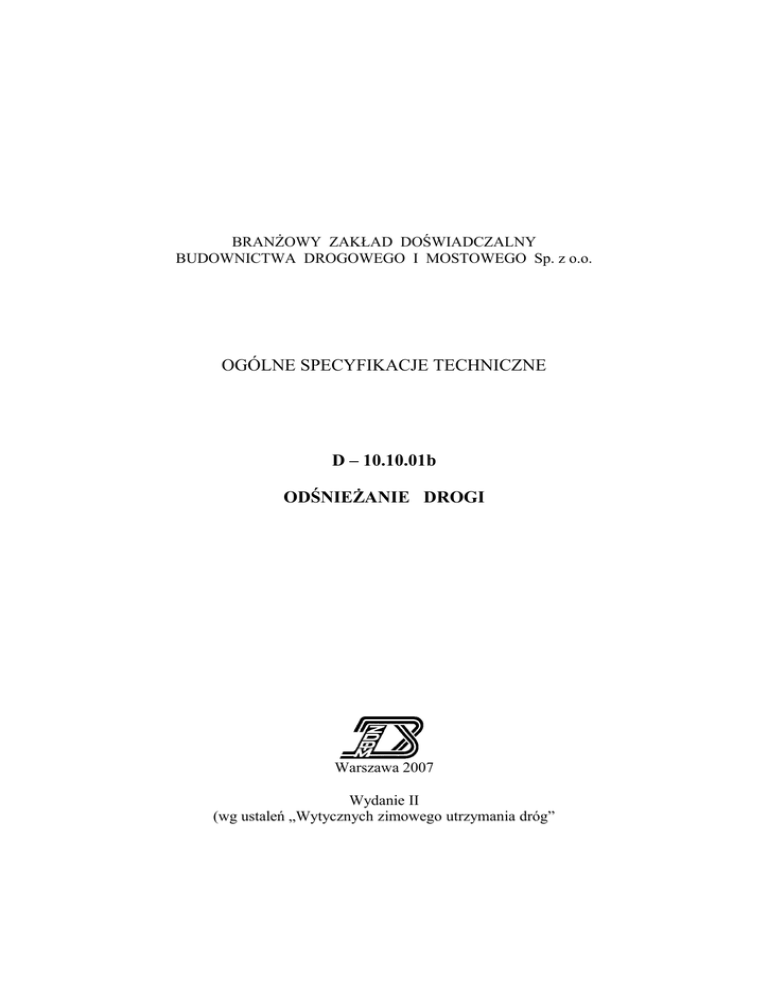 BRANŻOWY ZAKŁAD DOŚWIADCZALNY BUDOWNICTWA DROGOWEGO I MOSTOWEGO Sp. z o.o. OGÓLNE SPECYFIKACJE TECHNICZNE D – 10.10.01b ODŚNIEŻANIE DROGI Warszawa 2007 Wydanie II (wg ustaleń „Wytycznych zimowego utrzymania dróg” D-10.10.01b Odśnieżanie drogi GDDKiA z 2006 r.) 2 D-10.10.01b Odśnieżanie drogi 3 Jednostka autorska, opracowanie edytorskie i rozpowszechnienie: Branżowy Zakład Doświadczalny Budownictwa Drogowego i Mostowego Sp. z o.o. 03-808 Warszawa, ul. Mińska 25, tel./fax: 0-22 871-87-90 www.drogowa.strefa.pl Niniejsza ogólna specyfikacja techniczna jest materiałem pomocniczym do opracowania specyfikacji technicznej wykonania i odbioru robót budowlanych przy zlecaniu i realizacji robót na drogach i ulicach. Treść ogólnej specyfikacji technicznej jest aktualna na dzień 1 stycznia 2007 r. Przy sporządzaniu specyfikacji technicznej wykonania i odbioru robót budowlanych należy uaktualnić przepisy zawarte w wykorzystywanej niniejszej ogólnej specyfikacji technicznej. SPIS TREŚCI 1. WSTĘP...............................................................................................................................3 2. MATERIAŁY..................................................................................................................4 3. SPRZĘT...........................................................................................................................4 4. TRANSPORT..................................................................................................................6 5. WYKONANIE ROBÓT.................................................................................................6 6. KONTROLA JAKOŚCI ROBÓT.................................................................................9 7. OBMIAR ROBÓT.........................................................................................................10 8. ODBIÓR ROBÓT.........................................................................................................10 9. PODSTAWA PŁATNOŚCI.........................................................................................10 10. PRZEPISY ZWIĄZANE..............................................................................................11 11. ZAŁĄCZNIKI...............................................................................................................15 NAJWAŻNIEJSZE OZNACZENIA I SKRÓTY OST ST GDDKiA IBDiM IMGW - ogólna specyfikacja techniczna - specyfikacja techniczna wykonania i odbioru robót budowlanych - Generalna Dyrekcja Dróg Krajowych i Autostrad - Instytut Badawczy Dróg i Mostów - Instytut Meteorologii i Gospodarki Wodnej 4 Odśnieżanie drogi D-10.10.01b 1. WSTĘP 1.1. Przedmiot OST Przedmiotem niniejszej ogólnej specyfikacji technicznej (OST) są wymagania dotyczące wykonania i odbioru robót związanych z odśnieżaniem dróg. 1.2. Zakres stosowania OST Ogólna specyfikacja techniczna (OST) stanowi podstawę opracowania specyfikacji technicznej wykonania i odbioru robót budowlanych (ST) stosowanej jako dokument przetargowy i kontraktowy przy zlecaniu i realizacji robót na drogach i ulicach. 1.3. Zakres robót objętych OST Ustalenia zawarte w niniejszej specyfikacji dotyczą zasad prowadzenia robót związanych z usunięciem opadu śnieżnego, zalegającego jezdnię, pobocze oraz obiekty towarzyszące drodze, który stwarza utrudnienia w ruchu pojazdów. 1.4. Określenia podstawowe 1.4.1. Zimowe utrzymanie dróg (ZUD) – prace mające na celu zmniejszenie lub ograniczenie zakłóceń ruchu drogowego, wywołanych czynnikami atmosferycznymi, jak śliskość zimowa oraz opady śniegu. 1.4.2. Odśnieżanie drogi - usuwanie śniegu z jezdni i poboczy drogi oraz obiektów towarzyszących (zatok autobusowych, parkingów itp.). 1.4.3. Standard zimowego utrzymania drogi - ustalony przez zarządzającego drogą minimalny poziom utrzymania powierzchni jezdni i poboczy oraz dopuszczalne odstępstwa od standardu w warunkach występowania opadów śniegu (lub śliskości zimowej), jak również dopuszczalny maksymalny czas występowania tych odstępstw (przykład standardów odśnieżania dróg krajowych - zał. 2). 1.4.4. Śnieg luźny - nieusunięty lub pozostały na nawierzchni po przejściu pługów śnieg, który nie został zagęszczony pod wpływem ruchu kołowego. 1.4.5. Śnieg zajeżdżony - nieusunięty lub pozostały na nawierzchni po przejściu pługów śnieg, który został zagęszczony, ale nie stał się zlodowaciały. 1.4.6. Nabój śnieżny - nieusunięta zlodowaciała lub ubita warstwa śniegu o znacznej grubości (od kilku centymetrów), przymarznięta do nawierzchni jezdni. 1.4.7. Błoto pośniegowe - topniejący śnieg pozostały na nawierzchni po przejściu pługów i posypaniu jej środkami chemicznymi. 1.4.8. Nośnik pługa – pojazd o napędzie spalinowym (samochód ciężarowy, ciągnik, maszyna drogowa), na którym zamontowano pług odśnieżny (patrz zał. 3, rys. 1). 1.4.9. Pług odśnieżny - urządzenie składające się z odkładnicy, lemiesza i zawieszenia, montowane na nośniku pługa (patrz zał. 3, rys. 2). 1.4.10. Odkładnica – część składowa pługa z blachy stalowej lub tworzywa sztucznego, pozwalająca na odsunięcie śniegu poza krawędź oczyszczanego pasa (patrz zał. 3, rys. 2). 1.4.11. Lemiesz - część składowa pługa, należąca do korpusu płużnego, służąca do odspajania śniegu. Lemiesze mogą być stalowe oraz zakończone w dolnej części nakładkami z gumy lub tworzyw sztucznych (patrz zał. 3, rys. 2). 1.4.12. Czołownica - płyta czołowa, stanowiąca element łączący odkładnicę i lemiesz pługa z ramą nośnika pługa (patrz zał. 3, rys. 2). 1.4.13. Odśnieżarka - urządzenie montowane zwykle na nośniku, napędzane silnikiem spalinowym, służące do odspajania i odrzutu śniegu na odległość ok. 6 - 60 m poza obręb drogi, za pomocą odpowiednio skonstruowanych mechanizmów. Odśnieżarki dzielą się na