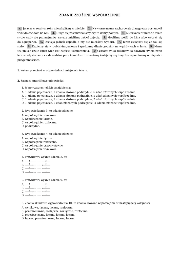 ZDANIE ZŁOŻONE WSPÓŁRZĘDNIE 1. Jeszcze w zeszłym roku mieszkaliśmy w mieście. wybudować dom na wsi. 2. Na wiosnę mama zachorowała dlatego tata postanowił 3. Długo się zastanawialiśmy czy to dobry pomysł. swoje wady ale przynajmniej zawsze mieliśmy jakieś zajęcie. 6. Decyzja jednak zapadła a my nie mieliśmy wyboru. do aquaparku. stało. 4. Mieszkanie w mieście miało 5. Mogliśmy pójść do kina albo wybrać się 7. Teraz cieszymy się że tak się 8. Kąpiemy się w pobliskim jeziorze i spędzamy długie godziny na wędrówkach w lesie. 9. Mama też już się czuje lepiej więc jest częściej uśmiechnięta. 10. Czasami tylko tęsknimy za dawnym stylem życia lecz wtedy siadamy z całą rodziną przy kominku rozmawiamy śmiejemy się i szybko zapominamy o miejskich przyjemnościach. 1. Wstaw przecinki w odpowiednich miejscach tekstu. 2. Zaznacz prawidłowe odpowiedzi. 1. W powyższym tekście znajduje się: A. 1 B. 1 C. 1 D. 1 zdanie zdanie zdanie zdanie pojedyncze, pojedyncze, pojedyncze, pojedyncze, 3 4 2 5 zdania złożone podrzędnie, 6 zdań złożonych zdania złożone podrzędnie, 5 zdań złożonych zdania złożone podrzędnie, 7 zdań złożonych zdań złożonych podrzędnie, 4 zdania złożone współrzędnie. współrzędnie. współrzędnie. współrzędnie. 2. Wypowiedzenie 3. to zdanie złożone: A. współrzędnie wynikowe. B. współrzędnie łączne. C. współrzędnie rozłączne. D. podrzędne. 3. Wypowiedzenie 4. to zdanie złożone: A. współrzędnie B. współrzędnie C. współrzędnie D. współrzędnie łączne. rozłączne. przeciwstawne. wynikowe. 4. Prawidłowy wykres zdania 8. to: A. B. C. D. 5. Prawidłowy wykres zdania 9. to: A. B. C. D. 6. Zdania składowe wypowiedzenia 10. to zdania złożone współrzędnie w następującej kolejności: A. wynikowe, łączne, łączne, rozłączne. B. przeciwstawne, rozłączne, rozłączne, rozłączne. C. przeciwstawne, łączne, łączne, łączne. D. łączne, przeciwstawne, łączne, łączne. 7. Wykres zdania 7. to: A. B. C. D. 8. Jeżeli zmienimy spójnik w zdaniu 8. na spójnik lub, to utworzymy zdanie: A. złożone B. złożone C. złożone D. złożone współrzędnie współrzędnie współrzędnie współrzędnie łączne. wynikowe. przeciwstawne. rozłączne. 9. Jeżeli zmienimy spójnik w zdaniu 9. na spójnik zatem, to: A. utworzymy zdanie złożone współrzędnie łączne. B. utworzymy zdanie złożone współrzędnie wynikowe. C. utworzymy zdanie złożone podrzędnie. D. nie zmienimy rodzaju zdania złożonego. 10. Aby nie zmienić typu zdania złożonego, spójnik w zdaniu 2. możemy zamienić na spójniki: A. zatem, i, więc. B. zatem, więc, toteż. C. zatem, ponieważ, więc. D. i, ponieważ, toteż. 3. Zredaguj zdania na temat tego, co można robić na wsi. W tym celu utwórz następujące typy zdań: a) zdanie złożone współrzędnie łączne ............................................................................................................................... ................................................ ............................................................................................................................... ................................................ b) zdanie złożone współrzędnie rozłączne ............................................................................................................................... ................................................ ............................................................................................................................... ................................................ 4. Zredaguj zdania, w których podasz powody podjęcia decyzji o przeprowadzce na wieś. W tym celu utwórz następujące typy zdań: a) zdanie złożone podrzędnie ............................................................................................................................... ................................................ ............................................................................................................................... ................................................ b) zdanie złożone współrzędnie ............................................................................................................................... ................................................ ............................................................................................................................... ................................................