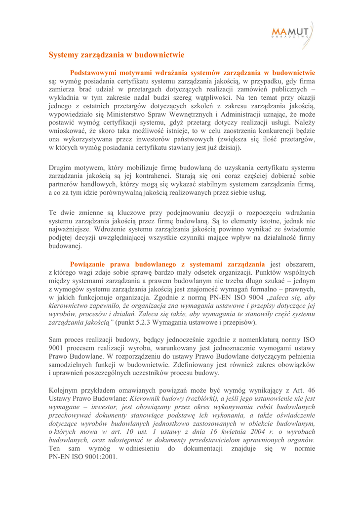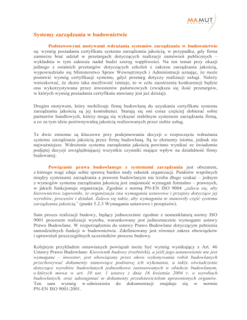Systemy zarządzania w budownictwie Podstawowymi motywami wdrażania systemów zarządzania w budownictwie są: wymóg posiadania certyfikatu systemu zarządzania jakością, w przypadku, gdy firma zamierza brać udział w przetargach dotyczących realizacji zamówień publicznych – wykładnia w tym zakresie nadal budzi szereg wątpliwości. Na ten temat przy okazji jednego z ostatnich przetargów dotyczących szkoleń z zakresu zarządzania jakością, wypowiedziało się Ministerstwo Spraw Wewnętrznych i Administracji uznając, że może postawić wymóg certyfikacji systemu, gdyż przetarg dotyczy realizacji usługi. Należy wnioskować, że skoro taka możliwość istnieje, to w celu zaostrzenia konkurencji będzie ona wykorzystywana przez inwestorów państwowych (zwiększa się ilość przetargów, w których wymóg posiadania certyfikatu stawiany jest już dzisiaj). Drugim motywem, który mobilizuje firmę budowlaną do uzyskania certyfikatu systemu zarządzania jakością są jej kontrahenci. Starają się oni coraz częściej dobierać sobie partnerów handlowych, którzy mogą się wykazać stabilnym systemem zarządzania firmą, a co za tym idzie porównywalną jakością realizowanych przez siebie usług. Te dwie zmienne są kluczowe przy podejmowaniu decyzji o rozpoczęciu wdrażania systemu zarządzania jakością przez firmę budowlaną. Są to elementy istotne, jednak nie najważniejsze. Wdrożenie systemu zarządzania jakością powinno wynikać ze świadomie podjętej decyzji uwzględniającej wszystkie czynniki mające wpływ na działalność firmy budowanej. Powiązanie prawa budowlanego z systemami zarządzania jest obszarem, z którego wagi zdaje sobie sprawę bardzo mały odsetek organizacji. Punktów wspólnych między systemami zarządzania a prawem budowlanym nie trzeba długo szukać – jednym z wymogów systemu zarządzania jakością jest znajomość wymagań formalno – prawnych, w jakich funkcjonuje organizacja. Zgodnie z normą PN-EN ISO 9004 „zaleca się, aby kierownictwo zapewniło, że organizacja zna wymagania ustawowe i przepisy dotyczące jej wyrobów, procesów i działań. Zaleca się także, aby wymagania te stanowiły część systemu zarządzania jakością” (punkt 5.2.3 Wymagania ustawowe i przepisów). Sam proces realizacji budowy, będący jednocześnie zgodnie z nomenklaturą normy ISO 9001 procesem realizacji wyrobu, warunkowany jest jednoznacznie wymogami ustawy Prawo Budowlane. W rozporządzeniu do ustawy Prawo Budowlane dotyczącym pełnienia samodzielnych funkcji w budownictwie. Zdefiniowany jest również zakres obowiązków i uprawnień poszczególnych uczestników procesu budowy. Kolejnym przykładem omawianych powiązań może być wymóg wynikający z Art. 46 Ustawy Prawo Budowlane: Kierownik budowy (rozbiórki), a jeśli jego ustanowienie nie jest wymagane – inwestor, jest obowiązany przez okres wykonywania robót budowlanych przechowywać dokumenty stanowiące podstawę ich wykonania, a także oświadczenie dotyczące wyrobów budowlanych jednostkowo zastosowanych w obiekcie budowlanym, o których mowa w art. 10 ust. 1 ustawy z dnia 16 kwietnia 2004 r. o wyrobach budowlanych, oraz udostępniać te dokumenty przedstawicielom uprawnionych organów. Ten sam wymóg w odniesieniu do dokumentacji znajduje się w normie PN-EN ISO 9001:2001. 4.2.3 Nadzór nad dokumentami Dokumenty wymagane w systemie zarządzania jakością powinny być nadzorowane. Zapisy są specjalnym rodzajem dokumentu i należy je nadzorować zgodnie z wymaganiami podanymi w 4.2.4. Należy ustanowić udokumentowaną procedurę, aby określić nadzór potrzebny do: zatwierdzania dokumentów pod kątem ich adekwatności, zanim zostaną wydane, przeglądu dokumentów i ich aktualizowania w razie potrzeby oraz ponownego zatwierdzania, zapewnienia, że zidentyfikowano zmiany i aktualny status zmian dokumentów, zapewnienia, że odpowiednie wersje mających zastosowanie dokumentów są dostępne w miejscach ich użytkowania, zapewnienia, że dokumenty są zawsze czytelne i łatwe do zidentyfikowania, zapewnienia, że dokumenty pochodzące z zewnątrz są zidentyfikowane i ich rozpowszechnianie jest nadzorowane, zapobiegania niezamierzonemu stosowaniu nieaktualnych dokumentów i odpowiedniego ich oznaczania, jeżeli są zachowane z jakichkolwiek powodów. Przykłady można by mnożyć, jedno jest pewne - wszystkie opisane wyżej zależności powinny znaleźć odwzorowanie w stworzonym Systemie Zarządzania Jakością po to, aby był on przydatny Państwa Organizacji. Specyfika wdrożeń w firmach budowlanych wynika przede wszystkim z opisanych już wcześniej zmiennych, z wymogów prawa budowlanego oraz z charakteru realizowanych usług. Specyficzne podejście wiąże się m.in. z realizacją procesu głównego, czyli usługi budowlanej. W budownictwie nie występuje bowiem wyrób niezgodny z wymaganiami, gdyż skuteczną barierą są protokoły odbioru – jeśli usługa nie spełnia założonych wymogów powstaje protokół rozbieżności, na podstawie którego dokonywane są poprawki do momentu, w którym inwestor podpisuje protokół odbioru. Zatem nie możliwa jest sytuacja oddania wyrobu niezgodnego i takie podejście warunkuje procedurę działań korygujących. Na koniec należy poruszyć rzecz bardzo istotną, o której również często się zapomina – system zarządzania tworzą przede wszystkim ludzie, podczas gdy w budownictwie większość pracowników to pracownicy fizyczni. Jest to bardzo istotna bariera, która wymaga od konsultanta odpowiedniego podejścia, aby wdrożony System Zarządzania Jakością był dla wszystkich zrozumiały, a co się z tym wiąże - skuteczny.
