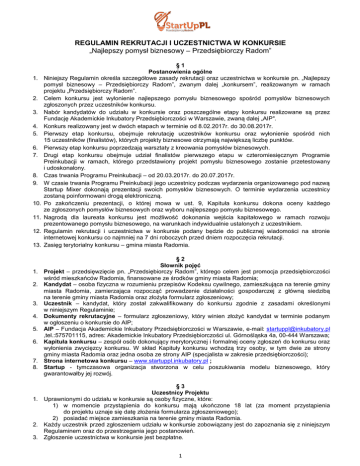 REGULAMIN REKRUTACJI I UCZESTNICTWA W KONKURSIE „Najlepszy pomysł biznesowy – Przedsiębiorczy Radom” 1. 2. 3. 4. 5. 6. 7. 8. 9. 10. 11. 12. 13. 1. 2. 3. 4. 5. 6. 7. 8. §1 Postanowienia ogólne Niniejszy Regulamin określa szczegółowe zasady rekrutacji oraz uczestnictwa w konkursie pn. „Najlepszy pomysł biznesowy – Przedsiębiorczy Radom”, zwanym dalej „konkursem”, realizowanym w ramach projektu „Przedsiębiorczy Radom”. Celem konkursu jest wyłonienie najlepszego pomysłu biznesowego spośród pomysłów biznesowych zgłoszonych przez uczestników konkursu. Nabór kandydatów do udziału w konkursie oraz poszczególne etapy konkursu realizowane są przez Fundację Akademickie Inkubatory Przedsiębiorczości w Warszawie, zwaną dalej „AIP". Konkurs realizowany jest w dwóch etapach w terminie od 8.02.2017r. do 30.08.2017r. Pierwszy etap konkursu, obejmuje rekrutację uczestników konkursu oraz wyłonienie spośród nich 15 uczestników (finalistów), których projekty biznesowe otrzymają największą liczbę punktów. Pierwszy etap konkursu poprzedzają warsztaty z kreowania pomysłów biznesowych. Drugi etap konkursu obejmuje udział finalistów pierwszego etapu w czteromiesięcznym Programie Preinkubacji w ramach, którego przedstawiony projekt pomysłu biznesowego zostanie przetestowany i udoskonalony. Czas trwania Programu Preinkubacji – od 20.03.2017r. do 20.07.2017r. W czasie trwania Programu Preinkubacji jego uczestnicy podczas wydarzenia organizowanego pod nazwą Startup Mixer dokonają prezentacji swoich pomysłów biznesowych. O terminie wydarzenia uczestnicy zostaną poinformowani drogą elektroniczną. Po zakończeniu prezentacji, o której mowa w ust. 9, Kapituła konkursu dokona oceny każdego ze zgłoszonych pomysłów biznesowych oraz wyboru najlepszego pomysłu biznesowego. Nagrodą dla laureata konkursu jest możliwość dokonania wejścia kapitałowego w ramach rozwoju prezentowanego pomysłu biznesowego, na warunkach indywidualnie ustalonych z uczestnikiem. Regulamin rekrutacji i uczestnictwa w konkursie podany będzie do publicznej wiadomości na stronie internetowej konkursu co najmniej na 7 dni roboczych przed dniem rozpoczęcia rekrutacji. Zasięg terytorialny konkursu – gmina miasta Radomia. §2 Słownik pojęć Projekt – przedsięwzięcie pn. „Przedsiębiorczy Radom”, którego celem jest promocja przedsiębiorczości wśród mieszkańców Radomia, finansowane ze środków gminy miasta Radomia; Kandydat – osoba fizyczna w rozumieniu przepisów Kodeksu cywilnego, zamieszkująca na terenie gminy miasta Radomia, zamierzająca rozpocząć prowadzenie działalności gospodarczej z główną siedzibą na terenie gminy miasta Radomia oraz złożyła formularz zgłoszeniowy; Uczestnik – kandydat, który został zakwalifikowany do konkursu zgodnie z zasadami określonymi w niniejszym Regulaminie; Dokumenty rekrutacyjne – formularz zgłoszeniowy, który winien złożyć kandydat w terminie podanym w ogłoszeniu o konkursie do AIP; AIP – Fundacja Akademickie Inkubatory Przedsiębiorczości w Warszawie, e-mail: [email protected] ,tel.:575701115, adres: Akademickie Inkubatory Przedsiębiorczości ul. Górnośląska 4a, 00-444 Warszawa; Kapituła konkursu – zespół osób dokonujący merytorycznej i formalnej oceny zgłoszeń do konkursu oraz wyłonienia zwycięzcy konkursu. W skład Kapituły konkursu wchodzą trzy osoby, w tym dwie ze strony gminy miasta Radomia oraz jedna osoba ze strony AIP (specjalista w zakresie przedsiębiorczości); Strona internetowa konkursu – www.startuppl.inkubatory.pl ; Startup - tymczasowa organizacja stworzona w celu poszukiwania modelu biznesowego, który gwarantowałby jej rozwój. §3 Uczestnicy Projektu 1. Uprawnionymi do udziału w konkursie są osoby fizyczne, które: 1) w momencie przystąpienia do konkursu mają ukończone 18 lat (za moment przystąpienia do projektu uznaje się datę złożenia formularza zgłoszeniowego); 2) posiadać miejsce zamieszkania na terenie gminy miasta Radomia. 2. Każdy uczestnik przed zgłoszeniem udziału w konkursie zobowiązany jest do zapoznania się z niniejszym Regulaminem oraz do przestrzegania jego postanowień. 3. Zgłoszenie uczestnictwa w konkursie jest bezpłatne. 1 4. Uczestnik pokrywa we własnym zakresie koszty dojazdu, ewentualne koszty noclegu oraz koszty przygotowania projektu biznesowego, w tym koszty jego prezentacji. 5. Uczestnicy, których projekty biznesowe zakwalifikowane zostaną do udziału w konkursie podpiszą umowę o świadczenie usług szkoleniowo-doradczych w ciągu 14 dni od daty opublikowania listy osób zakwalifikowanych do konkursu. 6. Niepodpisanie umowy o świadczenie usług szkoleniowo-doradczych w terminie określonym w ust. 5 skutkuje skreśleniem uczestnika z listy osób zakwalifikowanych do udziału w konkursie. Zwolnione miejsce zajmuje uczestnik z listy rezerwowej z największą ilością punktów. 7. Uczestnicy zakwalifikowani do konkursu są zobowiązani do uczestnictwa w Programie Preinkubacji (cztery miesiące), szkoleniach i doradztwie, przestrzegania niniejszego Regulaminu oraz stosowania się do uwag i zaleceń AIP w zakresie dotyczącym obowiązków uczestnika konkursu. 8. Uczestnik, o którym mowa w ust. 7, zostaje wykluczony z uczestnictwa w konkursie, gdy: 1) nie będzie uczestniczył w Programie Preinkubacji przez okres jednego miesiąca; 2) złoży oświadczenie w formularzu zgłoszeniowym poświadczające nieprawdę. 9. W przypadku określonym w ust. 8 uczestnik zobowiązany jest do pokrycia w całości kosztów związanych z jego udziałem w Programie Preinkubacji. 10. Uczestnik niezakwalifikowany do konkursu zostanie poinformowany drogą elektroniczną o przyczynach odrzucenia jego aplikacji wraz z uzasadnieniem. §4 Wyłączenia z udziału w konkursie 1. W konkursie nie mogą brać udziału: 1) osoby, które łączy lub łączył z osobą uczestniczącą w procesie rekrutacji i oceny projektów bi