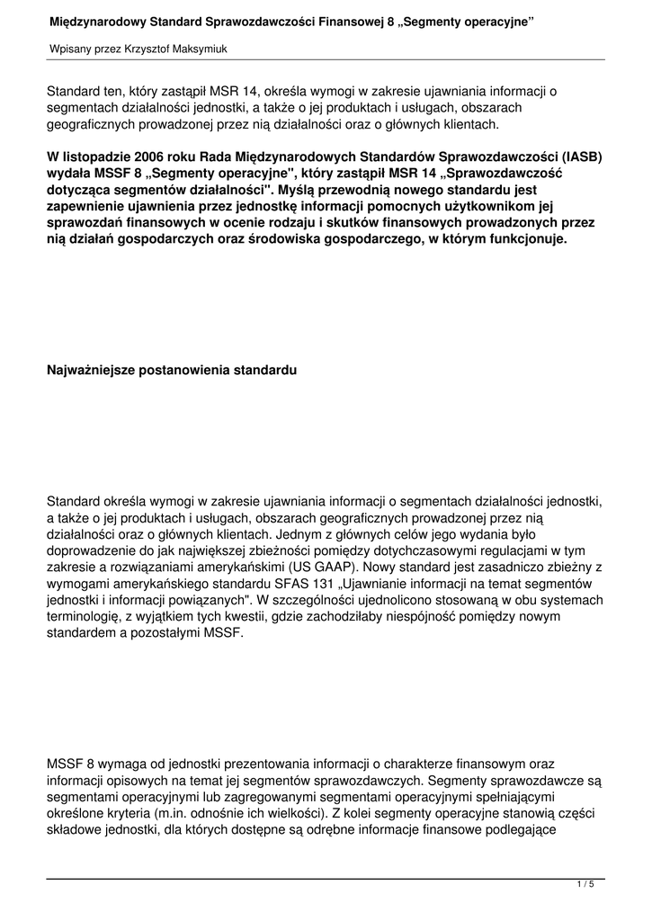 Międzynarodowy Standard Sprawozdawczości Finansowej 8 „Segmenty operacyjne” Wpisany przez Krzysztof Maksymiuk Standard ten, który zastąpił MSR 14, określa wymogi w zakresie ujawniania informacji o segmentach działalności jednostki, a także o jej produktach i usługach, obszarach geograficznych prowadzonej przez nią działalności oraz o głównych klientach. W listopadzie 2006 roku Rada Międzynarodowych Standardów Sprawozdawczości (IASB) wydała MSSF 8 „Segmenty operacyjne", który zastąpił MSR 14 „Sprawozdawczość dotycząca segmentów działalności". Myślą przewodnią nowego standardu jest zapewnienie ujawnienia przez jednostkę informacji pomocnych użytkownikom jej sprawozdań finansowych w ocenie rodzaju i skutków finansowych prowadzonych przez nią działań gospodarczych oraz środowiska gospodarczego, w którym funkcjonuje. Najważniejsze postanowienia standardu Standard określa wymogi w zakresie ujawniania informacji o segmentach działalności jednostki, a także o jej produktach i usługach, obszarach geograficznych prowadzonej przez nią działalności oraz o głównych klientach. Jednym z głównych celów jego wydania było doprowadzenie do jak największej zbieżności pomiędzy dotychczasowymi regulacjami w tym zakresie a rozwiązaniami amerykańskimi (US GAAP). Nowy standard jest zasadniczo zbieżny z wymogami amerykańskiego standardu SFAS 131 „Ujawnianie informacji na temat segmentów jednostki i informacji powiązanych". W szczególności ujednolicono stosowaną w obu systemach terminologię, z wyjątkiem tych kwestii, gdzie zachodziłaby niespójność pomiędzy nowym standardem a pozostałymi MSSF. MSSF 8 wymaga od jednostki prezentowania informacji o charakterze finansowym oraz informacji opisowych na temat jej segmentów sprawozdawczych. Segmenty sprawozdawcze są segmentami operacyjnymi lub zagregowanymi segmentami operacyjnymi spełniającymi określone kryteria (m.in. odnośnie ich wielkości). Z kolei segmenty operacyjne stanowią części składowe jednostki, dla których dostępne są odrębne informacje finansowe podlegające 1/5 Międzynarodowy Standard Sprawozdawczości Finansowej 8 „Segmenty operacyjne” Wpisany przez Krzysztof Maksymiuk regularnej ocenie przez jej główny organ podejmujący decyzje operacyjne. Standard wymaga, aby informacje dotyczące segmentów działalności były ujawniane w taki sposób, jaki wykorzystują organy zarządzające w bieżącym kierowaniu firmą. Oznacza to, że z chwilą wejścia standardu w życie może ulec znacznemu zwiększeniu zakres ujawnianych informacji. Nie jest bowiem tajemnicą, że decyzje w jednostkach zapadają na znacznie niższych poziomach działalności niż dotychczas prezentowane w sprawozdaniach finansowych zgodnie z MSR 14. Standard wymaga prezentowania wyniku segmentu oraz jego aktywów. Konieczne jest również ujawnienie zobowiązań, określonych przychodów i kosztów segmentu, jeżeli takie dane są regularnie przedstawiane kierownictwu podejmującemu decyzje operacyjne. Niezbędne jest uzgodnienie łącznych przychodów, wyników, aktywów i innych danych odnośnie segmentów sprawozdawczych z odpowiednimi kwotami w sprawozdaniu finansowym. Jednostka zobowiązana jest również ujawnić informacje na temat przychodów uzyskiwanych z jej produktów i usług, krajów, w których są uzyskiwane przychody lub zlokalizowane aktywa, a także na temat głównych klientów. Te ujawnienia są niezbędne niezależnie od tego czy są wykorzystywane przez kierownictwo jednostki w bieżącym zarządzaniu. Jednakże, jeżeli wymagane przez standard dane nie są dostępne, a koszt ich sporządzenia byłby znaczący, jednostka może odstąpić od ich ujawnienia. Jednostki są również zobowiązane do zamieszczenia opisowych informacji na temat sposobu wyodrębnienia segmentów działalności, produktów i usług pochodzących z poszczególnych segmentów, różnic w sposobie wyceny pomiędzy sprawozdawczością segmentów a sprawozdawczością finansową, a także na temat zmian w wycenie danych dotyczących segmentów pomiędzy segmentami. 2/5 Międzynarodowy Standard Sprawozdawczości Finansowej 8 „Segmenty operacyjne” Wpisany przez Krzysztof Maksymiuk Nowy standard należy stosować w odniesieniu do rocznych okresów sprawozdawczych rozpoczynających się 1 stycznia 2009 roku i później. Możliwe jest także wcześniejsze zastosowanie standardu, co wiąże się z koniecznością stosownego ujawnienia w sprawozdaniu finansowym. Różnice pomiędzy MSSF 8 a MSR 14 MSSF 8 zastępuje dotychczasowy MSR 14 „Sprawozdawczość dotycząca segmentów działalności". Najistotniejsze wprowadzone zmiany dotyczą określenia segmentów, wyceny danych finansowych na temat segmentów i ujawnienia informacji. Poniżej przedstawiono ich podsumowanie. Określenie segmentów operacyjnych Segment operacyjny podlega identyfikacji na podstawie wewnętrznych raportów, które są przedmiotem regularnego przeglądu dokonywanego przez główny organ odpowiedzialny za podejmowanie decyzji operacyjnych w odniesieniu do segmentu oraz za ocenę wyników jego działalności. Takie podejście zastępuje pojęcia podstawowego i uzupełniającego segmentu sprawozdawczego zawarte w MSR 14 oparte na kryteriach branżowym i geograficznym. Segmentem operacyjnym może być również część jednostki, która prowadzi sprzedaż głównie lub wyłącznie na rzecz innych segmentów operacyjnych, jeżeli w taki sposób jest ukształtowana struktura firmy. MSR 14 ograniczał zakres segmentów sprawozdawczych do tych segmentów, które uzyskują większość swoich przychodów ze sprzedaży na zewnątrz. 3/5 Międzynarodowy Standard Sprawozdawczości Finansowej 8 „Segmenty operacyjne” Wpisany przez Krzysztof Maksymiuk Wycena Dane finansowe prezentowane w odniesieniu do poszczególnych pozycji segmentu operacyjnego muszą wynikać z informacji przedstawianych głównemu organowi podejmującemu decyz