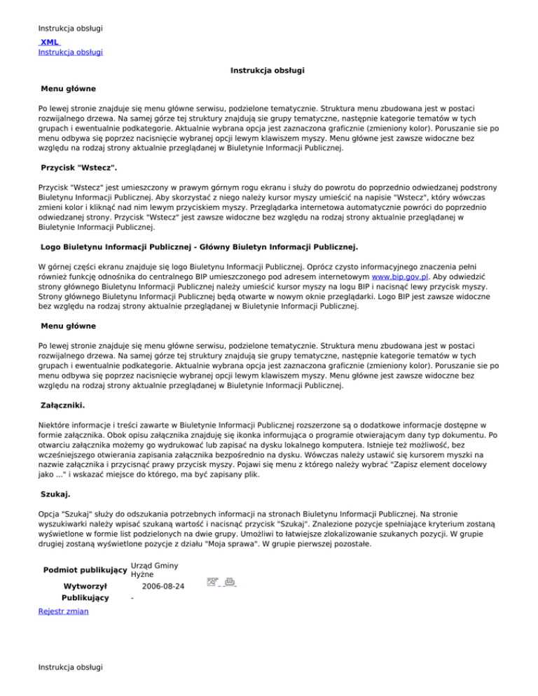 Instrukcja obsługi XML Instrukcja obsługi Instrukcja obsługi Menu główne Po lewej stronie znajduje się menu główne serwisu, podzielone tematycznie. Struktura menu zbudowana jest w postaci rozwijalnego drzewa. Na samej górze tej struktury znajdują sie grupy tematyczne, następnie kategorie tematów w tych grupach i ewentualnie podkategorie. Aktualnie wybrana opcja jest zaznaczona graficznie (zmieniony kolor). Poruszanie sie po menu odbywa się poprzez nacisnięcie wybranej opcji lewym klawiszem myszy. Menu główne jest zawsze widoczne bez względu na rodzaj strony aktualnie przeglądanej w Biuletynie Informacji Publicznej. Przycisk "Wstecz". Przycisk "Wstecz" jest umieszczony w prawym górnym rogu ekranu i służy do powrotu do poprzednio odwiedzanej podstrony Biuletynu Informacji Publicznej. Aby skorzystać z niego należy kursor myszy umieścić na napisie "Wstecz", który wówczas zmieni kolor i kliknąć nad nim lewym przyciskiem myszy. Przeglądarka internetowa automatycznie powróci do poprzednio odwiedzanej strony. Przycisk "Wstecz" jest zawsze widoczne bez względu na rodzaj strony aktualnie przeglądanej w Biuletynie Informacji Publicznej. Logo Biuletynu Informacji Publicznej - Główny Biuletyn Informacji Publicznej. W górnej części ekranu znajduje się logo Biuletynu Informacji Publicznej. Oprócz czysto informacyjnego znaczenia pełni również funkcję odnośnika do centralnego BIP umieszczonego pod adresem internetowym www.bip.gov.pl. Aby odwiedzić strony głównego Biuletynu Informacji Publicznej należy umieścić kursor myszy na logu BIP i nacisnąć lewy przycisk myszy. Strony głównego Biuletynu Informacji Publicznej będą otwarte w nowym oknie przeglądarki. Logo BIP jest zawsze widoczne bez względu na rodzaj strony aktualnie przeglądanej w Biuletynie Informacji Publicznej. Menu główne Po lewej stronie znajduje się menu główne serwisu, podzielone tematycznie. Struktura menu zbudowana jest w postaci rozwijalnego drzewa. Na samej górze tej struktury znajdują sie grupy tematyczne, następnie kategorie tematów w tych grupach i ewentualnie podkategorie. Aktualnie wybrana opcja jest zaznaczona graficznie (zmieniony kolor). Poruszanie sie po menu odbywa się poprzez nacisnięcie wybranej opcji lewym klawiszem myszy. Menu główne jest zawsze widoczne bez względu na rodzaj strony aktualnie przeglądanej w Biuletynie Informacji Publicznej. Załączniki. Niektóre informacje i treści zawarte w Biuletynie Informacji Publicznej rozszerzone są o dodatkowe informacje dostępne w formie załącznika. Obok opisu załącznika znajduję się ikonka informująca o programie otwierającym dany typ dokumentu. Po otwarciu załącznika możemy go wydrukować lub zapisać na dysku lokalnego komputera. Istnieje też możliwość, bez wcześniejszego otwierania zapisania załącznika bezpośrednio na dysku. Wówczas należy ustawić się kursorem myszki na nazwie załącznika i przycisnąć prawy przycisk myszy. Pojawi się menu z którego należy wybrać "Zapisz element docelowy jako ..." i wskazać miejsce do którego, ma być zapisany plik. Szukaj. Opcja "Szukaj" służy do odszukania potrzebnych informacji na stronach Biuletynu Informacji Publicznej. Na stronie wyszukiwarki należy wpisać szukaną wartość i nacisnąć przycisk "Szukaj". Znalezione pozycje spełniające kryterium zostaną wyświetlone w formie list podzielonych na dwie grupy. Umożliwi to łatwiejsze zlokalizowanie szukanych pozycji. W grupie drugiej zostaną wyświetlone pozycje z działu "Moja sprawa". W grupie pierwszej pozostałe. Podmiot publikujący Urząd Gminy Hyżne Wytworzył Publikujący Rejestr zmian Instrukcja obsługi 2006-08-24 -