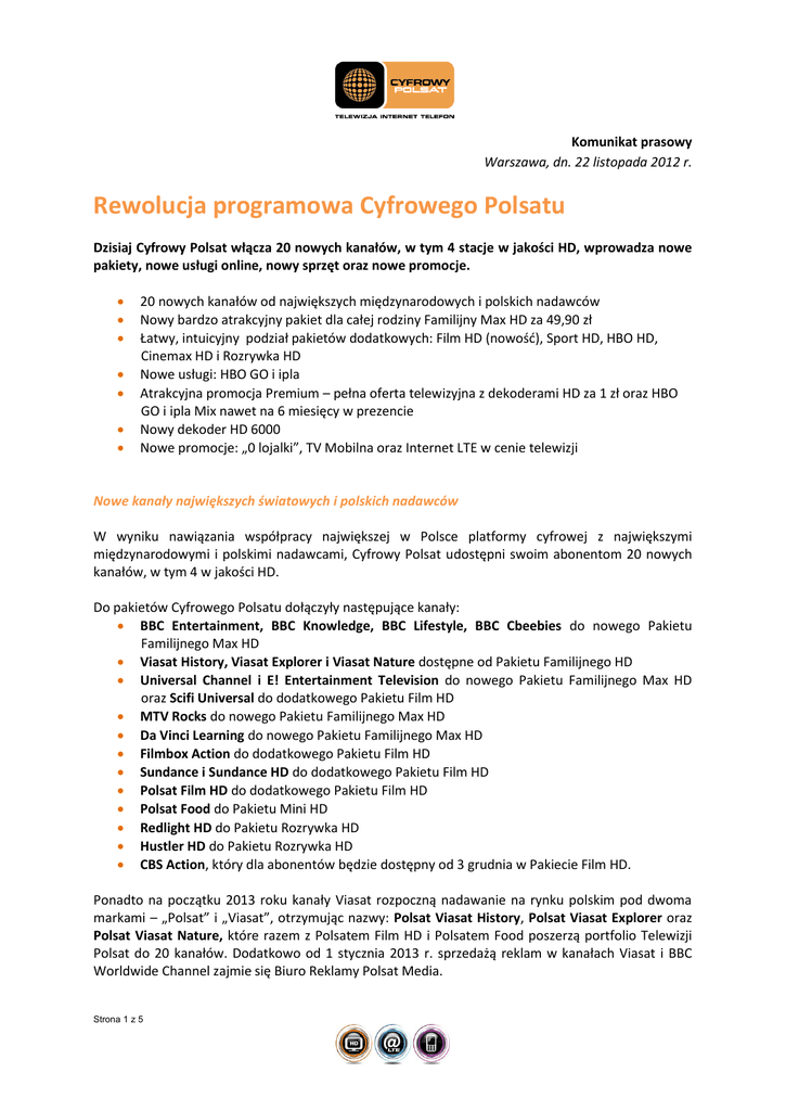 Komunikat prasowy Warszawa, dn. 22 listopada 2012 r. Rewolucja programowa Cyfrowego Polsatu Dzisiaj Cyfrowy Polsat włącza 20 nowych kanałów, w tym 4 stacje w jakości HD, wprowadza nowe pakiety, nowe usługi online, nowy sprzęt oraz nowe promocje. 20 nowych kanałów od największych międzynarodowych i polskich nadawców Nowy bardzo atrakcyjny pakiet dla całej rodziny Familijny Max HD za 49,90 zł Łatwy, intuicyjny podział pakietów dodatkowych: Film HD (nowość), Sport HD, HBO HD, Cinemax HD i Rozrywka HD Nowe usługi: HBO GO i ipla Atrakcyjna promocja Premium – pełna oferta telewizyjna z dekoderami HD za 1 zł oraz HBO GO i ipla Mix nawet na 6 miesięcy w prezencie Nowy dekoder HD 6000 Nowe promocje: „0 lojalki”, TV Mobilna oraz Internet LTE w cenie telewizji Nowe kanały największych światowych i polskich nadawców W wyniku nawiązania współpracy największej w Polsce platformy cyfrowej z największymi międzynarodowymi i polskimi nadawcami, Cyfrowy Polsat udostępni swoim abonentom 20 nowych kanałów, w tym 4 w jakości HD. Do pakietów Cyfrowego Polsatu dołączyły następujące kanały: BBC Entertainment, BBC Knowledge, BBC Lifestyle, BBC Cbeebies do nowego Pakietu Familijnego Max HD Viasat History, Viasat Explorer i Viasat Nature dostępne od Pakietu Familijnego HD Universal Channel i E! Entertainment Television do nowego Pakietu Familijnego Max HD oraz Scifi Universal do dodatkowego Pakietu Film HD MTV Rocks do nowego Pakietu Familijnego Max HD Da Vinci Learning do nowego Pakietu Familijnego Max HD Filmbox Action do dodatkowego Pakietu Film HD Sundance i Sundance HD do dodatkowego Pakietu Film HD Polsat Film HD do dodatkowego Pakietu Film HD Polsat Food do Pakietu Mini HD Redlight HD do Pakietu Rozrywka HD Hustler HD do Pakietu Rozrywka HD CBS Action, który dla abonentów będzie dostępny od 3 grudnia w Pakiecie Film HD. Ponadto na początku 2013 roku kanały Viasat rozpoczną nadawanie na rynku polskim pod dwoma markami – „Polsat” i „Viasat”, otrzymując nazwy: Polsat Viasat History, Polsat Viasat Explorer oraz Polsat Viasat Nature, które razem z Polsatem Film HD i Polsatem Food poszerzą portfolio Telewizji Polsat do 20 kanałów. Dodatkowo od 1 stycznia 2013 r. sprzedażą reklam w kanałach Viasat i BBC Worldwide Channel zajmie się Biuro Reklamy Polsat Media. Strona 1 z 5 Łącznie abonenci Cyfrowego Polsatu mają do dyspozycji aż 127 kanałów kodowanych, 34 stacje w jakości HD oraz ponad 500 kanałów niekodowanych. Już wkrótce operator przedstawi kolejne nowości programowe. Nowe kanały Telewizji Polsat - Polsat Food i Polsat Film HD Polsat Food to nowy kanał kulinarno-lifestyle’owy Telewizji Polsat (znany na całym świecie pod marką Food Network), uruchomiony we współpracy ze Scripps Networks Interactive. Polsat Food prezentuje mieszankę atrakcyjnych programów o gotowaniu, świeżych pomysłów i żywej rozrywki, która inspiruje zarówno smakoszy, jak i kulinarnych laików. Kanał istnieje na rynku od 1993 r. i jest najbardziej popularnym kulinarnym kanałem telewizyjnym, dostępnym w 96 mln gospodarstw domowych. Zapewnia bardzo bogatą ofertę programową - najwyższej jakości i najchętniej oglądalne programy, ekskluzywny dostęp do największej biblioteki kulinarnej świata, 600 godzin nowych treści każdego roku. Polsat Food będzie docierał ze swoją 24-godzinną ramówką do 3,5 mln abonentów platformy. Znajdzie się w podstawowym Pakiecie Mini HD Cyfrowego Polsatu oraz będzie dostępny w polskiej i angielskiej wersji językowej. Najnowszy kanał produkcji Telewizji Polsat – Polsat Film HD – to bliźniacza wersja nadawanego od 2009 r. kanału Polsat Film, będącego w czołówce najchętniej oglądanych kanałów filmowych. Kanał skierowany do dojrzałych kinomanów powyżej 30 roku życia, mieszkających w małych i średnich miastach, którzy z racji miejsca zamieszkania mają ograniczony dostęp do dobrej klasycznej światowej kinematografii. Wyjątkową jakość repertuaru zapewnia m.in.: umowa z Sony Pictures, jedną z największych wytwórni na świecie oraz Twentieth Century Fox, a także wielu dystrybutorów europejskich Nowe, bogatsze pakiety podstawowe Nowa oferta pakietów Cyfrowego Polsatu jest nie tylko bogatsza, ale jednocześnie bardziej intuicyjna. Nowością jest poszerzony pakiet dla całej rodziny Pakiet Familijny Max HD z 12 nowymi kanałami o tematyce edukacyjnej (m.in. BBC Knowledge, Viasat History), przyrodniczej (Viasat Nature), rozrywkowej (E! Entertainment, BBC Lifestyle) i muzycznej (MTV Rocks). Pakiet Familijny Max HD zawiera 86 kanałów kodowanych, z czego 16 w jakości HD. To bogaty zbiór najchętniej oglądanych stacji telewizyjnych, zapewniający najlepszy stosunek jakości do ceny – miesięczny dostęp do pakietu kosztuje 49,90 zł, a na dwóch telewizorach tylko 59,90 zł. Pakiet Rodzinny HD - który teraz dostępny jest także dla nowych abonentów Cyfrowego Polsatu w cenie 24,90 zł – pozwala na odbiór łącznie 41 kanałów, w tym 6 w jakości HD. Natomiast Pakiet Familijny HD to zestaw 66 kanałów polskojęzycznych, w tym 10 kanałów w HD. Klienci najmniejsze pakietu operatora - Mini HD za 14,90 zł - dostają 28 kanałów polskojęzycznych, w tym 6 stacji HD oraz możliwość skorzystania bez opłat z pakietu Rodzinnego HD nawet przez 6 miesięcy. Nowy podział pakietów tematycznych Fani filmu i sportu mogą wzbogacić ofertę podstawową o pakiety dodatkowe – nowy Pakiet Film HD i Sport HD. Film HD to razem aż 17 nowych filmowych kanałów kodowanych, w tym 6 nowości i 5 stacji w jakości HD. Pakiet Sport HD to 10 najlepszych kanałów sportowych, w tym 4 w HD. Obydwa pakiety są dostępne promocyjnie przez 6 miesięcy bez opłat, po tym okresie wynosi ona 10 zł miesięcznie. Strona 2 z 5 Wzbogacony o 2 kanały został także Pakiet Rozrywka HD z treściami dla dorosłych widzów. Zmianie programowej nie uległy Pakiety HBO HD, Cinemax HD, HBO Cinema