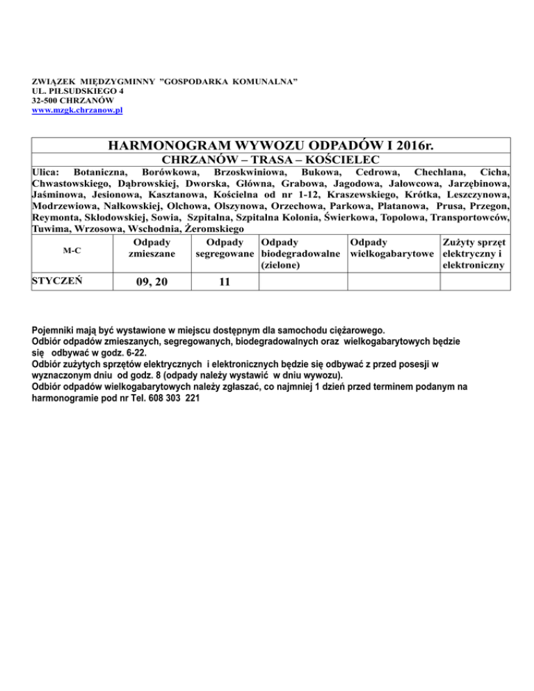 ZWIĄZEK MIĘDZYGMINNY ”GOSPODARKA KOMUNALNA” UL. PIŁSUDSKIEGO 4 32-500 CHRZANÓW www.mzgk.chrzanow.pl HARMONOGRAM WYWOZU ODPADÓW I 2016r. CHRZANÓW – TRASA – KOŚCIELEC Ulica: Botaniczna, Borówkowa, Brzoskwiniowa, Bukowa, Cedrowa, Chechlana, Cicha, Chwastowskiego, Dąbrowskiej, Dworska, Główna, Grabowa, Jagodowa, Jałowcowa, Jarzębinowa, Jaśminowa, Jesionowa, Kasztanowa, Kościelna od nr 1-12, Kraszewskiego, Krótka, Leszczynowa, Modrzewiowa, Nałkowskiej, Olchowa, Olszynowa, Orzechowa, Parkowa, Platanowa, Prusa, Przegon, Reymonta, Skłodowskiej, Sowia, Szpitalna, Szpitalna Kolonia, Świerkowa, Topolowa, Transportowców, Tuwima, Wrzosowa, Wschodnia, Żeromskiego Odpady Odpady Odpady Odpady Zużyty sprzęt M-C zmieszane segregowane biodegradowalne wielkogabarytowe elektryczny i (zielone) elektroniczny STYCZEŃ 09, 20 11 Pojemniki mają być wystawione w miejscu dostępnym dla samochodu ciężarowego. Odbiór odpadów zmieszanych, segregowanych, biodegradowalnych oraz wielkogabarytowych będzie się odbywać w godz. 6-22. Odbiór zużytych sprzętów elektrycznych i elektronicznych będzie się odbywać z przed posesji w wyznaczonym dniu od godz. 8 (odpady należy wystawić w dniu wywozu). Odbiór odpadów wielkogabarytowych należy zgłaszać, co najmniej 1 dzień przed terminem podanym na harmonogramie pod nr Tel. 608 303 221
