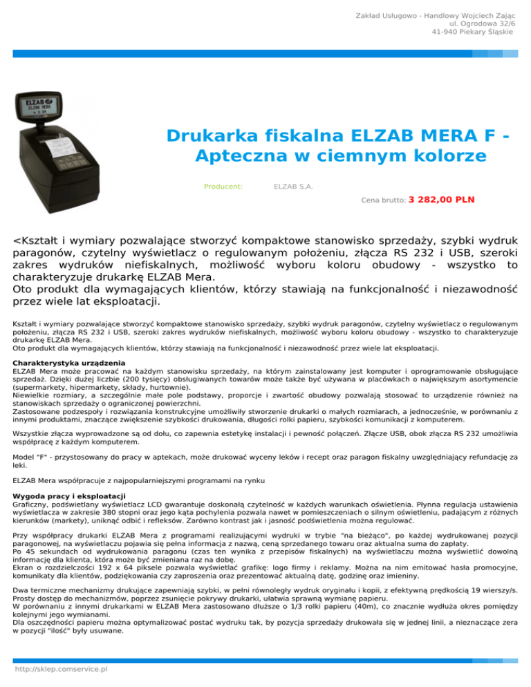 Zakład Usługowo - Handlowy Wojciech Zając ul. Ogrodowa 32/6 41-940 Piekary Śląskie Drukarka fiskalna ELZAB MERA F Apteczna w ciemnym kolorze Producent: ELZAB S.A. Cena brutto: 3 282,00 PLN <Kształt i wymiary pozwalające stworzyć kompaktowe stanowisko sprzedaży, szybki wydruk paragonów, czytelny wyświetlacz o regulowanym położeniu, złącza RS 232 i USB, szeroki zakres wydruków niefiskalnych, możliwość wyboru koloru obudowy - wszystko to charakteryzuje drukarkę ELZAB Mera. Oto produkt dla wymagających klientów, którzy stawiają na funkcjonalność i niezawodność przez wiele lat eksploatacji. Kształt i wymiary pozwalające stworzyć kompaktowe stanowisko sprzedaży, szybki wydruk paragonów, czytelny wyświetlacz o regulowanym położeniu, złącza RS 232 i USB, szeroki zakres wydruków niefiskalnych, możliwość wyboru koloru obudowy - wszystko to charakteryzuje drukarkę ELZAB Mera. Oto produkt dla wymagających klientów, którzy stawiają na funkcjonalność i niezawodność przez wiele lat eksploatacji. Charakterystyka urządzenia ELZAB Mera może pracować na każdym stanowisku sprzedaży, na którym zainstalowany jest komputer i oprogramowanie obsługujące sprzedaż. Dzięki dużej liczbie (200 tysięcy) obsługiwanych towarów może także być używana w placówkach o największym asortymencie (supermarkety, hipermarkety, składy, hurtownie). Niewielkie rozmiary, a szczególnie małe pole podstawy, proporcje i zwartość obudowy pozwalają stosować to urządzenie również na stanowiskach sprzedaży o ograniczonej powierzchni. Zastosowane podzespoły i rozwiązania konstrukcyjne umożliwiły stworzenie drukarki o małych rozmiarach, a jednocześnie, w porównaniu z innymi produktami, znaczące zwiększenie szybkości drukowania, długości rolki papieru, szybkości komunikacji z komputerem. Wszystkie złącza wyprowadzone są od dołu, co zapewnia estetykę instalacji i pewność połączeń. Złącze USB, obok złącza RS 232 umożliwia współpracę z każdym komputerem. Model "F" - przystosowany do pracy w aptekach, może drukować wyceny leków i recept oraz paragon fiskalny uwzględniający refundację za leki. ELZAB Mera współpracuje z najpopularniejszymi programami na rynku Wygoda pracy i eksploatacji Graficzny, podświetlany wyświetlacz LCD gwarantuje doskonałą czytelność w każdych warunkach oświetlenia. Płynna regulacja ustawienia wyświetlacza w zakresie 380 stopni oraz jego kąta pochylenia pozwala nawet w pomieszczeniach o silnym oświetleniu, padającym z różnych kierunków (markety), uniknąć odbić i refleksów. Zarówno kontrast jak i jasność podświetlenia można regulować. Przy współpracy drukarki ELZAB Mera z programami realizującymi wydruki w trybie "na bieżąco", po każdej wydrukowanej pozycji paragonowej, na wyświetlaczu pojawia się pełna informacja z nazwą, ceną sprzedanego towaru oraz aktualna suma do zapłaty. Po 45 sekundach od wydrukowania paragonu (czas ten wynika z przepisów fiskalnych) na wyświetlaczu można wyświetlić dowolną informację dla klienta, która może być zmieniana raz na dobę. Ekran o rozdzielczości 192 x 64 piksele pozwala wyświetlać grafikę: logo firmy i reklamy. Można na nim emitować hasła promocyjne, komunikaty dla klientów, podziękowania czy zaproszenia oraz prezentować aktualną datę, godzinę oraz imieniny. Dwa termiczne mechanizmy drukujące zapewniają szybki, w pełni równoległy wydruk oryginału i kopii, z efektywną prędkością 19 wierszy/s. Prosty dostęp do mechanizmów, poprzez zsunięcie pokrywy drukarki, ułatwia sprawną wymianę papieru. W porównaniu z innymi drukarkami w ELZAB Mera zastosowano dłuższe o 1/3 rolki papieru (40m), co znacznie wydłuża okres pomiędzy kolejnymi jego wymianami. Dla oszczędności papieru można optymalizować postać wydruku tak, by pozycja sprzedaży drukowała się w jednej linii, a nieznaczące zera w pozycji "ilość" były usuwane. http://sklep.comservice.pl Zakład Usługowo - Handlowy Wojciech Zając ul. Ogrodowa 32/6 41-940 Piekary Śląskie Metalowy nóż ułatwia równe odrywanie paragonu. Istotne dla komfortu użytkowania ELZAB Mera drukuje wszystkie wymagane przepisami raporty fiskalne: dobowe, miesięczne oraz okresowe - zainicjowane przez program sprzedaży lub w trybie pracy lokalnej (off-line) po zainicjowaniu z klawiatury drukarki. Drukarka sygnalizuje zbliżanie się daty przeglądu okresowego. W prosty sposób komunikuje sytuacje krytyczne: przejście na pracę na akumulatorze jest sygnalizowane miganiem zielonej diody, brak papieru zapaleniem diody czerwonej. Wbudowane akumulatory gwarantują pracę drukarki przez 2 godziny przy średniej częstotliwości wystawiania jednego paragonu z 3 pozycjami na minutę. Gotowa na euro Drukarka posiada możliwość wydruku linii z informacjami o przyjętych płatnościach (gotówka w złotych lub w innej walucie, płatność kartą, bonem), kursie waluty użytej do zapłaty, jak również informacji o walucie, w której zwrócono resztę. Wydrukiem tych linii steruje program sprzedaży. ELZAB Mera jest przygotowana do operacji przejścia na walutę euro jako podstawowy środek płatniczy w Polsce. Wydruki niefiskalne ELZAB Mera udostępnia bogaty zestaw formatek niefiskalnych, które program obsługujący sprzedaż może wykorzystać do wydruków różnorakich operacji, takich jak: kasowe: potwierdzenie zapłaty kartą płatniczą, stan kasy, raport kasowy bieżący i zmianowy, raport transakcji odłożonych, raport funkcji operatora, raport środków płatności, raport sprzedaży, pokwitowanie wpłaty i wypłaty, raport towarów, cennik, zmiany cen, statystyka sprzedaży, obsługi sprzedaży: przedpłata, zamówienie, pokwitowanie dla klienta, bon upominkowy, kupon rabatowy, płatność za pobraniem, rabat dla pracownika, przelew bankowy, rozliczenia kasjerów: listy kasjerów, raport godzinowy, raport zmianowy, rozliczenie kasjera, waluta w sejfie, na