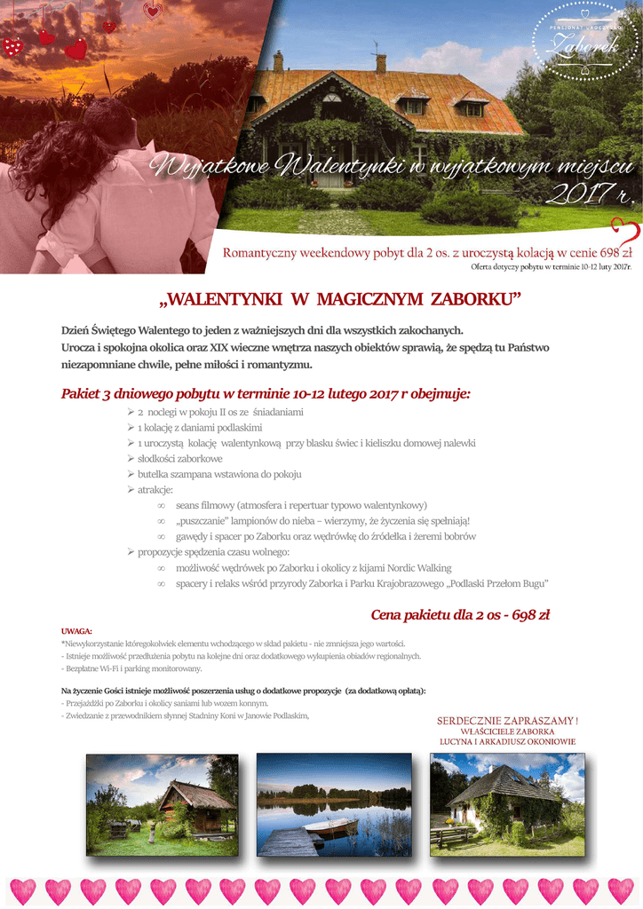 „WALENTYNKI W MAGICZNYM ZABORKU” Dzień Świętego Walentego to jeden z ważniejszych dni dla wszystkich zakochanych. Urocza i spokojna okolica oraz XIX wieczne wnętrza naszych obiektów sprawią, że spędzą tu Państwo niezapomniane chwile, pełne miłości i romantyzmu. Pakiet 3 dniowego pobytu w terminie 10-12 lutego 2017 r obejmuje: 2 noclegi w pokoju II os ze śniadaniami 1 kolację z daniami podlaskimi 1 uroczystą kolację walentynkową przy blasku świec i kieliszku domowej nalewki słodkości zaborkowe butelka szampana wstawiona do pokoju atrakcje: • seans filmowy (atmosfera i repertuar typowo walentynkowy) • „puszczanie” lampionów do nieba – wierzymy, że życzenia się spełniają! • gawędy i spacer po Zaborku oraz wędrówkę do źródełka i żeremi bobrów propozycje spędzenia czasu wolnego: • możliwość wędrówek po Zaborku i okolicy z kijami Nordic Walking • spacery i relaks wśród przyrody Zaborka i Parku Krajobrazowego „Podlaski Przełom Bugu” Cena pakietu dla 2 os - 698 zł UWAGA: *Niewykorzystanie któregokolwiek elementu wchodzącego w skład pakietu - nie zmniejsza jego wartości. - Istnieje możliwość przedłużenia pobytu na kolejne dni oraz dodatkowego wykupienia obiadów regionalnych. - Bezpłatne Wi-Fi i parking monitorowany. Na życzenie Gości istnieje możliwość poszerzenia usług o dodatkowe propozycje (za dodatkową opłatą): - Przejażdżki po Zaborku i okolicy saniami lub wozem konnym. - Zwiedzanie z przewodnikiem słynnej Stadniny Koni w Janowie Podlaskim,