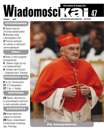 Wiadomości Kai www.kai.pl ekai.pl (973) niedziela 28 listopada 2010 BIULETYN KATOLICKIEJ AGENCJI INFORMACYJNEJ ISSN 1230-8641 47 WYDARZENIA 2 Papież wręczył 24 birety kardynalskie 3 Wywiad-rzeka z Benedyktem XVI 3 Prymas zachęcał do udziału w wyborach samorządowych KRAJ 4 Nowy 3-letni program duszpasterski 5 „Darwin nigdy by się nie nazwał ateistą” 9 „Ostatni taki Prymas” – biografia kard. Glempa ROZMOWY KAI 6 Ze Zb. Derdziukiem 21 Z P. Seewaldem 27 Z bp. J. Kaletą WATYKAN 23 Papież: ekumenizm to poszukiwanie jedności, a nade wszystko pokuta ZAGRANICA 24 Kraje katolickie skąpią na rodzinę! 26 Rosja: prawosławni hierarchowie krytykują abp. Pezziego Po konsystorzu FOT. PAP Editorial Apel do świata Nowy wywiad rzeka z Benedyktem XVI „Światło świata. Papież, Kościół, znaki czasu” jest wielkim wydarzeniem. W rozmowie nie ma tematów tabu. Papież nie unika spraw, tak Krzysztof Tomasik chętnie komentowanych przez media: skandali związanych z molestowaniem nieletnich, ludzkiej seksualności, zaniedbań, błędów i grzechów Kościoła. Ale nie to jest najważniejsze. Istotą książki jest dramatyczny apel Benedykta XVI do Kościoła i świata, by ludzkość – w punkcie zwrotnym swoich dziejów – zatrzymała się nad pytaniami kluczowymi dla jej przyszłości: Co będzie jeśli uśmiercimy Boga? Dokąd zmierza bezbożne społeczeństwo? Czyż nie przećwiczył tego dopiero co na Wschodzie i Zachodzie XX wiek? Jeszcze jako kard. Ratzinger ostrzegał chrześcijan przed utratą tożsamości, orientacji, prawdy, w przypadku, gdy nowe pogaństwo przejmie panowanie nad ludzkim myśleniem i działaniem. Krytykował kołtuństwo chciwego społeczeństwa, które ma wciąż mniej nadziei i boi się wierzyć. Musimy, powiada papież, rozwinąć nową wrażliwość dla zagrożonego Stworzenia i zdecydowanie przeciwstawić się niszczącym siłom. „Jest wiele problemów, które muszą zostać rozwiązane, które jednak nie zostaną rozwiązane, jeżeli nie stoi w centrum Bóg i nie będzie na nowo widoczny w świecie”. Od Kościoła papież oczekuje samooczyszczenia. W jego kryzysie widzi ogromną szansę ponownego odkrycia tego, co prawdziwie katolickie: Boga, powiedzenia człowiekowi prawdy o nim samym i o tajemnicy Stworzenia. Po wielu bezowocnych dyskusjach i zajmowaniu się samym sobą, powinien wreszcie na nowo wskazywać na Ewangelię i Jezusa Chrystusa. 2 Wiadomości KAI 28 listopada 2010 Papież wręczył 24 birety kardynalskie – Kościół każdej epoki zobowiązuje się do podporządkowania się logice służby i Krzyża, świadczenia o niej, aby ukazywało się prawdziwe „panowanie Boga”, panowanie miłości – powiedział papież 20 listopada podczas konsystorza, na którym kreował nowych kardynałów. Jednym z nich został metropolita warszawski, abp Kazimierz Nycz. Uroczysty konsystorz miał formę nabożeństwa Słowa Bożego. Benedykt XVI odczytał formułę kreacji, w której zaznaczył, iż nowi purpuraci będą połączeni ściślejszymi więzami ze Stolicą Piotrową, staną się członkami kleru rzymskiego i powinni być niezłomnymi świadkami Chrystusa. Następnie wymienił ich nazwiska, począwszy od prefekta Kongregacji Spraw Kanonizacyjnych, kard. Angelo Amato. Ten zwrócił się do papieża w imieniu nowych purpuratów. – Potwierdzamy nasze przywiązanie i wierność Kościołowi Chrystusa, którego dziś przyzywamy jako Króla Wszechświata, Osobie Waszej Świątobliwości, zdając sobie sprawę z zaszczytu, iż możemy współpracować w służbie naszym braciom, w ścisłej jedności z Następcą Piotra, z Tobą, Ojcze Święty, który zechciałeś określić siebie jako „pokorny sługa w winnicy Pańskiej” – powiedział. Po czytaniach liturgicznych Ojciec Święty wygłosił homilię. Zaznaczył, że nowi purpuraci zostają włączeni do szczególnego grona najbliższych współpracowników Następcy Piotra, aby „paść Chrystusowe owce, jednoczyć narody z gorliwością miłości Chrystusa”. – Właśnie z tej miłości zrodził się Kościół, powołany by żyć i kroczyć zgodnie z przykazaniem Pana, w którym streszczają się wszystkie prawa i prorocy. Być zjednoczonym z Chrystusem w wierze i komunii oznacza być „wkorzenionym i ugruntowanym w miłości” (Ef 3,17), w tkance, która jednoczy wszystkie członki Ciała Chrystusa – oświadczył papież. Odniósł się do słów Ewangelii przypominających, że Jezus nie przyszedł, aby Mu służono, lecz żeby służyć. Zaznaczył, że Jego styl życia staje się podstawą nowych relacji w obrębie wspólnoty chrześcijańskiej i nowego sposobu sprawowania władzy. – Jego droga ku Jerozolimie jest pokornym dawaniem siebie, aż do ofiarowania życia, jest drogą Męki, drogą Krzyża. Mimo to uczniowie z trudem rozumieją, że trzeba przejść od mentalności światowej do mentalności Bożej. Przykładem są dwaj synowie Zebedeusza, Jakub i Jan, proszący Jezusa, aby dał im pierwsze miejsca, obok Niego w „chwale”. Ukazują w ten sposób oczekiwania i plany wielkości, władzy, zaszczytu według świata. Jezus jednak nie jest zakłopotany tą prośbą i prowadzi ich do zrozumienia, co znaczy pójść za Nim. Wskazuje, że droga tego, kto chce być Jego uczniem oznacza całkowite posłuszeństwo Bogu – mówił Ojciec Święty i dodał: – Człowiek nie powinien kalkulować, lecz po prostu zawierzyć się Bogu, bez roszczeń, podporządkować się Jego woli. – W Kościele nikt nie jest panem – kontynuował papież – lecz wszyscy są powołani, wszyscy są posłani, do wszystkich dociera i wszystkimi kieruje Boża łaska. Ona jest też naszym bezpieczeństwem! Jedynie słuchając na nowo słowa Jezusa, który prosi „pójdź za mną”, można rozmieć swoją obecność i własną misję w Kościele jako autentycznych uczniów – stwierdził Benedykt XVI. Zwracając się do nowych kardynałów podkreślił, że misja do której wz