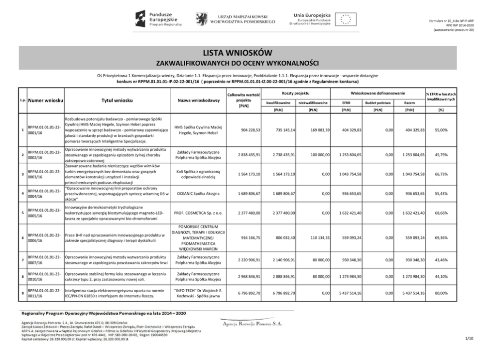 formularz nr 20_4 do IW IP-ARP RPO WP 2014-2020 (zastosowanie: proces nr 20) LISTA WNIOSKÓW ZAKWALIFIKOWANYCH DO OCENY WYKONALNOŚCI Oś Priorytetowa 1 Komercjalizacja wiedzy, Działanie 1.1. Ekspansja przez innowacje, Poddziałanie 1.1.1. Ekspansja przez innowacje - wsparcie dotacyjne konkurs nr RPPM.01.01.01-IP.02-22-001/16 ( poprzednio nr RPPM.01.01.01-IZ.00-22-001/16 zgodnie z Regulaminem konkursu) L.p. Numer wniosku RPPM.01.01.01-221 0001/16 Całkowita wartość projektu [PLN] Koszty projektu Wnioskowane dofinansowanie % EFRR w kosztach kwalifikowalnych Tytuł wniosku Nazwa wnioskodawcy Rozbudowa potencjału badawczo - pomiarowego Spółki Cywilnej HMS Maciej Hegele, Szymon Hebel poprzez wyposażenie w sprzęt badawczo - pomiarowy zapewniający jakość i standardy produkcji w branżach gospodarki pomorza tworzących Inteligentne Specjalizacje. HMS Spółka Cywilna Maciej Hegele, Szymon Hebel 904 228,53 735 145,14 169 083,39 404 329,83 0,00 404 329,83 55,00% Zakłady Farmaceutyczne Polpharma Spółka Akcyjna 2 838 435,91 2 738 435,91 100 000,00 1 253 804,65 0,00 1 253 804,65 45,79% Koli Spółka z ograniczoną odpowiedzialnością 1 564 173,10 1 564 173,10 0,00 1 043 754,58 0,00 1 043 754,58 66,73% OCEANIC Spółka Akcyjna 1 689 806,67 1 689 806,67 0,00 936 653,65 0,00 936 653,65 55,43% PROF. COSMETICA Sp. z o.o. 2 377 480,00 2 377 480,00 0,00 1 632 421,40 0,00 1 632 421,40 68,66% 916 166,75 806 032,40 110 134,35 559 093,24 0,00 559 093,24 69,36% Zakłady Farmaceutyczne Polpharma Spółka Akcyjna 2 220 906,91 2 140 906,91 80 000,00 930 348,30 0,00 930 348,30 43,46% Opracowanie innowacyjnej metody wytwarzania produktu stosowanego w zapobieganiu epizodom żylnej choroby zakrzepowo-zatorowej Zaawansowane badania nieniszczące węzłów wirników turbin energetycznych bez demontażu oraz gorących elementów konstrukcji urządzeń i instalacji petrochemicznych podczas eksploatacji "Opracowanie innowacyjnej linii preparatów ochrony przeciwsłonecznej, wspomagających syntezę witaminę D3 w skórze" 2 RPPM.01.01.01-220002/16 3 RPPM.01.01.01-220003/16 4 RPPM.01.01.01-220004/16 5 RPPM.01.01.01-220005/16 Innowacyjne dermokosmetyki trychologiczne wykorzystujące synergię biostymulującego magneto-LEDlasera ze specjalnie opracowanymi bio-chromoforami RPPM.01.01.01-226 0006/16 Prace B+R nad opracowaniem innowacyjnego produktu w zakresie specjalistycznej diagnozy i terapii dyskalkulii POMORSKIE CENTRUM DIAGNOZY, TERAPII I EDUKACJI MATEMATYCZNEJ PROMATHEMATICA WIĘCKOWSKI MARCIN kwalifikowalne [PLN] niekwalifikowalne [PLN] EFRR [PLN] Budżet państwa [PLN] Razem [PLN] [%] 7 RPPM.01.01.01-220007/16 Opracowanie innowacyjnej metody wytwarzania produktu stosowanego w zapobieganiu powstawania zakrzepów krwi 8 RPPM.01.01.01-220010/16 Opracowanie stabilnej formy leku stosowanego w leczeniu cukrzycy typu 2, przy zastosowaniu nowej soli. Zakłady Farmaceutyczne Polpharma Spółka Akcyjna 2 968 846,91 2 888 846,91 80 000,00 1 273 984,30 0,00 1 273 984,30 44,10% 9 RPPM.01.01.01-220011/16 Inteligentna stacja elektroenergetyczna oparta na normie IEC/PN-EN 61850 z interfejsem do Internetu Rzeczy. ''INFO TECH'' Dr Wojciech E. Kozłowski - Spółka jawna 6 796 892,70 6 796 892,70 0,00 5 437 514,16 0,00 5 437 514,16 80,00% 1/10 formularz nr 20_4 do IW IP-ARP RPO WP 2014-2020 (zastosowanie: proces nr 20) L.p. Numer wniosku RPPM.01.01.01-2210 0012/16 11 RPPM.01.01.01-220013/16 12 RPPM.01.01.01-220014/16 13 RPPM.01.01.01-220015/16 RPPM.01.01.01-2214 0016/16 RPPM.01.01.01-2215 0017/16 Tytuł wniosku Small Smart City - Inteligentna Gmina Opracowanie innowacyjnego sprzętu ecoCardio z technologią odzyskiwania energii elektrycznej Laboratorium innowacyjnych technologii obuwniczych Gino Rossi zlokalizowane w Słupsku, w województwie pomorskim. Rozwój przedsiębiorstwa PLATAN poprzez opracowanie nowego produktu - Adaptacyjnego Systemu Rozgłoszeniowego Rozwój pomorskiej specjalizacji offshore dzięki opracowaniu ElRoute - innowacyjnej technologii projektowania i zarządzania przebiegami kablowymi na specjalistycznych jednostkach pływających. Badania przemysłowe i prace rozwojowe nad innowacyjnym narzędziem do mierzenia poziomu kompetencji miękkich kandydatów do pracy, wykorzystującym technologie chmury obliczeniowej oraz mikroekspresję twarzy, realizowane w Województwie Pomorskim. Opracowanie modelu zasad i procedur w zakresie wykorzystania systemu obrazowania elektronicznych map i informacji nawigacyjnych ECDIS na bazie symulatorów JRC JAN-901B. Nazwa wnioskodawcy Całkowita wartość projektu [PLN] Koszty projektu kwalifikowalne [PLN] 1 555 444,80 1 555 444,80 1 082 091,71 GINO ROSSI Spółka Akcyjna niekwalifikowalne [PLN] EFRR Wnioskowane dofinansowanie [PLN] 0,00 1 187 585,10 945 524,60 136 567,11 4 142 405,00 3 964 500,00 PLATAN Spółka z ograniczoną odpowiedzialnością Spółka komandytowa 4 843 942,02 ELESHIP ELECTRICAL DESIGN AND ENGINEERING Sp. z o.o. Budżet państwa [PLN] Razem [PLN] % EFRR w kosztach kwalifikowalnych [%] 0,00 1 187 585,10 76,35% 688 824,72 0,00 688 824,72 72,85% 177 905,00 1 569 075,00 0,00 1 569 075,00 39,58% 4 262 882,02 581 060,00 2 308 091,37 0,00 2 308 091,37 54,14% 5 087 728,97 4 619 334,59 468 394,38 3 018 164,05 0,00 3 018 164,05 65,34% Breakbox Umbrella sp. z o.o. 369 254,36 346 882,66 22 371,70 261 203,35 0,00 261 203,35 75,30% Exerters Wojciech Legieć 188 058,80 188 058,80 0,00 130 101,10 0,00 130 101,10 69,18% Agrosystems Sp. z o.o. MANSOLUTIONS SPÓŁKA Z OGRANICZONĄ ODPOWIEDZIALNOŚCIĄ 16 RPPM.01.01.01-220018/16 17 RPPM.01.01.01-220020/16 OPRACOWANIE INNOWACYJNEGO, WIELOFUNKCYJNEGO PANELU DO STEROWANIA AUTOMATYKĄ BUDYNKOWĄ (INTELIGENTNYMI BUDYNKAMI) W STANDARDZIE KNX KEFREN TECHNOLOGY Spółka z ograniczoną odpowiedzialnością 1 534 855,00 1 534 855,00 0,00 1 101 979,00 0,00 1 101 979,00 71,80% 18 RPPM.01.01.01-220022/16 „Innowacyjna metoda diagnostyczna choroby Alzheimera źródłem rozwoju firmy Labertis Scientific” Labertis Scientific Aleksand