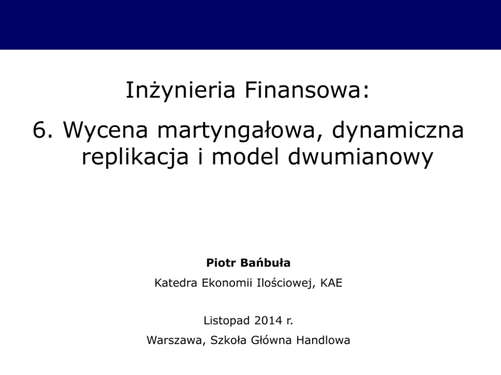 Inżynieria Finansowa: 6. Wycena martyngałowa, dynamiczna replikacja i model dwumianowy Piotr Bańbuła Katedra Ekonomii Ilościowej, KAE Listopad 2014 r. Warszawa, Szkoła Główna Handlowa Wycena pochodnych: ułatwiona Stworzenie statycznego portfela replikującego służącego do określenia ceny pewnego instrumentu wymaga: Istnienia odpowiedniej ilości płynnych aktywów bazowych Liniowej zależności pomiędzy ceną instrumentu replikowanego i aktywów użytych do replikacji Jeśli cena instrumentu pochodnego zmienia się liniowo wraz ze zmianą ceny aktywu bazowego możliwa jest statyczna replikacja, gdyż wartość portfela replikującego zmienia się proporcjonalnie do zmian cen bazowego Wycena pochodnych: utrudniona Kiedy: Istnieje odpowiednia ilość płynnych aktywów bazowych, ale Zależności pomiędzy ceną instrumentu replikowanego i aktywów bazowych (używanych do replikacji) jest nieliniowa – zmiany cen obydwu nie są stabilnie proporcjonalne Konieczna jest dynamiczna replikacja. Przykład: zabezpieczenie pozycji opcyjnej Wystawiliśmy opcję kupna 100 akcji o terminie zapadalności 1Y, K=105, przy cenie bieżącej S0=100. Stopa procentowa wynosi 5%. Chcemy zabezpieczyć ryzyko, jakie generuje pozycja opcyjna (koszt tego zabezpieczenia powie nam jednocześnie ile opcja powinna kosztować). Rozważmy trzy strategie zabezpieczenia: 1. Kupujemy 100 akcji już dziś za pożyczone pieniądze 2. Brak zakupu jakichkolwiek akcji 3. Kupujemy 50 akcji już dziś za pożyczone pieniądze (np. szacujemy, że istnieje 50% szans na wykonanie kontraktu) Przy trzech scenariuszach zmiany cen: 1. Cena wzrośnie do 120 2. Cena pozostanie bez zmian 3. Cena spadnie do 80 Przykład: zabezpieczenie pozycji opcyjnej Wyniki z poszczególnych strategii są następujące: 1. 𝜋 𝑇 = − 𝐦𝐚𝐱 𝑺𝑻 − 𝑲, 𝟎 + 𝑺𝑻 − 𝑲 − 𝒆𝒓𝝉 𝑺𝒕𝟎 100 2. 𝜋 𝑇 = − 𝒎𝒂𝒙 𝑺𝑻 − 𝑲, 𝟎 100 3. 𝜋 𝑇 = − 𝒎𝒂𝒙 𝑺𝑻 − 𝑲, 𝟎 100 + 𝑺𝑻 − 𝑲 − 𝒆𝒓𝝉 𝑺𝒕𝟎 50 100% 0% 50% 𝐒𝐓 =120 0 -15 -7,5 𝐒𝐓 =100 -5 0 -2,5 𝐒𝐓 =80 -25 0 -12,5 Wniosek: żadna ze strategii nas nie zabezpieczyła (zabezpieczenie oznaczałoby, że niezależnie od scenariusza nasz wynik pozostaje taki sam i wynosi 0) Dynamiczna replikacja Portfel replikujący: Dokładnie odzwierciedla końcowe wypłaty z wycenianego instrumentu Nie wymaga wypłat ani wpłat pieniędzy Zwykle ma zmienną strukturę na przestrzeni czasu Ta metoda wymaga określenia charakteru współzależności pomiędzy cenami instrumentu wycenianego (replikowanego) i aktywu bazowego Model (drzewo) dwumianowe Równania różniczkowe cząstkowe Stochastyczne równania różniczkowe Jednookresowy model dwumianowy - założenia Rozpatrujemy tylko dwa punkty w czasie: t0 (w skrócie 0) oraz T Dwa aktywa na rynku: pozbawiona ryzyka obligacja zerokuponowa B(0,T), która jest także utożsamiana z rachunkiem bankowym i daje deterministyczny dochód B 0, 𝑇 = 𝐷𝐹 0, 𝑇 = 1/(1 + 𝐿𝑟) = 𝑒 −𝑟𝜏 gdzie 𝜏 = ∆(0, 𝑇) Aktywo obarczone ryzykiem, którego wartość (cena) w chwili obecnej jest znana: 𝑆0 nie przynosi dochodu w okresie [0,T] i ma losową wartość (cenę) w T: 𝑆𝑇 = gdzie 0 < D < U 𝑆0 𝑈 z prawdopodobieństwem "𝑝" 𝑆0 D z prawdopodobieństwem "1 − 𝑝" Jednookresowy model dwumianowy - schemat 𝑆𝑇,𝑈 = 𝑆𝑡0 𝑈 𝑝 𝑆𝑡0 1−𝑝 t0 𝑆𝑇,𝐷 = 𝑆𝑡0 𝐷 T Jednookresowy model dwumianowy - założenia Wartość ryzykownego aktywu w momencie T możemy także zapisać jako: 𝑆𝑇 = 𝑆0 𝑍 gdzie Z jest zmienną losową: 𝑍= 𝑈 D z prawdopodobieństwem "𝑝" z prawdopodobieństwem "1 − 𝑝" Wartość europejskiego instrument pochodnego X wystawionego na aktywo S w terminie zapadalności jest zmienną losową opisanego pewną funkcją 𝜑: 𝑋𝑇 = 𝜑(𝑆𝑇 ) Np. dla opcji kupna ta funkcja ma postać: 𝑋𝑇 = 𝜑(𝑆𝑇 ) = max 𝑆𝑇 − 𝐾, 0 = max 𝑆0 𝑍 − 𝐾, 0 Model dwumianowy - przykład 35.1 ∙ 𝑈 = 35.1 ∙ 1.17 = 41 0.7 35.1 0.3 35.1 ∙ 𝐷 = 35.1 ∙ 0.85 = 30 Bieżąca cena obligacji wolnej od ryzyka: 𝐵 0, 𝑇 = 0.965 Cena obligacji w terminie zapadalności (pewna): 𝐵 𝑇 = 1 𝐵 0, 𝑇 = 1/(1 + 𝑟) zatem stopa wolna od ryzyka: 𝑟 = 3.6% Jak jest oczekiwana stopa zwrotu z ryzykownego aktywu? Przykład – c.d. 0.7 𝑆𝑇 = 35.1 ∙ 𝑈 = 35.1 ∙ 1.17 = 41 𝐵(𝑇) = 1 𝑆0 = 35.1 𝐵(0, 𝑇) = 0.965 0.3 𝑆𝑇 = 35.1 ∙ 𝐷 = 35.1 ∙ 0.85 = 30 𝐵(𝑇) = 1 𝐸 𝑃 𝑆𝑇 = 0.7 ∙ 41 + 0.3 ∙ 30 = 37.7 stąd: 𝑝 = 35.1 < 𝑒 −0.042 37.7 ≈ 36.4 Cena 𝑆0 jest niższa niż bieżąca wartość oczekiwana wypłat 𝑒 −𝑟 𝐸 𝑃 𝑆𝑇 : Jaka jest oczekiwana stopa zwrotu z akcji? 𝐸𝑃 𝑅𝑆 𝑆0 𝑈 𝑆0 𝐷 41 30 =𝑝 + 1−𝑝 = 0.7 + 0.3 = 0.7 ∙ 1.17 + 0.3 ∙ 0.85 = 1.074 𝑆0 𝑆0 35.1 35.1 𝑅𝑆 = 1 + 𝑟 →= 7.4% Przykład – c.d. 0.7 𝑆𝑇 = 35.1 ∙ 𝑈 = 35.1 ∙ 1.17 = 41 𝐵(𝑇) = 1 𝑆0 = 35.1 𝐵(0, 𝑇) = 0.965 0.3 𝑆𝑇 = 35.1 ∙ 𝐷 = 35.1 ∙ 0.85 = 30 𝐵(𝑇) = 1 𝐸 𝑃 𝑆𝑇 = 0.7 ∙ 41 + 0.3 ∙ 30 = 37.7 stąd: 𝑝 = 35.1 < 𝑒 −0.042 37.7 ≈ 36.4 Cena 𝑆0 jest niższa niż bieżąca wartość oczekiwana wypłat 𝑒 −𝑟 𝐸 𝑃 𝑆𝑇 : Jaka jest oczekiwana stopa zwrotu z akcji? 𝐸𝑃 𝑅𝑆 𝑆0 𝑈 𝑆0 𝐷 41 30 =𝑝 + 1−𝑝 = 0.7 + 0.3 = 0.7 ∙ 1.17 + 0.3 ∙ 0.85 = 1.074 𝑆0 𝑆0 35.1 35.1 𝑅𝑆 = 1 + 𝑟 →= 7.4% WZÓR wyceny aktywów Cena 𝑝𝑖 = 𝐸(𝑚𝑥𝑖 ) Oczekiwania (prawdopodobieństwo) Czynnik dyskontujący Wypłaty To podstawowy wzór klasycznej wyceny aktywów Co jest ważne? Wypłaty x Mechanizmy oczekiwań E Czynnik dyskontujący m (zależny od preferencji stochastic discount factor, zwany zależnie od okoliczności także state-price density, pricing 