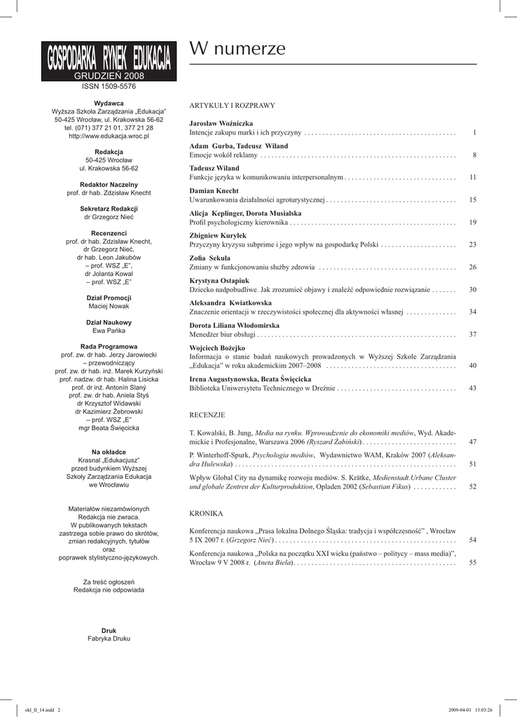 W numerze GRUDZIEŃ 2008 ISSN 1509-5576 Wydawca Wyższa Szkoła Zarządzania „Edukacja” 50-425 Wrocław, ul. Krakowska 56-62 tel. (071) 377 21 01, 377 21 28 http://www.edukacja.wroc.pl ARTYKUŁY I ROZPRAWY Jarosław Woźniczka Intencje zakupu marki i ich przyczyny . . . . . . . . . . . . . . . . . . . . . . . . . . . . . . . . . . . . . . . . . . 1 Adam Gurba, Tadeusz Wiland Emocje wokół reklamy . . . . . . . . . . . . . . . . . . . . . . . . . . . . . . . . . . . . . . . . . . . . . . . . . . . . . . 8 Tadeusz Wiland Funkcje języka w komunikowaniu interpersonalnym . . . . . . . . . . . . . . . . . . . . . . . . . . . . . . . 11 Damian Knecht Uwarunkowania działalności agroturystycznej . . . . . . . . . . . . . . . . . . . . . . . . . . . . . . . . . . . . 15 Alicja Keplinger, Dorota Musialska Profil psychologiczny kierownika . . . . . . . . . . . . . . . . . . . . . . . . . . . . . . . . . . . . . . . . . . . . . . 19 Zbigniew Kuryłek Przyczyny kryzysu subprime i jego wpływ na gospodarkę Polski . . . . . . . . . . . . . . . . . . . . . 23 Zofia Sekuła Zmiany w funkcjonowaniu służby zdrowia . . . . . . . . . . . . . . . . . . . . . . . . . . . . . . . . . . . . . . 26 Krystyna Ostapiuk Dziecko nadpobudliwe. Jak zrozumieć objawy i znaleźć odpowiednie rozwiązanie . . . . . . . 30 Aleksandra Kwiatkowska Znaczenie orientacji w rzeczywistości społecznej dla aktywności własnej . . . . . . . . . . . . . . 34 Dział Naukowy Ewa Pańka Dorota Liliana Włodomirska Menedżer biur obsługi . . . . . . . . . . . . . . . . . . . . . . . . . . . . . . . . . . . . . . . . . . . . . . . . . . . . . . . 37 Rada Programowa prof. zw. dr hab. Jerzy Jarowiecki – przewodniczący prof. zw. dr hab. inż. Marek Kurzyński prof. nadzw. dr hab. Halina Lisicka prof. dr inż. Antonín Slaný prof. zw. dr hab. Aniela Styś dr Krzysztof Widawski dr Kazimierz Żebrowski – prof. WSZ „E” mgr Beata Święcicka Wojciech Bożejko Informacja o stanie badań naukowych prowadzonych w Wyższej Szkole Zarządzania „Edukacja” w roku akademickim 2007–2008 . . . . . . . . . . . . . . . . . . . . . . . . . . . . . . . . . . . . 40 Irena Augustynowska, Beata Święcicka Biblioteka Uniwersytetu Technicznego w Dreźnie . . . . . . . . . . . . . . . . . . . . . . . . . . . . . . . . . 43 Redakcja 50-425 Wrocław ul. Krakowska 56-62 Redaktor Naczelny prof. dr hab. Zdzisław Knecht Sekretarz Redakcji dr Grzegorz Nieć Recenzenci prof. dr hab. Zdzisław Knecht, dr Grzegorz Nieć, dr hab. Leon Jakubów – prof. WSZ „E”, dr Jolanta Kowal – prof. WSZ „E” Dział Promocji Maciej Nowak Na okładce Krasnal „Edukacjusz” przed budynkiem Wyższej Szkoły Zarządzania Edukacja we Wrocławiu Materiałów niezamówionych Redakcja nie zwraca. W publikowanych tekstach zastrzega sobie prawo do skrótów, zmian redakcyjnych, tytułów oraz poprawek stylistyczno-językowych. RECENZJE T. Kowalski, B. Jung, Media na rynku. Wprowadzenie do ekonomiki mediów, Wyd. Akademickie i Profesjonalne, Warszawa 2006 (Ryszard Żabiński) . . . . . . . . . . . . . . . . . . . . . . . . . . 47 P. Winterhoff-Spurk, Psychologia mediów, Wydawnictwo WAM, Kraków 2007 (Aleksandra Hulewska) . . . . . . . . . . . . . . . . . . . . . . . . . . . . . . . . . . . . . . . . . . . . . . . . . . . . . . . . . . . . . 51 Wpływ Global City na dynamikę rozwoju mediów. S. Krätke, Medienstadt.Urbane Cluster und globale Zentren der Kulturproduktion, Opladen 2002 (Sebastian Fikus) . . . . . . . . . . . . 52 KRONIKA Konferencja naukowa „Prasa lokalna Dolnego Śląska: tradycja i współczesność” , Wrocław 5 IX 2007 r. (Grzegorz Nieć) . . . . . . . . . . . . . . . . . . . . . . . . . . . . . . . . . . . . . . . . . . . . . . . . . . 54 Konferencja naukowa „Polska na początku XXI wieku (państwo – politycy – mass media)”, Wrocław 9 V 2008 r. (Aneta Biela). . . . . . . . . . . . . . . . . . . . . . . . . . . . . . . . . . . . . . . . . . . . . 55 Za treść ogłoszeń Redakcja nie odpowiada Druk Fabryka Druku okl_II_14.indd 2 2009-04-01 13:03:26 Od Redakcji Kolejny numer czasopisma jest plonem i egzemplifikacją ostatniego okresu działalności pracowników i współpracowników Wyższej Szkoły Zarządzania „Edukacja”. Nadal jednak periodyk jest otwartym forum dla wszystkich pracowników nauki, zainteresowanych opublikowaniem swojego dorobku naukowego i awansowego. W niniejszym czternastym numerze znajdują się artykuły osób mocno zaawansowanych w gromadzeniu dorobku niezbędnego w procesie ubiegania się o kolejne awanse: dr Jarosław Woźniczka (habilitacja); dr Adam Gurba (habilitacja); dr hab. Damian Knecht (tytuł); dr Alicja Keplinger (habilitacja); mgr Zbigniew Kuryłek (doktorat); dr Zofia Sekuła (habilitacja); dr Wojciech Bożejko (habilitacja); mgr Aleksandra Kwiatkowska (doktorat). Nie rezygnujemy jednak z publikowania prac popularnonaukowych, doniesień, recenzji i kronik. Autorzy pochodzą – jak zwykle – z wielu ośrodków akademickich. Oczywiście oczekujemy na artykuły doktorantów, którzy od blisko 10 lat zawsze goszczą na naszych łamach. Pochodzą z wielu uczelni, a w dorobkach prezentowanych na publicznych obronach prac doktorskich i kolokwiach habilitacyjnych coraz liczniej pojawiają się artykuły z naszego czasopisma. Zapewne zgodzą się Państwo z opinią, że mamy skromny wkład w dzieło wspierania rozwoju młodych kadr naukowych, a idea ta leżała u podstaw powołania naszego czasopisma. Stale staramy się podnosić jego poziom. Temu celowi służy m.in. piecza nad formalną i merytoryczną stroną pisma sprawowana od roku przez Katedrę Dziennikarstwa naszej uczelni. okl_II_14.indd 3 2009-04-01 13:03:35