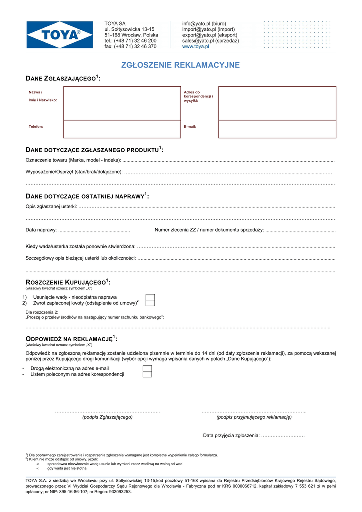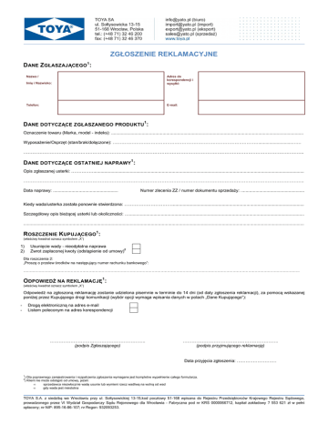 ZGŁOSZENIE REKLAMACYJNE DANE ZGŁASZAJĄCEGO1 : Nazwa / Imię i Nazwisko: Adres do korespondencji i wysyłki: Telefon: E-mail: DANE DOTYCZĄCE ZGŁASZANEGO PRODUKTU 1: Oznaczenie towaru (Marka, model - indeks): ............................................................................................................................................................. Wyposażenie/Osprzęt (stan/brak/dołączone): ………………………………………………………………………………………............................…… ……………………………………………………………………………………………………………………………………………………………………….. DANE DOTYCZĄCE OSTATNIEJ NAPRAWY 1: Opis zgłaszanej usterki: ……………............................................................................................................................................................................ ……………………………………………………………………………………………………………………………………………………………………….. Data naprawy: ..................................................... Numer zlecenia ZZ / numer dokumentu sprzedaży: .................................................... Kiedy wada/usterka została ponownie stwierdzona: ……………………………........................................................................................................... Szczegółowy opis bieżącej usterki lub okoliczności: …............................................................................................................................................... ..................................................................................................................................................................................................................................... ROSZCZENIE KUPUJĄCEGO1: (właściwy kwadrat oznacz symbolem „X”) 1) 2) Usunięcie wady - nieodpłatna naprawa Zwrot zapłaconej kwoty (odstąpienie od umowy)2 Dla roszczenia 2: „Proszę o przelew środków na następujący numer rachunku bankowego”: ……………………….……………………………………………………………………………………………………………………………………………………………………. ODPOWIEDŹ NA REKLAMACJĘ1: (właściwy kwadrat oznacz symbolem „X”) Odpowiedź na zgłoszoną reklamację zostanie udzielona pisemnie w terminie do 14 dni (od daty zgłoszenia reklamacji), za pomocą wskazanej poniżej przez Kupującego drogi komunikacji (wybór opcji wymaga wpisania danych w polach „Dane Kupującego”): - Drogą elektroniczną na adres e-mail Listem poleconym na adres korespondencji ……………………………………………………….. (podpis Zgłaszającego) ……………………………………………………….. (podpis przyjmującego reklamację) Data przyjęcia zgłoszenia: ……………………… 1 ) Dla poprawnego zarejestrowania i rozpatrzenia zgłoszenia wymagane jest kompletne wypełnienie całego formularza. ) Klient nie może odstąpić od umowy, jeżeli: • sprzedawca niezwłocznie wadę usunie lub wymieni rzecz wadliwą na wolną od wad • gdy wada jest nieistotna 2 TOYA S.A. z siedzibą we Wrocławiu przy ul. Sołtysowickiej 13-15,kod pocztowy 51-168 wpisana do Rejestru Przedsiębiorców Krajowego Rejestru Sądowego, prowadzonego przez VI Wydział Gospodarczy Sądu Rejonowego dla Wrocławia - Fabryczna pod nr KRS 0000066712, kapitał zakładowy 7 553 621 zł w pełni opłacony; nr NIP: 895-16-86-107; nr Regon: 932093253.