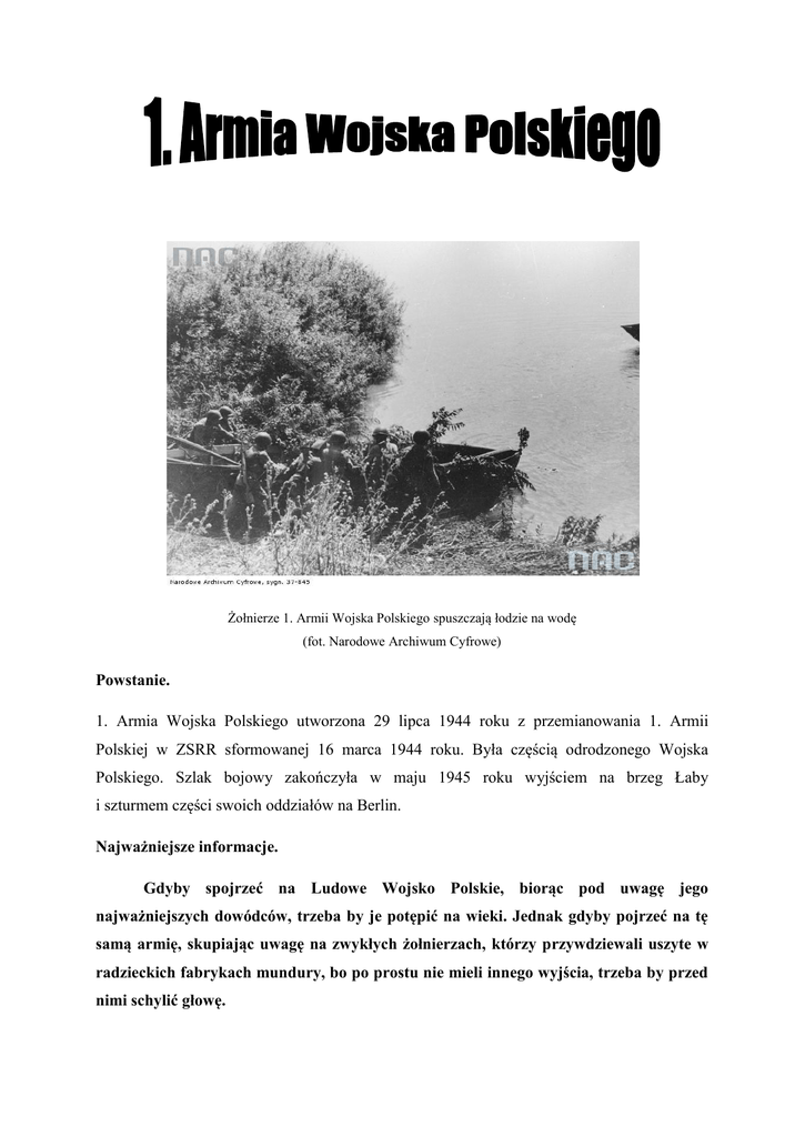 Żołnierze 1. Armii Wojska Polskiego spuszczają łodzie na wodę (fot. Narodowe Archiwum Cyfrowe) Powstanie. 1. Armia Wojska Polskiego utworzona 29 lipca 1944 roku z przemianowania 1. Armii Polskiej w ZSRR sformowanej 16 marca 1944 roku. Była częścią odrodzonego Wojska Polskiego. Szlak bojowy zakończyła w maju 1945 roku wyjściem na brzeg Łaby i szturmem części swoich oddziałów na Berlin. Najważniejsze informacje. Gdyby spojrzeć na Ludowe Wojsko Polskie, biorąc pod uwagę jego najważniejszych dowódców, trzeba by je potępić na wieki. Jednak gdyby pojrzeć na tę samą armię, skupiając uwagę na zwykłych żołnierzach, którzy przywdziewali uszyte w radzieckich fabrykach mundury, bo po prostu nie mieli innego wyjścia, trzeba by przed nimi schylić głowę. Zygmunt Berling chciał przejść do historii jako wielki dowódca, który przy boku Armii Czerwonej odnowił polskie wojsko – stworzy kilka armii, które na równi z radzieckimi wyzwolą polskie ziemie i dotrą aż do Berlina. A to ciekawe. Generał dywizji Zygmunt Berling (1896-1980); 1915-1917 żołnierz w Legionach Polskich, od 1918 w Wojsku Polskim, 1939-1941 w niewoli sowieckiej, tam wstępuje do Armii Polskiej w ZSRR, 1943 objęcie dowództwa w 1. Dywizji Piechoty im. Tadeusza Kościuszki, 1944 objęcie dowództwa w 1. Armii Wojska Polskiego; odwołany za próbę udzielenia pomocy powstaniu warszawskiemu, 1948-1953 komendant Akademii Sztabu Generalnego. Marzenia Zygmunta Berlinga rozwiały się jednak pod Warszawą w 1944 roku i największym osiągnięciem generała pozostała 1. Armia Polska w ZSRR. Armia Polska w ZSRR w pierwszych miesiącach swego istnienia była armią tylko z nazwy. Liczebnie nadal pozostała korpusem, z którego się wywodziła (chodzi o 1. Korpus Polskich Sił Zbrojnych). W 1943 roku do 1. Dywizji Piechoty im. Tadeusza Kościuszki ludzie zgłaszali się tysiącami. Po trzech tygodniach liczyła już ponad 6 tysięcy żołnierzy, a stan etatowy osiągnęła po koniec czerwca. Sformowane oddziały liczyły ponad 16,5 tysiąca żołnierzy, miała 9 tysięcy karabinów, 2,5 tysiąca pistoletów maszynowych, 800 karabinów maszynowych, 400 rusznic przeciwpancernych, 200 moździerzy, 100 dział, 40 czołgów i 8 dział przeciwpancernych. Stały napływ żołnierzy spowodował starania Zygmunta Berlina o przekształcenie dywizji w korpus a następnie w 1. Armię. Udało się to 29 lipca 1944 roku, wtedy też liczyła 107 tysięcy żołnierzy i obejmowała m.in. 6 dywizji piechoty, 1 brygadę kawalerii, 5 brygad artylerii, 1 dywizję artylerii przeciwlotniczej, 1 brygadę pancerną, 2 pułki lotnicze i będący w trakcie formowania korpus pancerny. Armia najpierw wyruszyła pod Lenino12 października 1943 roku, gdzie Zygmunt Berling stracił kilkaset żołnierzy, a potem, po uzupełnieniu składu, przekroczyła na początku stycznia 1944 roku przedwojenną granicę polsko-rosyjską. A to ciekawe. Pod Lenino swoją pierwszą bitwę z Niemcami stoczyli żołnierze gen. Zygmunta Berlinga. Sformowani pod egidą komunistów z ZSRR. Ten krwawy chrzest bojowy stał się wielkim symbolem polsko-radzieckiego sojuszu. Ale rezultat walk wcale nie był dobry, tyle że komunistyczna propaganda wszystko potrafiła przedstawić jako wielki sukces. Wkroczyła na teren, gdzie mimo półtora roku okupacji sowieckiej oraz dwóch i pół roku niemieckiej nadal mieszkali Polacy i działały siły ruchu oporu. Na tych terenach nastąpiła rekrutacja do 2. Armii. Często przymusowa – szeregowi żołnierze Armii Krajowej nie mieli wyboru – czekała ich śmierć lub służba w nowym wojsku. W sierpniu PKWN wydał dekret o mobilizacji. Do żołnierzy 1. Armii mieli dołączyć żołnierze 2. i 3. Armii. W marzeniach naczelnych dowódców miał powstać polski front, który na równi z oddziałami 1. Frontu Białoruskiego i 1. Frontu Ukraińskiego miał uczestniczyć w zdobywaniu Berlina. Armia Krajowa natychmiast wydała orędzie do narodu, w którym zabraniała wstępowanie do nowego wojska. Ludzie sami nie chcieli wstępować do wojska, które jedynie powiększało zapasy polskiego mięsa armatniego dowodzonego przez komunistów, jak polską armię przedstawiali w swej propagandzie Niemcy. Jak mówił popularny wówczas wiersz: Czekamy ciebie czerwona zarazo, byś nas od czarnej wybawiła śmierci, czekamy ciebie z lękiem i odrazą. Działania bojowe. We wrześniu 1944 r., po zajęciu prawobrzeżnej części Warszawy (Pragi) przez wojska radzieckie i polskie, jednostki 1. Armii toczyły ciężkie i okupione ogromnymi stratami walki o uchwycenie i utrzymanie przyczółków na lewym brzegu Wisły. Celem walk było wsparcie toczącego się jeszcze Powstania Warszawskiego. Piekło nastąpiło dopiero ze świtem – wspominał po wojnie pierwszy desant na Czerniaków jeden z żołnierzy. Zygmunt Berling, nie czekając na pomoc Sowietów wykonał desant samodzielnie 16 września 1944 roku, nie miał jednak doświadczenia w organizowaniu takich przepraw. Przedostało się ponad tysiąc żołnierzy, na których bardzo naciskali Niemcy i berlingowcy ponosili coraz większe straty. Z każdym dniem sytuacja żołnierzy była coraz gorsza. 23 września nakazano przerwanie desantu i ewakuację. Defilada 1. Armii Wojska Polskiego na ulicy Marszałkowskiej w wyzwolonej Warszawie 19 stycznia 1945. Berling, ambitny, chociaż nie najlepiej radzący sobie w walce oficer, przegrał swoją partię związaną z polskim wojskiem, które miało powstać u boku ZSRR. Po nie udanym desancie został zdjęty ze stanowiska dowódcy armii. Jego miejsce zajął Władysław Korczyc a w 1945, ostatnim roku działania 1. Armii Wojska Polskiego, Stanisław Popławski. A to ciekawe. Generał brygady Władysław Korczyc (1893-1966); generał sowiecki i polski, 1944-1945 dowódca 1. Armii Wojska Polskiego,1944-1954 szef Sztabu Generalnego Wojska Polskiego,1950-1954 wiceminister obrony narodowej. Generał dywizji Stanisław Popławski (1902-1973