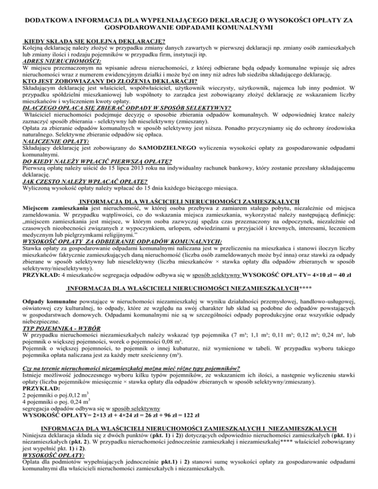 DODATKOWA INFORMACJA DLA WYPEŁNIAJĄCEGO DEKLARACJĘ O WYSOKOŚCI OPŁATY ZA GOSPODAROWANIE ODPADAMI KOMUNALNYMI KIEDY SKŁADA SIĘ KOLEJNĄ DEKLARACJĘ? Kolejną deklarację należy złożyć w przypadku zmiany danych zawartych w pierwszej deklaracji np. zmiany osób zamieszkałych lub zmiany ilości i rodzaju pojemników w przypadku firm, instytucji itp. ADRES NIERUCHOMOŚCI: W miejscu przeznaczonym na wpisanie adresu nieruchomości, z której odbierane będą odpady komunalne wpisuje się adres nieruchomości wraz z numerem ewidencyjnym działki i może być on inny niż adres lub siedziba składającego deklarację. KTO JEST ZOBOWIAZANY DO ZŁOŻENIA DEKLARACJI? Składającym deklarację jest właściciel, współwłaściciel, użytkownik wieczysty, użytkownik, najemca lub inny podmiot. W przypadku spółdzielni mieszkaniowej lub wspólnoty to zarządca jest zobowiązany złożyć deklarację ze wskazaniem liczby mieszkańców i wyliczeniem kwoty opłaty. DLACZEGO OPŁACA SIĘ ZBIERAĆ ODPADY W SPOSÓB SELEKTYWNY? Właściciel nieruchomości podejmuje decyzję o sposobie zbierania odpadów komunalnych. W odpowiedniej kratce należy zaznaczyć sposób zbierania - selektywny lub nieselektywny (zmieszany). Opłata za zbieranie odpadów komunalnych w sposób selektywny jest niższa. Ponadto przyczyniamy się do ochrony środowiska naturalnego. Selektywne zbieranie odpadów się opłaca. NALICZENIE OPŁATY: Składający deklarację jest zobowiązany do SAMODZIELNEGO wyliczenia wysokości opłaty za gospodarowanie odpadami komunalnymi. DO KIEDY NALEŻY WPŁACIĆ PIERWSZĄ OPŁATĘ? Pierwszą opłatę należy uiścić do 15 lipca 2013 roku na indywidualny rachunek bankowy, który zostanie przesłany składającemu deklarację. JAK CZĘSTO NALEŻY WPŁACAĆ OPŁATĘ? Wyliczoną wysokość opłaty należy wpłacać do 15 dnia każdego bieżącego miesiąca. INFORMACJA DLA WŁAŚCICIELI NIERUCHOMOŚCI ZAMIESZKAŁYCH Miejscem zamieszkania jest nieruchomość, w której osoba przebywa z zamiarem stałego pobytu, niezależnie od miejsca zameldowania. W przypadku wątpliwości, co do wskazania miejsca zamieszkania, wykorzystać należy następującą definicję: „miejscem zamieszkania jest miejsce, w którym osoba zazwyczaj spędza czas przeznaczony na odpoczynek, niezależnie od czasowych nieobecności związanych z wypoczynkiem, urlopem, odwiedzinami u przyjaciół i krewnych, interesami, leczeniem medycznym lub pielgrzymkami religijnymi.” WYSOKOŚĆ OPŁATY ZA ODBIERANIE ODPADÓW KOMUNALNYCH: Stawka opłaty za gospodarowanie odpadami komunalnymi naliczana jest w przeliczeniu na mieszkańca i stanowi iloczyn liczby mieszkańców faktycznie zamieszkujących daną nieruchomość (liczba osób zameldowanych może być inna) oraz stawki za odpady zbierane w sposób selektywny lub nieselektywny (liczba mieszkańców × stawka opłaty dla odpadów zbieranych w sposób selektywny/nieselektywny). PRZYKŁAD: 4 mieszkańców segregacja odpadów odbywa się w sposób selektywny WYSOKOŚĆ OPŁATY= 4×10 zł = 40 zł INFORMACJA DLA WŁAŚCICIELI NIERUCHOMOŚCI NIEZAMIESZKAŁYCH**** Odpady komunalne powstające w nieruchomości niezamieszkałej w wyniku działalności przemysłowej, handlowo-usługowej, oświatowej czy kulturalnej, to odpady, które ze względu na swój charakter lub skład są podobne do odpadów powstających w gospodarstwach domowych. Odpadami komunalnymi nie są w szczególności odpady poprodukcyjne oraz wszystkie odpady niebezpieczne. TYP POJEMNIKA - WYBÓR W przypadku nieruchomości niezamieszkałych należy wskazać typ pojemnika (7 m³; 1,1 m³; 0,11 m³; 0,12 m³; 0,24 m³, lub pojemnik o większej pojemności, worek o pojemności 0,08 m³. Pojemnik o większej pojemności, to pojemnik o innej kubaturze, niż wymienione w tabeli. W przypadku wyboru takiego pojemnika opłata naliczana jest za każdy metr sześcienny (m³). Czy na terenie nieruchomości niezamieszkałej można mieć różne typy pojemników? Istnieje możliwość jednoczesnego wyboru kilku typów pojemników, ze wskazaniem ich ilości, a następnie wyliczeniu stawki opłaty (liczba pojemników miesięcznie × stawka opłaty dla odpadów zbieranych w sposób selektywny/zmieszany). PRZYKŁAD: 2 pojemniki o poj.0,12 m3 4 pojemniki o poj. 0,24 m3 segregacja odpadów odbywa się w sposób selektywny WYSOKOŚĆ OPŁATY= 2×13 zł + 4×24 zł = 26 zł + 96 zł = 122 zł INFORMACJA DLA WŁAŚCICIELI NIERUCHOMOŚCI ZAMIESZKAŁYCH I NIEZAMIESZKAŁYCH Niniejsza deklaracja składa się z dwóch punktów (pkt. 1) i 2)) dotyczących odpowiednio nieruchomości zamieszkałych (pkt. 1) i niezamieszkałych (pkt. 2). W przypadku nieruchomości jednocześnie zamieszkałej i niezamieszkałej**** właściciel zobowiązany jest wypełnić pkt. 1) i 2). WYSOKOŚĆ OPŁATY: Oplata dla podmiotów wypełniających jednocześnie pkt.1) i 2) stanowi sumę wysokości opłaty za gospodarowanie odpadami komunalnymi dla właścicieli nieruchomości zamieszkałych i niezamieszkałych. OBJAŚNIENIA: * pierwszą deklarację o wysokości opłaty za gospodarowanie odpadami komunalnymi należy złożyć do 28 lutego 2013 roku; ** w przypadku zmiany danych zawartych w złożonej deklaracji będących podstawą ustalenia wysokości należnej opłaty za gospodarowanie odpadami komunalnymi lub określonej w deklaracji ilości odpadów komunalnych powstających w danej nieruchomości, właściciel nieruchomości jest obowiązany złożyć do Wójta/Burmistrza Gminy nową deklarację uwzględniającą zmianę w terminie 14 dni od dnia wystąpienia zmian; *** składający deklarację – to właściciel, współwłaściciel, użytkownik wieczysty, najemca, użytkownik oraz jednostki organizacyjne i osoby posiadające nieruchomości w zarządzie lub użytkowaniu, a także inne podmioty władające nieruchomością oraz w przypadku zabudowy wielorodzinnej zarządca nieruchomości wspólnej lub inny podmiot władający nieruchomością; **** nieruchomość ni