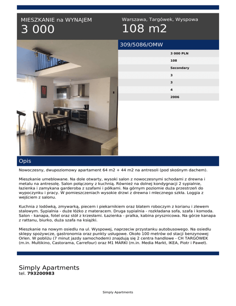 MIESZKANIE na WYNAJEM 3 000 Warszawa, Targówek, Wyspowa 108 m2 309/5086/OMW 3 000 PLN 108 Secondary 3 3 4 2006 Opis Nowoczesny, dwupoziomowy apartament 64 m2 + 44 m2 na antresoli (pod skośnym dachem). Mieszkanie umeblowane. Na dole otwarty, wysoki salon z nowoczesnymi schodami z drewna i metalu na antresolę. Salon połączony z kuchnią. Również na dolnej kondygnacji 2 sypialnie, łazienka i zamykana garderoba z szafami i półkami. Na górnym poziomie duża przestrzeń do wypoczynku i pracy. W pomieszczeniach wysokie drzwi z drewna i mlecznego szkła. Loggia z wejściem z salonu. Kuchnia z lodówką, zmywarką, piecem i piekarnikiem oraz blatem roboczym z korianu i zlewem stalowym. Sypialnia - duże łóżko z materacem. Druga sypialnia - rozkładana sofa, szafa i komoda. Salon - kanapa, fotel oraz stół z krzesłami. Łazienka - pralka, kabina prysznicowa. Na górze kanapa z rattanu, biurko, duża szafa na książki. Mieszkanie na nowym osiedlu na ul. Wyspowej, naprzeciw przystanku autobusowego. Na osiedlu sklepy spożywcze, gastronomia oraz punkty usługowe. Około 100 metrów od stacji benzynowej Orlen. W pobliżu (7 minut jazdy samochodem) znajdują się 2 centra handlowe - CH TARGÓWEK (m.in. Multikino, Castorama, Carrefour) oraz M1 MARKI (m.in. Media Markt, IKEA, Piotr i Paweł). Simply Apartments tel. 793200983 Simply Apartments email: [email protected] Simply Apartments Powered by TCPDF (www.tcpdf.org)