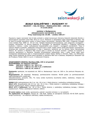 BIAŁE SZALEŃTWO – RUSZAMY !!! WŁOCHY – VAL DI SOLE – MARILLEVA 900 – 150 km 4-13.03.2016 autokar z Bydgoszczy ubezpieczenie narciarskie w cenie Przy rezerwacji do 15.09. - zniżka 100 zł ! Popularny region narciarski Val di Sole wchodzi w skład konsorcjum Skirama Dolomiti Adamello Brenta z dominującym szczytem Cima Palu 3013 m n.p.m. Położone w zachodniej części Dolomitów di Brenta. Val di Sole to przede wszystkim znane w Polsce stacje narciarskiei: Marilleva 900-1400 i Folgarida (Uwaga! nowa kolejka Pejo 3000 ok. 30 km tras. Kolejka Daolaso/Commezzadura), jest połączona wyciągami i trasami narciarskim ze słynną Madonną di Campiglio. W zabudowie Marillevy i Folgaridy dominują budowle z betonu i szkła, wybudowane bezpośrednio przy trasach i wyciągach narciarskich. Trasy o różnym stopniu trudności, większość wytyczona jest w lesie, dzięki czemu jazda jest bardzo urozmaicona. Atrakcją jest centrum uzdrowiskowe w Pejo z basenem, położone już na terenie Parku Narodowego Stelvio. Po nartach w Marilleva 900 można grać w tenisa na krytych kortach i jeździć na łyżwach w centrum sportowym w Mezzana. Ponadto przyhotelowe restauracje, bary i puby. Duża część bazy noclegowej zlokalizowana jest w miejscowościach wzdłuż Doliny Słońca w Dimaro, Male, czy Pellizzano, skąd można dojechać do dolnej stacji gondolki w Marilleva 900 lub w Daoloso, bezpłatnym skibusem lub do Przełęczy Tonale 1883 m n.p.m. z Lodowcem Presena. APARTAMENTY KRISTAL Marilleva 900, 100 m od gondoli WYŻYWIENIE: we własnym zakresie CENA: 200 Euro +500 zł / os. bilo 4 os. 215 Euro + 500 zł /os. bilo 4 os. z balkonem 250 Euro + 500 zł/ os. mono 2 Położenie: spokojne, na wysokości ok. 900 m. Restauracje i bary ok. 200 m. Do centrum Mezzany ok. 900 m. Wyposażenie: 38 mieszkań. Recepcja, pomieszczenie klubowe. WLAN gratis (w pomieszczeniach ogólnodostępnych), pokój gier. Zakwaterowanie: prysznic, WC, TV, nowy aneks kuchenny (kuchenka elektr., lodówka), miejsce do spożywania posiłków. MONO 2/3: jednopokojowe dla 2 os. (ok. 20 m kw.). Pokój dzienny z podwójną rozkładaną kanapą. BILO 4/5: dwupokojowe dla 4-5 os. (ok. 35 m kw.). Pokój dzienny z podwójną rozkładaną kanapą i łóżkiem pojedynczym. Pokój z łóżkiem piętrowym. BILO 4/5 z balkonem: (ok. 40 m kw.). Pokój dzienny z podwójną rozkładaną kanapą i łóżkiem pojedynczym. Pokój z podwójnym łóżkiem, balkon. W cenie najmu: prąd, woda, ogrzewanie, pościel i ręczniki (zmiana 1 x na tydzień). Do zapłacenia na miejscu: kaucja ok. 100 EUR. Opłata za sprzątanie końcowe 40-45 EUR (oprócz wnęki kuchennej – we własnym zakresie), opłata klimatyczna. TOMIGROUP Barbara Cichowicz ul. Gdańska 139, 85-022 Bydgoszcz www.salonwakacji.pl, www.salonrejsow.pl Nr wpisu do Rejestru Organizatorów Turystyki i Pośredników Turystycznych: 257 Nr konta mbank PLN - 31 1140 2004 0000 3102 7519 9717 Nr konta mbank EURO – PL 17 1140 2004 0000 3212 0304 7503,SWIFT:BREXPLPWMBK HOTEL SPORTING RAVELLI 3,5* Marilleva 900, 50 m od gondoli WYŻYWIENIE: 2 posiłki CENA: 450 Euro + 500 zł / os. Położenie: na wysokości ok. 900 m n.p.m., w Marilleva 900, w popularnym regionie Val di Sole we włoskim Trydencie. Do centrum miejscowości Mezzana ok. 800 m. Wyciągi narciarskie: do gondoli Marilleva 900 - ok. 50 m, łączącej z trasami i wyciągami Skiarea Campiglio Dolomiti di Brenta (Folgarida-Marilleva-Madonna di Campiglio-Pinzolo). Przystanek skibusa (gratis) w odległości 50 m. Do regionu Adamello Ski (Tonale-Lodowiec Presena-Ponte di Legno) ok. 20 km. Wyposażenie: recepcja, winda, restauracja, bar, sala TV, przechowalnia sprzętu narciarskiego, parking (gratis), garaż (płatny 5 euro/dzień; nie ma możliwości wcześniejszej rez. miejsc). Hotel posiada 3 piętra. Sport i relaks Centrum Wellness Le Reve: bezpłatna część basenowa (czynna w godz. 8.3019.00) z basenem dla dzieci, basenem dla dorosłych i jacuzzi oraz część spa (czynna 15.30-19.00) z sauną rzymską, sauną fińską, łaźnią parową, prysznicem aromaterapeutycznym oraz część płatna (czynna na zapytanie) - masaże, zabiegi kosmetyczne. Miniclub dla dzieci w wieku 4-14 lat (czynny 9.3012.00 i 15.30-19.00, animacje w jęz. włoskim i angielskim, gratis). Codziennie w godz. popołudniowych słodki poczęstunek dla dzieci. Pokoje: hotel dysponuje 52 dwuosobowymi pokojami z możliwością dwóch dostawek. Pokoje classic: ok. 16 m2; Łazienka z WC, suszarka do włosów; TV-sat, telefon, sejf. Bezpłatny dostęp do internetu, przechowalnia sprzętu w hotelu, bezpłatny wstęp do strefy wellness. Wyżywienie: śniadania w formie bufetu i ciepłe kolacje podawane przez kelnera (wybór z menu). Napoje do kolacji dodatkowo płatne. Dostępne menu dla dzieci. Cena zawiera: • • • • • • zakwaterowanie 7 nocy w wybranym obiekcie 2 posiłki dziennie przy wyborze hotelu przejazd komfortowym autokarem z Bydgoszczy – Szubina - Poznania wyposażonym w WC, barek, TV opiekę licencjonowanego pilota – animatora podstawowe ubezpieczenie narciarskie KL do 10.000 Euro z OC do 10.000 Euro wieczorki animacyjne i super atmosfera Cena nie zawiera: • skipassu • wyżywienia w przypadku apartamentów • Kaucji zwrotnej za apartament • ubezpieczenia od chorób przewlekłych • ubezpieczenia od kosztów rezygnacji • taksy klimatycznej do opłaty na miejscu SKIPASS MARILLEVA - FOLGARIDA SKIPASS SUPERSKIRAMA 173 Euro / dorośli 146 Euro / junior ur. po 30.11.1998 121 Euro / senior ur. przed 30.11.1949 Gratis / dzieci ur po 30.11.2007 235 Euro / dorośli 165 Euro / junior ur. po 30.11.1998 212 Euro / senior ur. przed 30.11.1949 Gratis / dzieci ur po 30.11.2007 Zapraszamy ! Maja Jankowska [email protected] tel. 885 402 773 Natalia Miesikowska [email protected] tel. 723 402 772 Aneta Gonerska [email protected] tel. 665 402 772 Basia Cichowicz [email protected] tel. 609 375 444 TOMIGROUP Barbara Cichowicz ul. Gdańska 139, 85-022 Bydgoszcz
